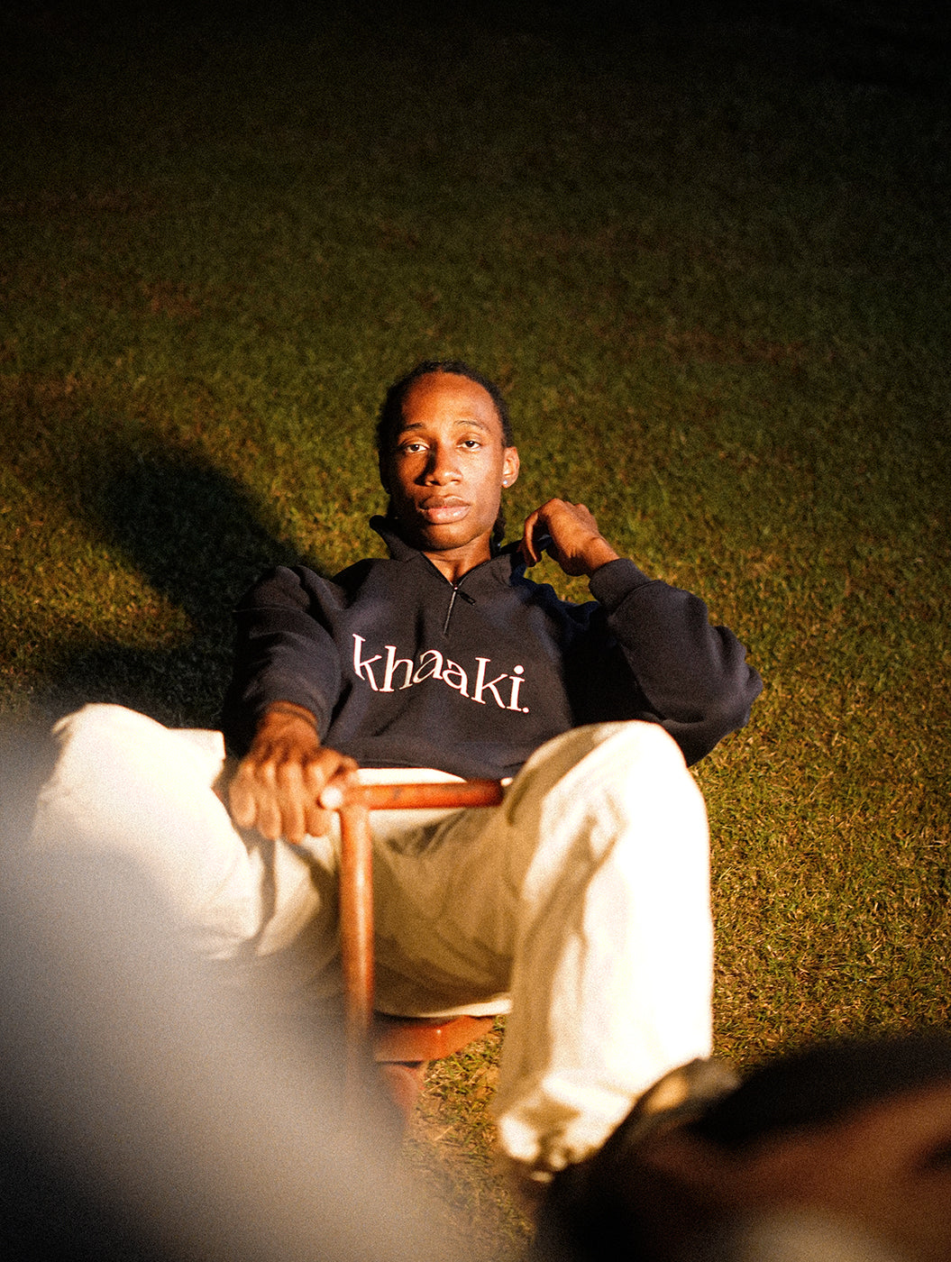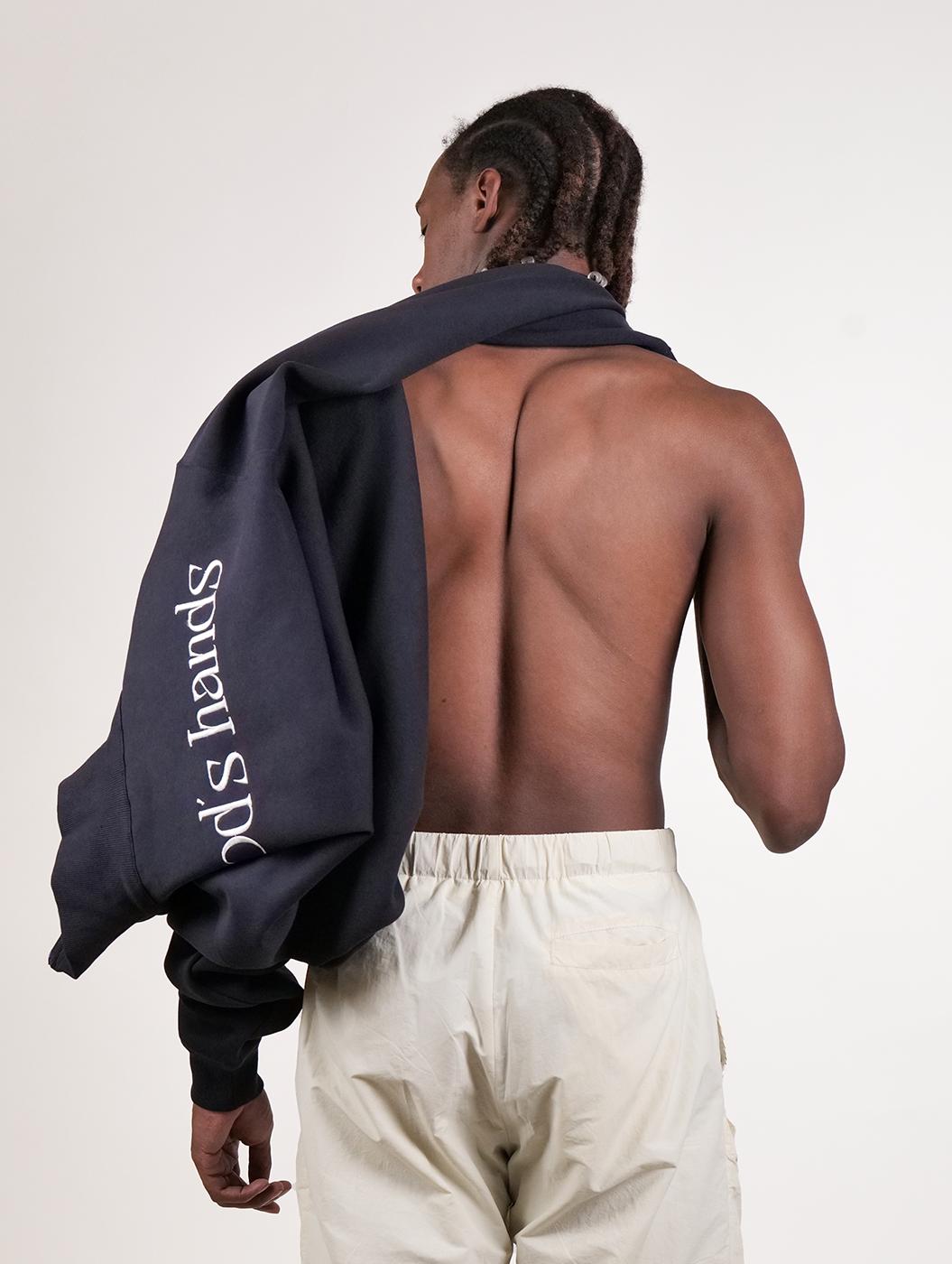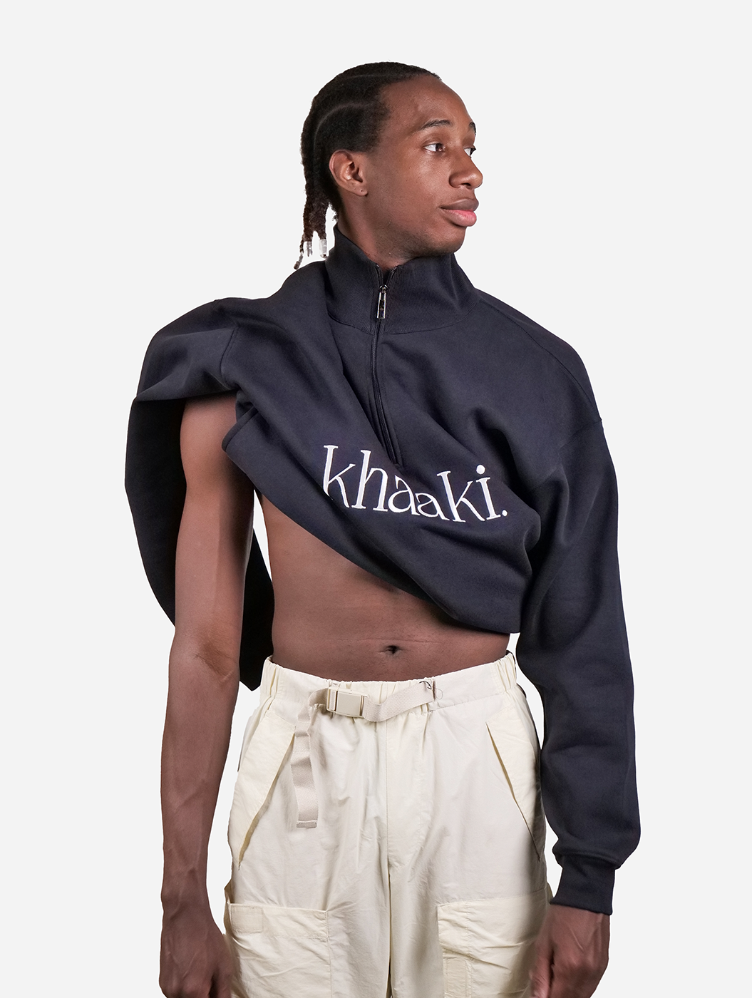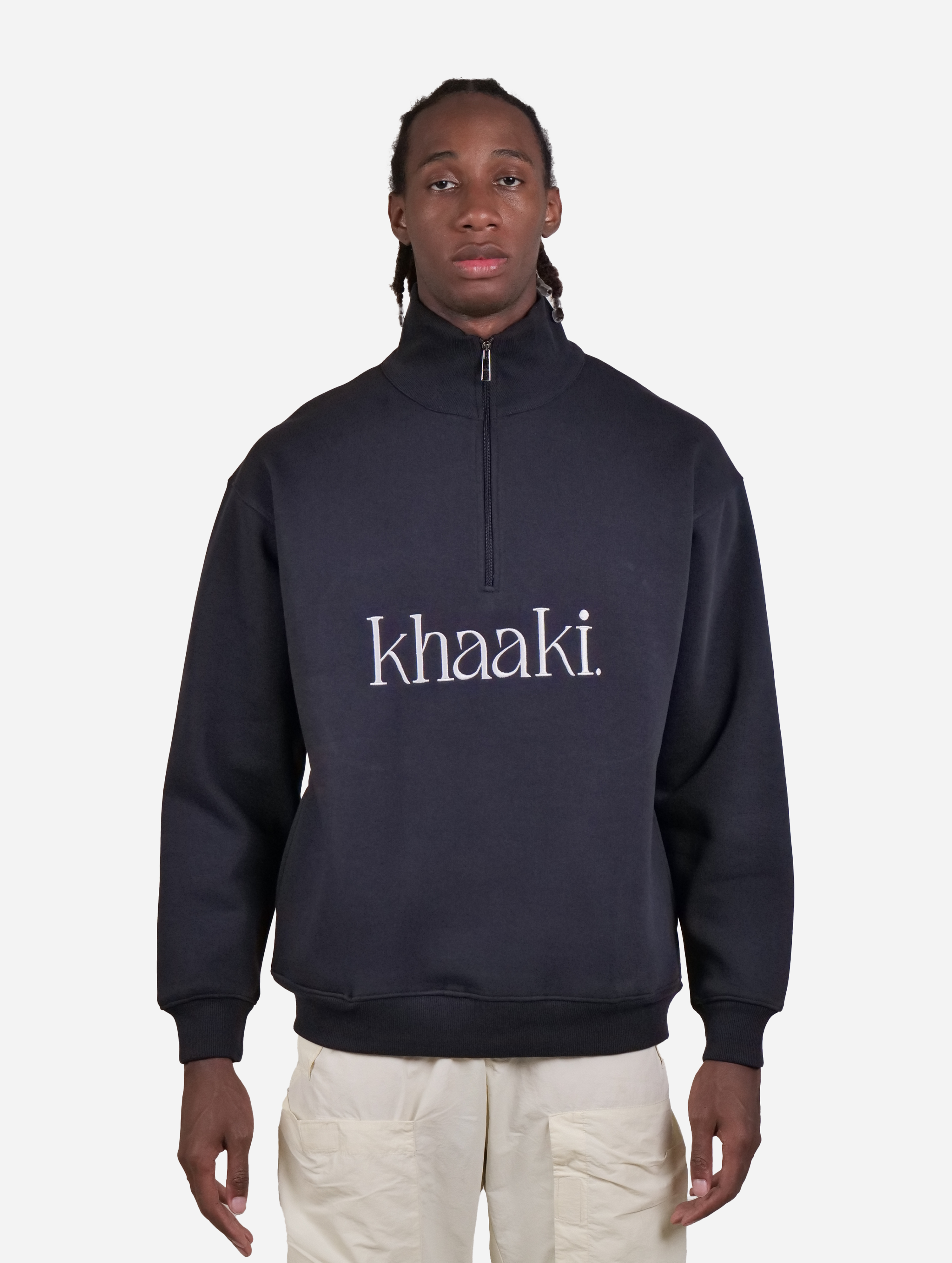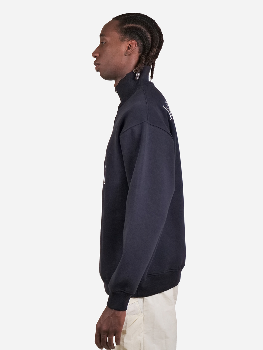 This high-neck quarter-zip sweatshirt features intricate typographic embroidery on the front and back for a sleek, modern look. With a comfortable, relaxed fit that drapes smoothly, it combines a cool aesthetic with cozy practicality, making it ideal for outings, casual days, or laid-back adventures.