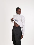 This high-neck quarter-zip sweatshirt features intricate typographic embroidery on the front and back for a sleek, modern look. With a comfortable, relaxed fit that drapes smoothly, it combines a cool aesthetic with cozy practicality, making it ideal for outings, casual days, or laid-back adventures.