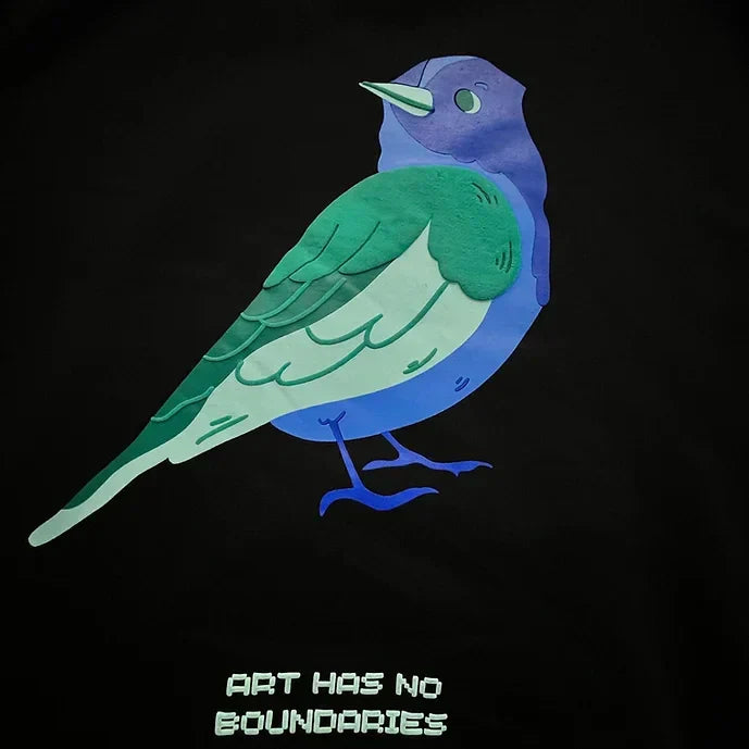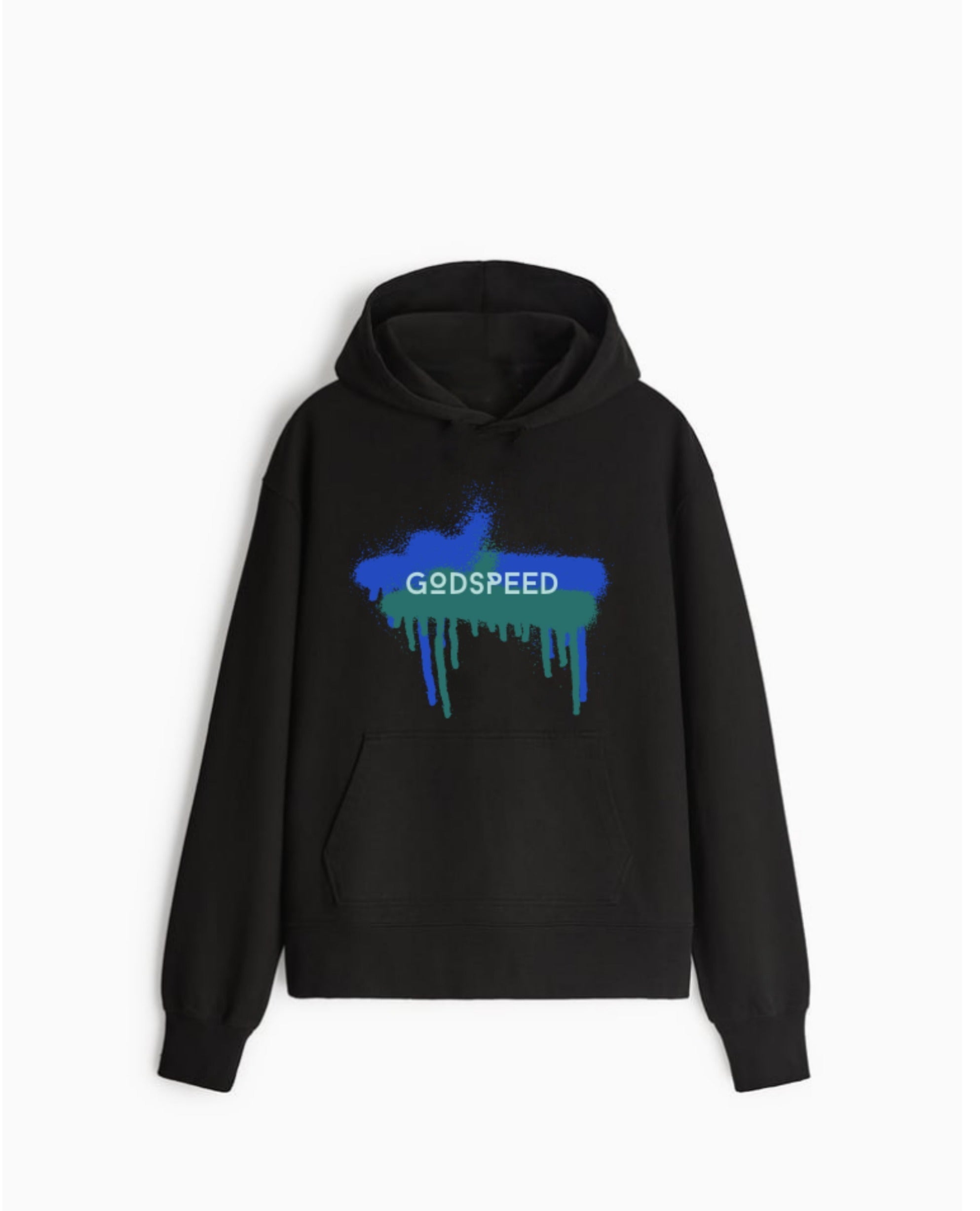 Full sleeves hoodie in black cotton fleece with Godspeed paint script at the front and feathered friend at the back. Relaxed fit