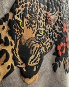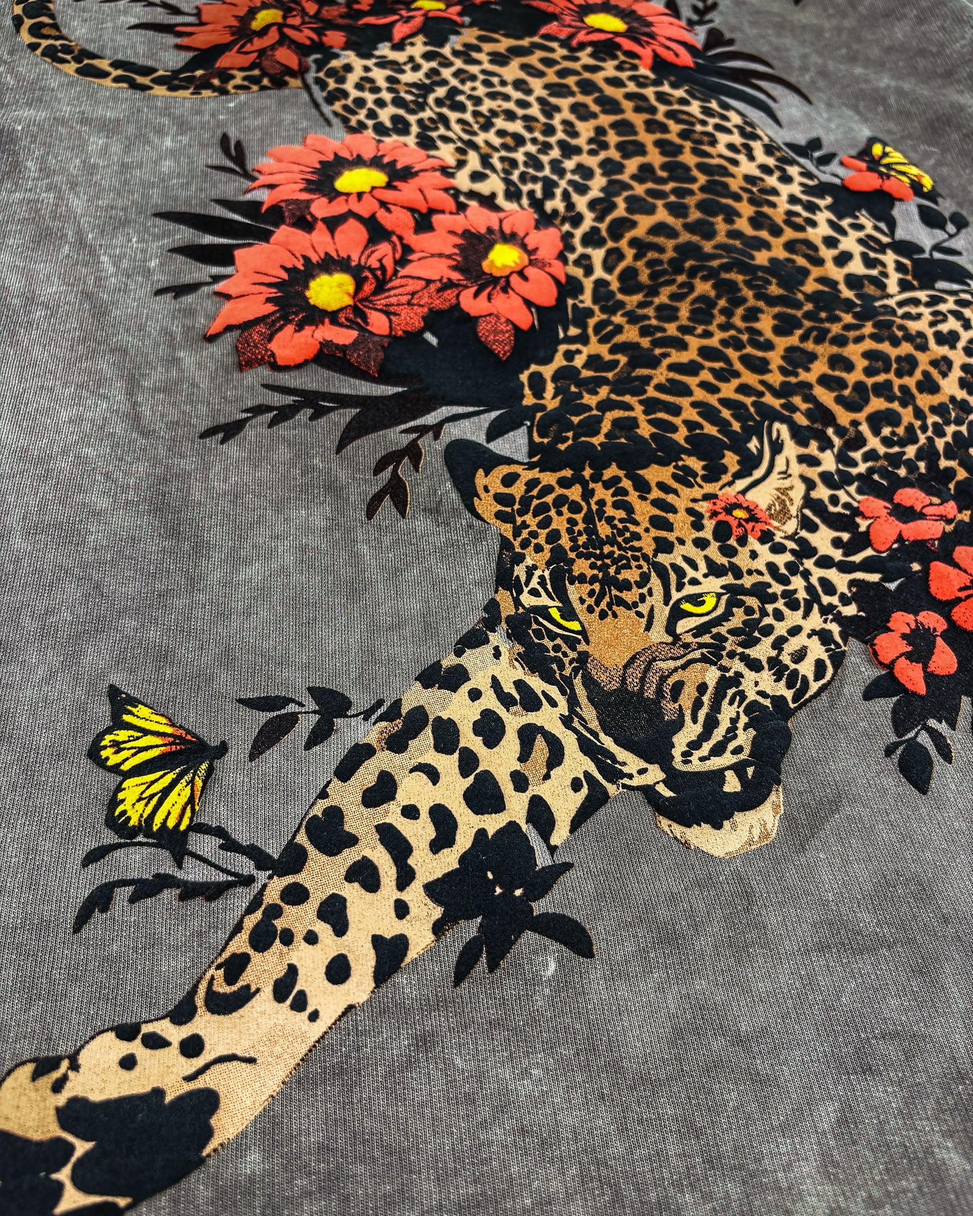 The back features a bold leopard graphic entwined with vibrant florals and butterflies, symbolizing strength balanced with grace. A true statement graphic t shirt, it blends animal print with artistic detail for a head-turning streetwear aesthetic.