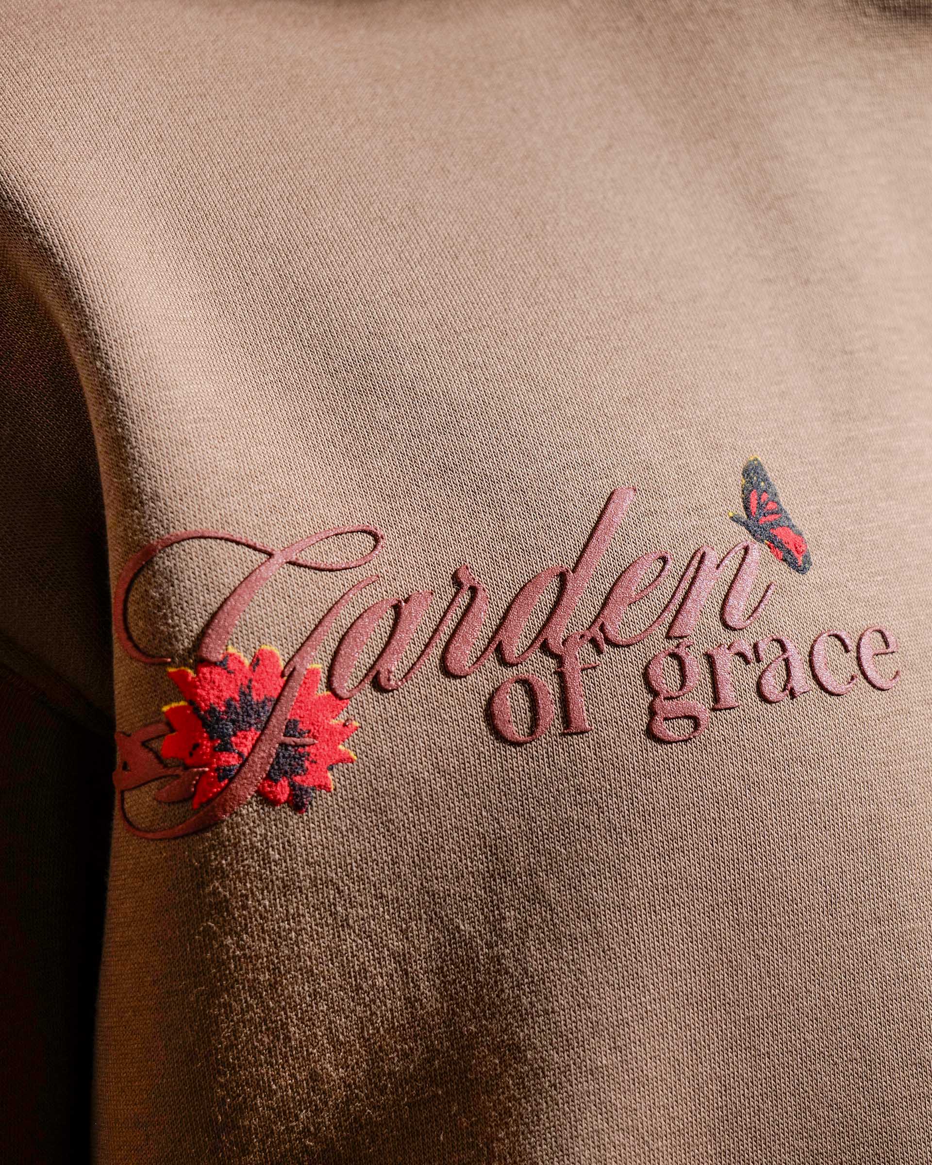 The Graceful Might Hoodie features an oversized fit and heavyweight cotton fleece construction. The back artwork is executed using detailed puff printing with a specialised technique to increase print height. The front graphic uses a combination of puff and raised high-density print. Ribbed hems support structure and durability.