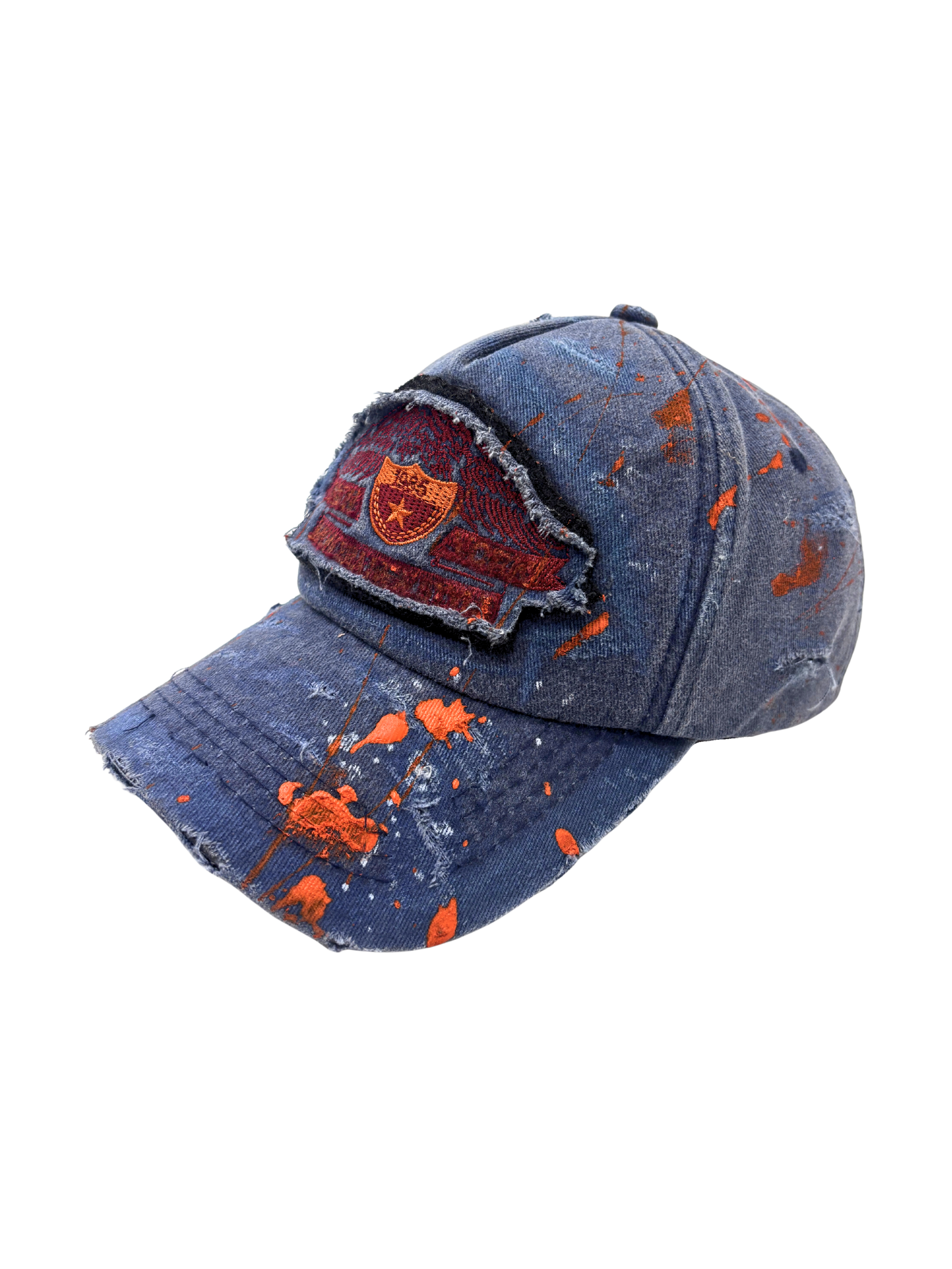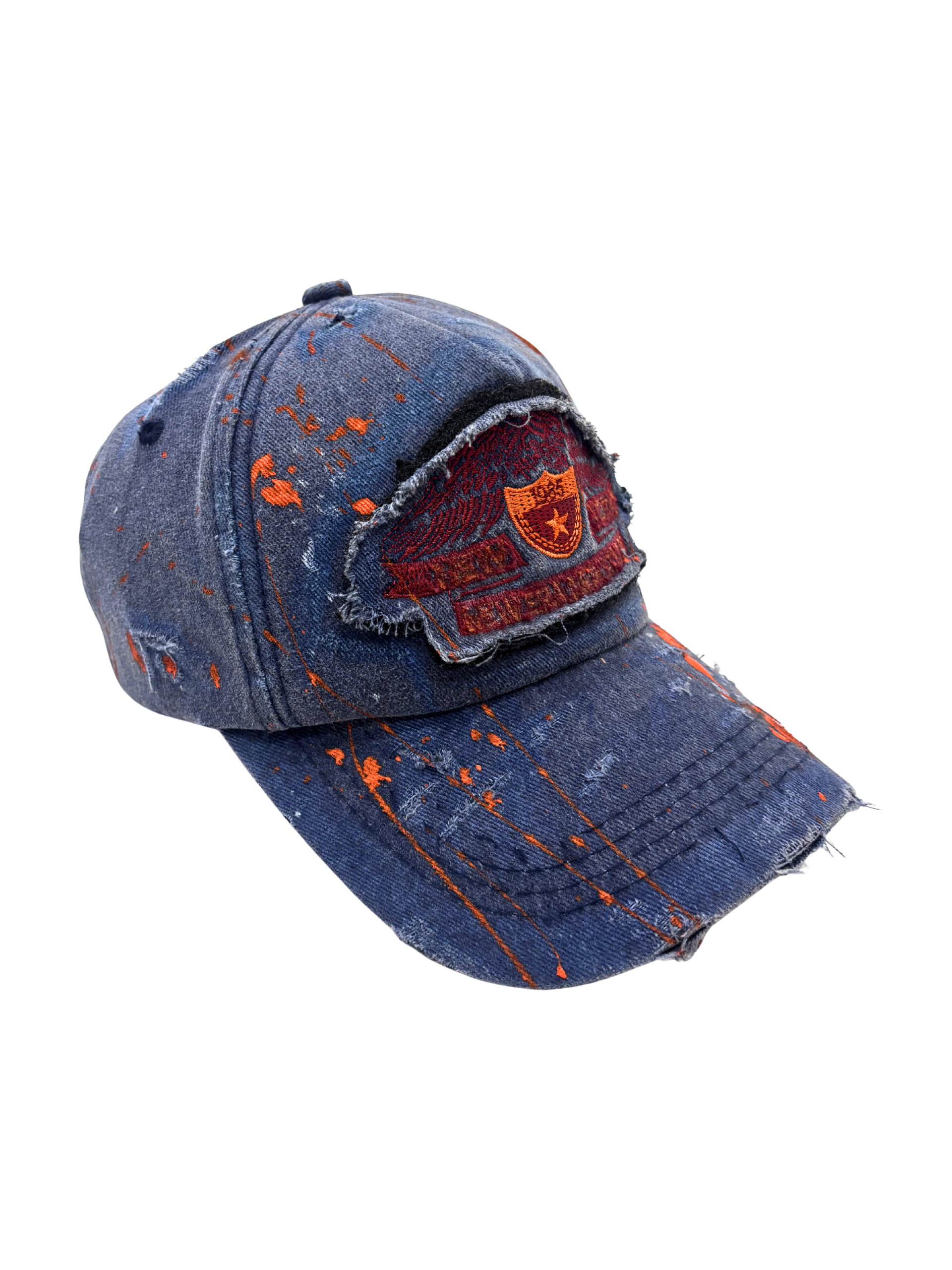 Born from the streets, this cap is rebellion sprayed loud. Hand-distressed denim, torn patchwork, and explosive orange splatters make it look like it came straight out of a back-alley riot. Every mark is intentional chaos, every rip a scar of defiance.