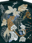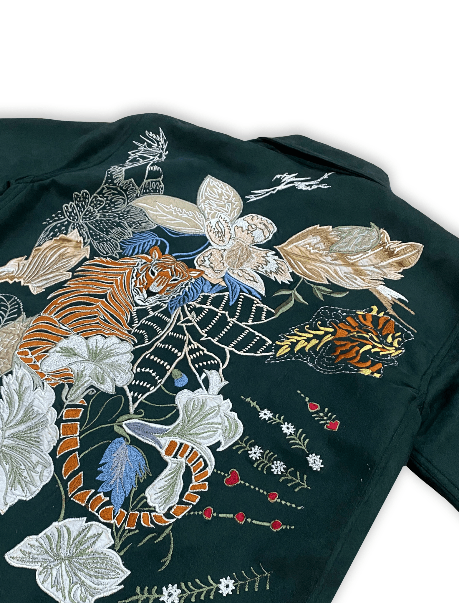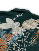 Green Forest Jacket, a masterpiece of wearable art. Featuring original forest-inspired artwork, fully embroidered on both front and back, this jacket blends craftsmanship with bold visual storytelling. The soft crepe lining ensures comfort, while the premium suede outer adds a luxurious edge to its rugged statement.