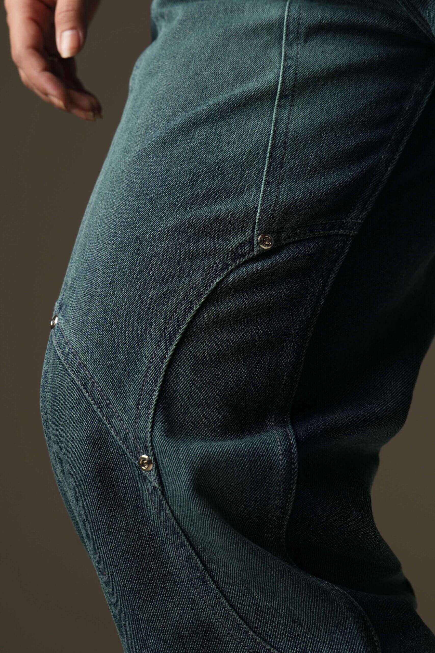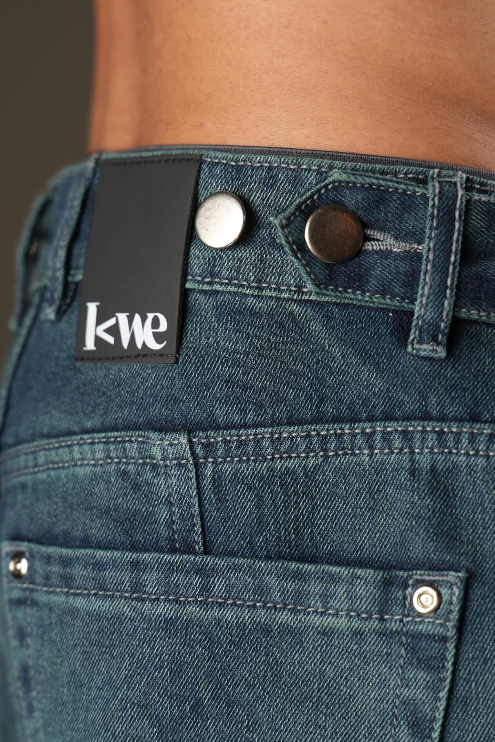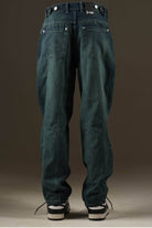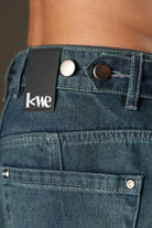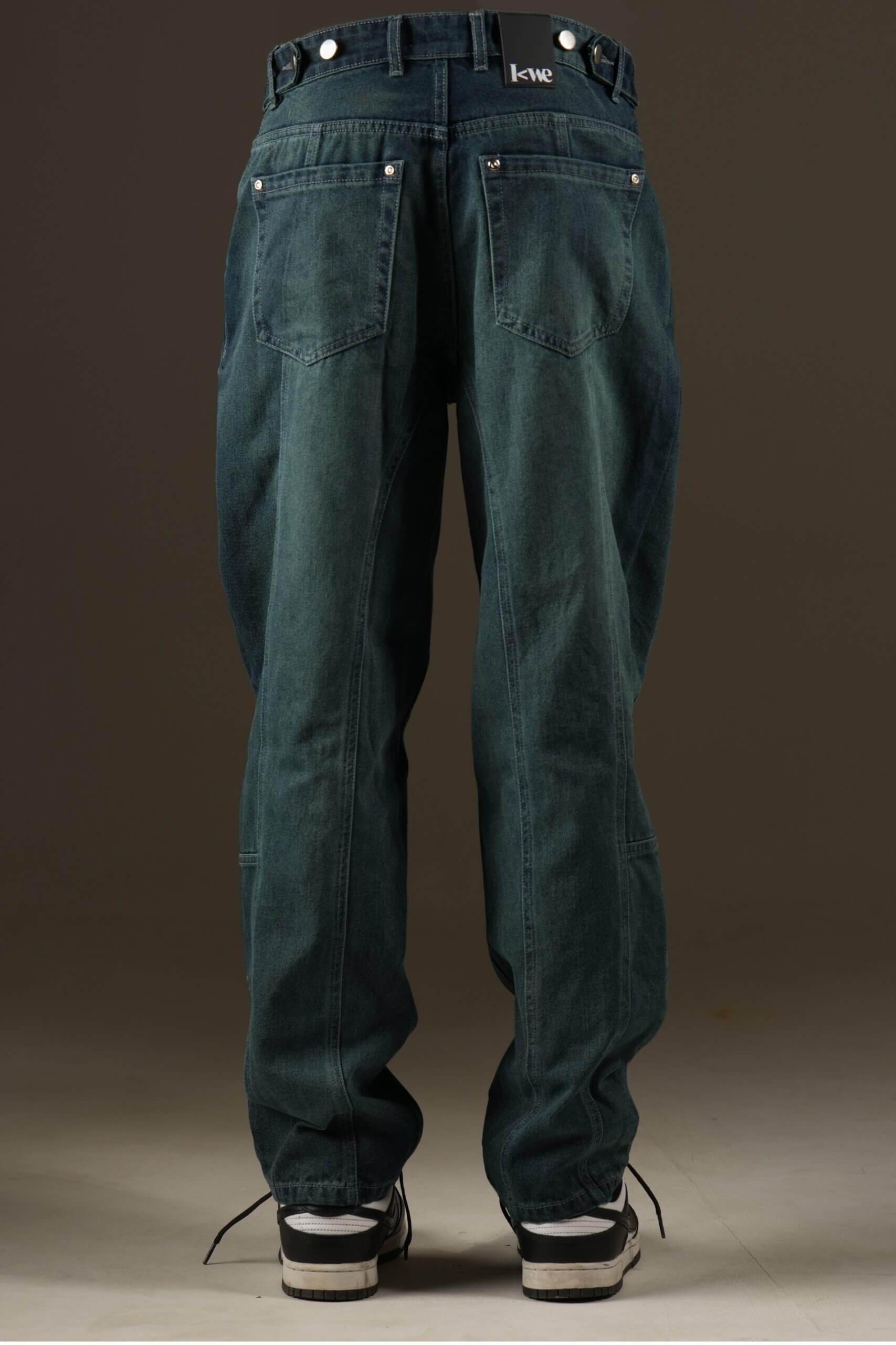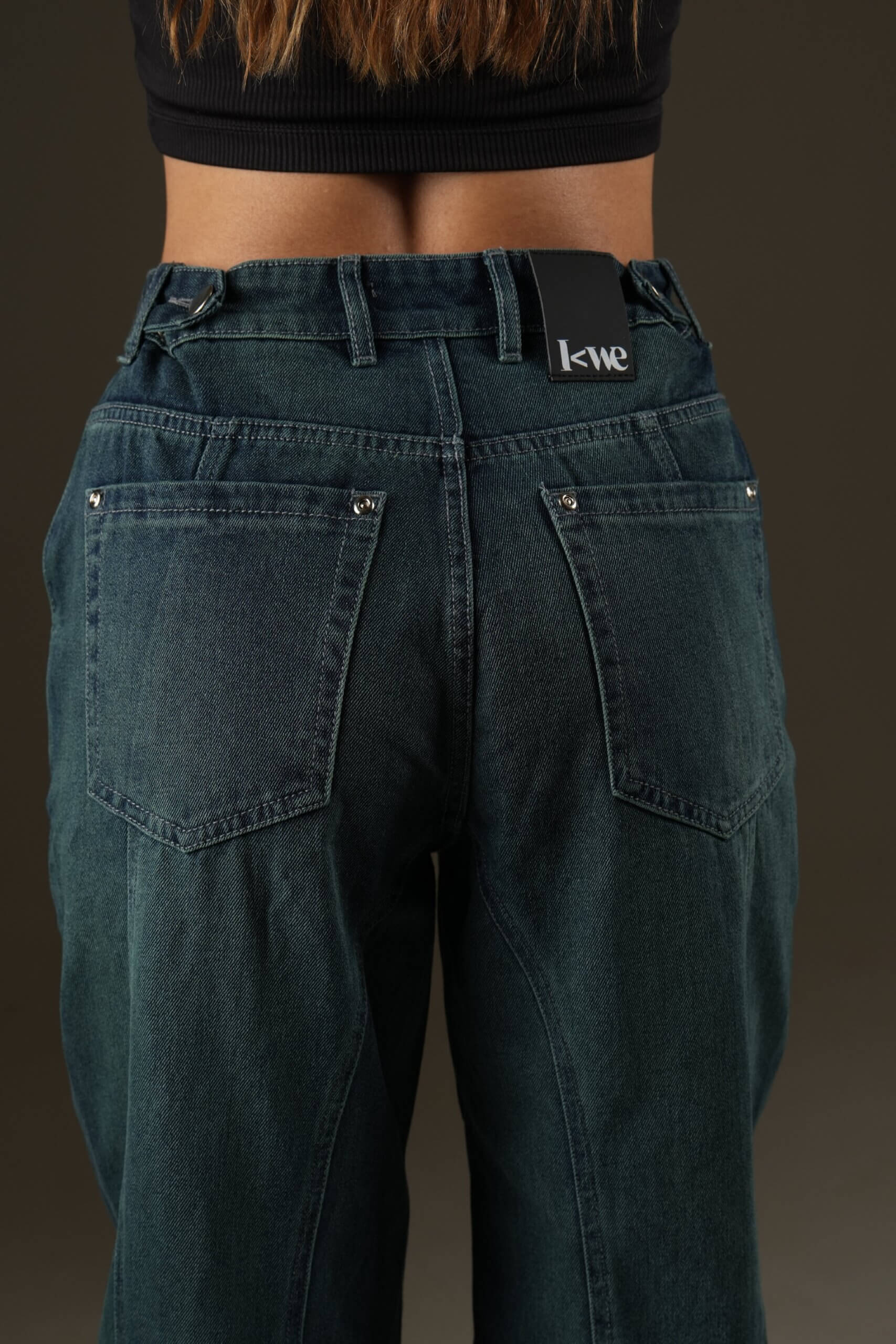 Washed Green Panelled Pant, crafted from soft, sustainable organic cotton. These straight-fit pants feature thoughtfully designed panels that create striking style lines, ensuring a flattering silhouette. Rivet details at the seams add a modern touch, making these pants a standout piece.
