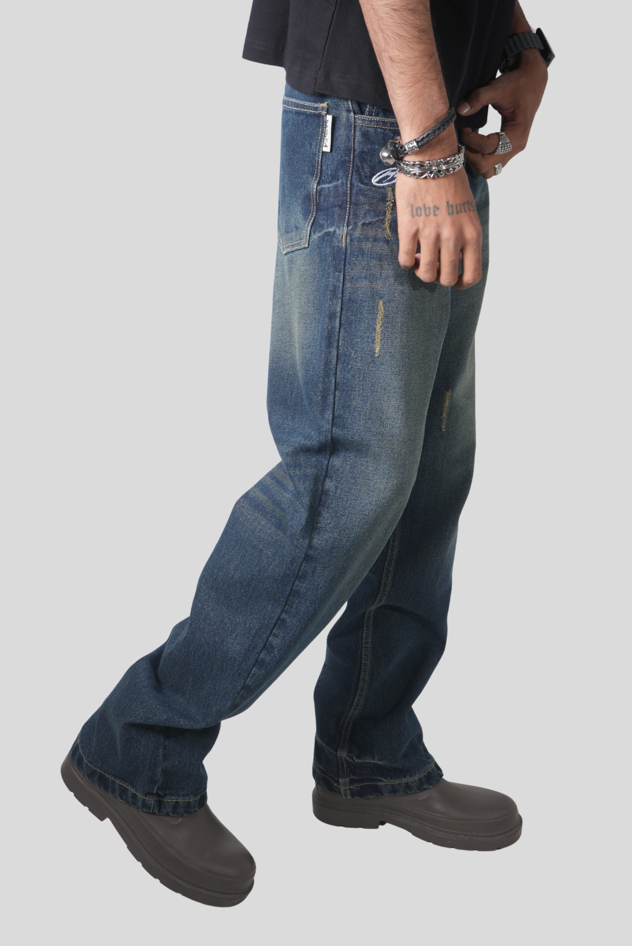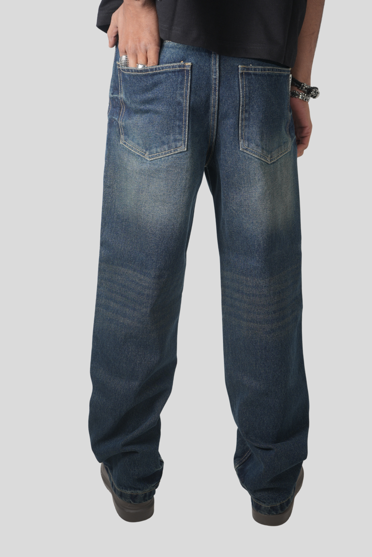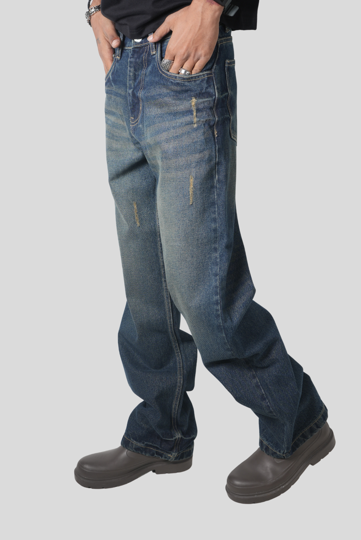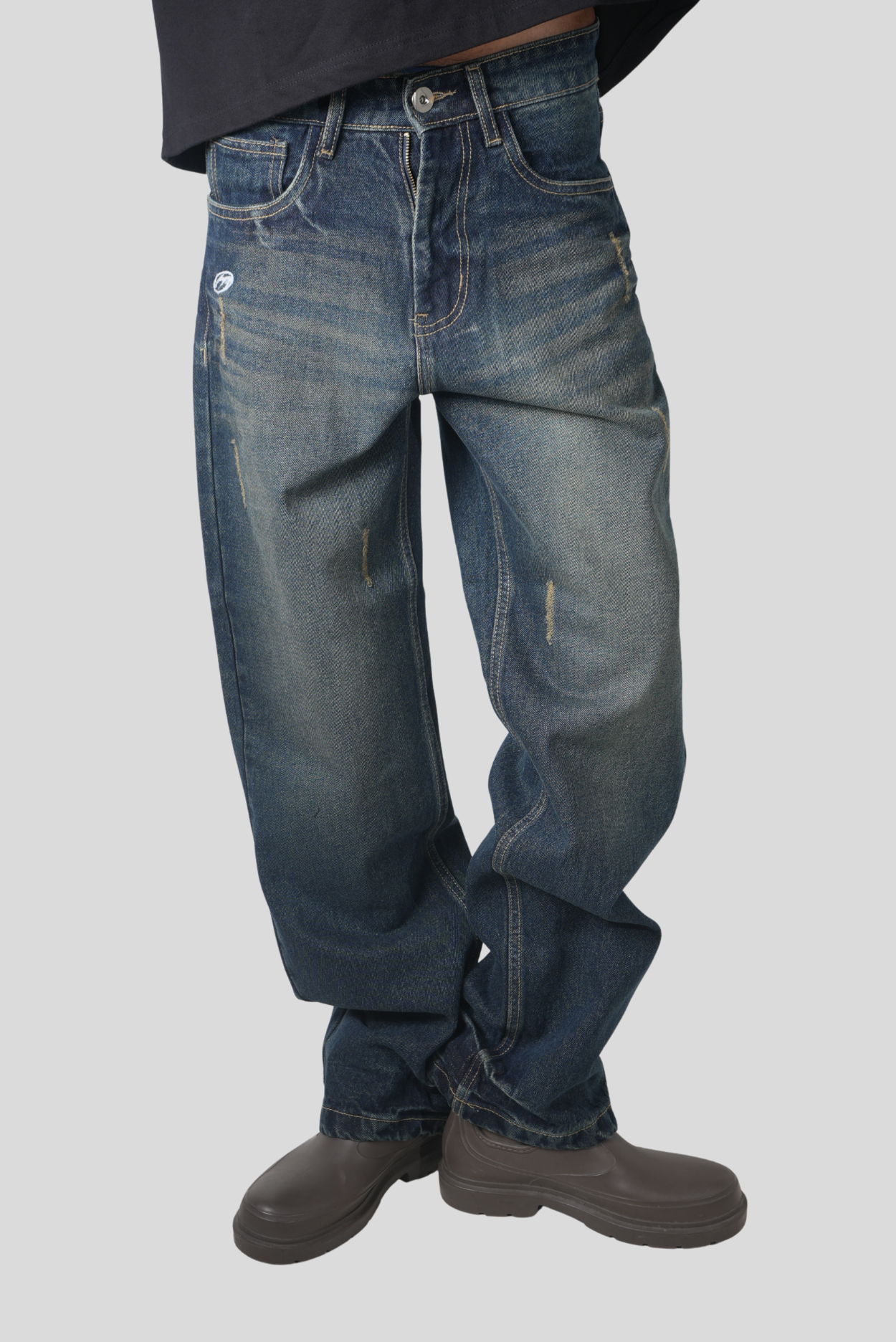 Premium heavyweight denim with a rich indigo wash and fade treatment