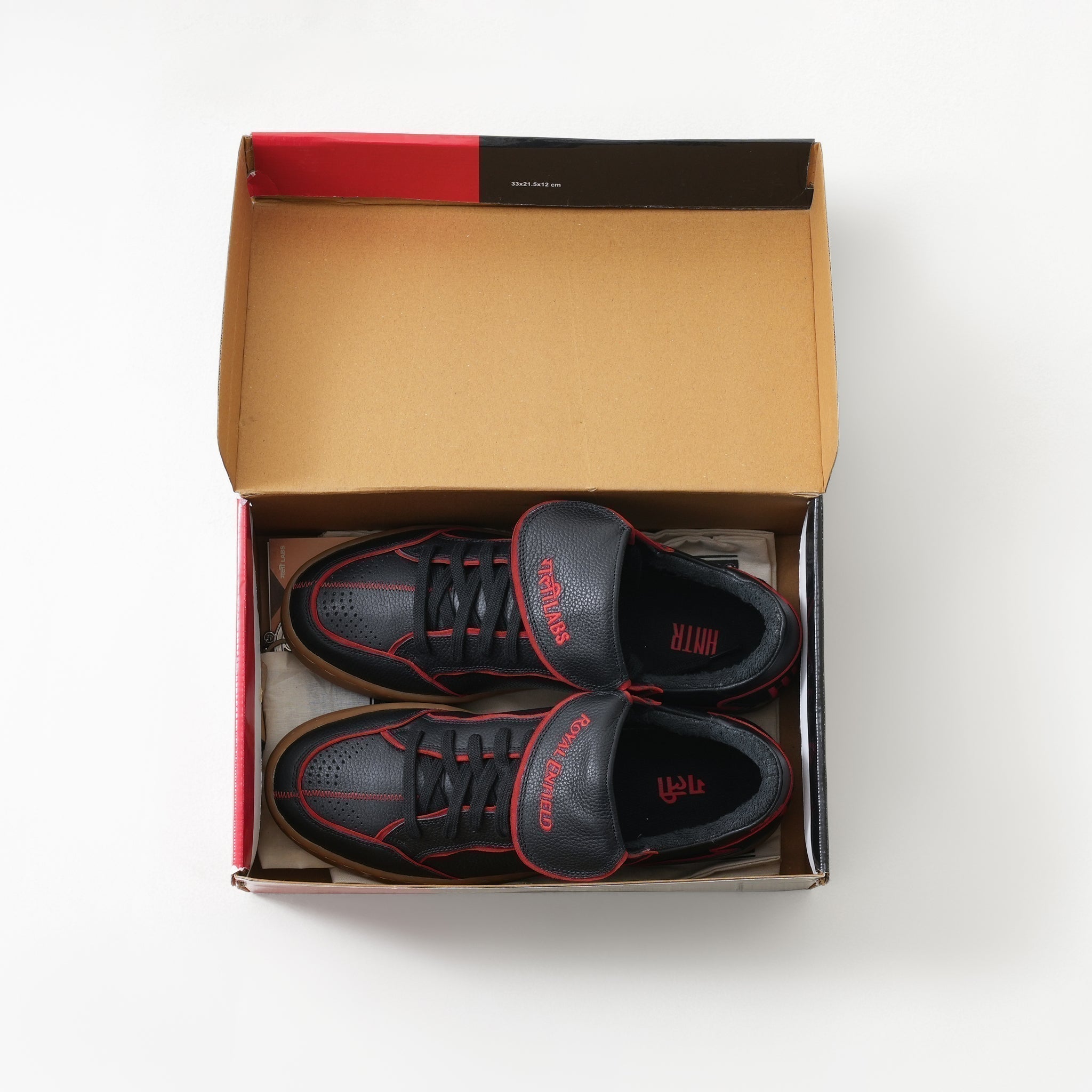 Inspired by the Royal Enfield DNA, the Kaalshire UK mirrors the blackout build of the Hunter 350 London Edition with all black leather and red detailing.