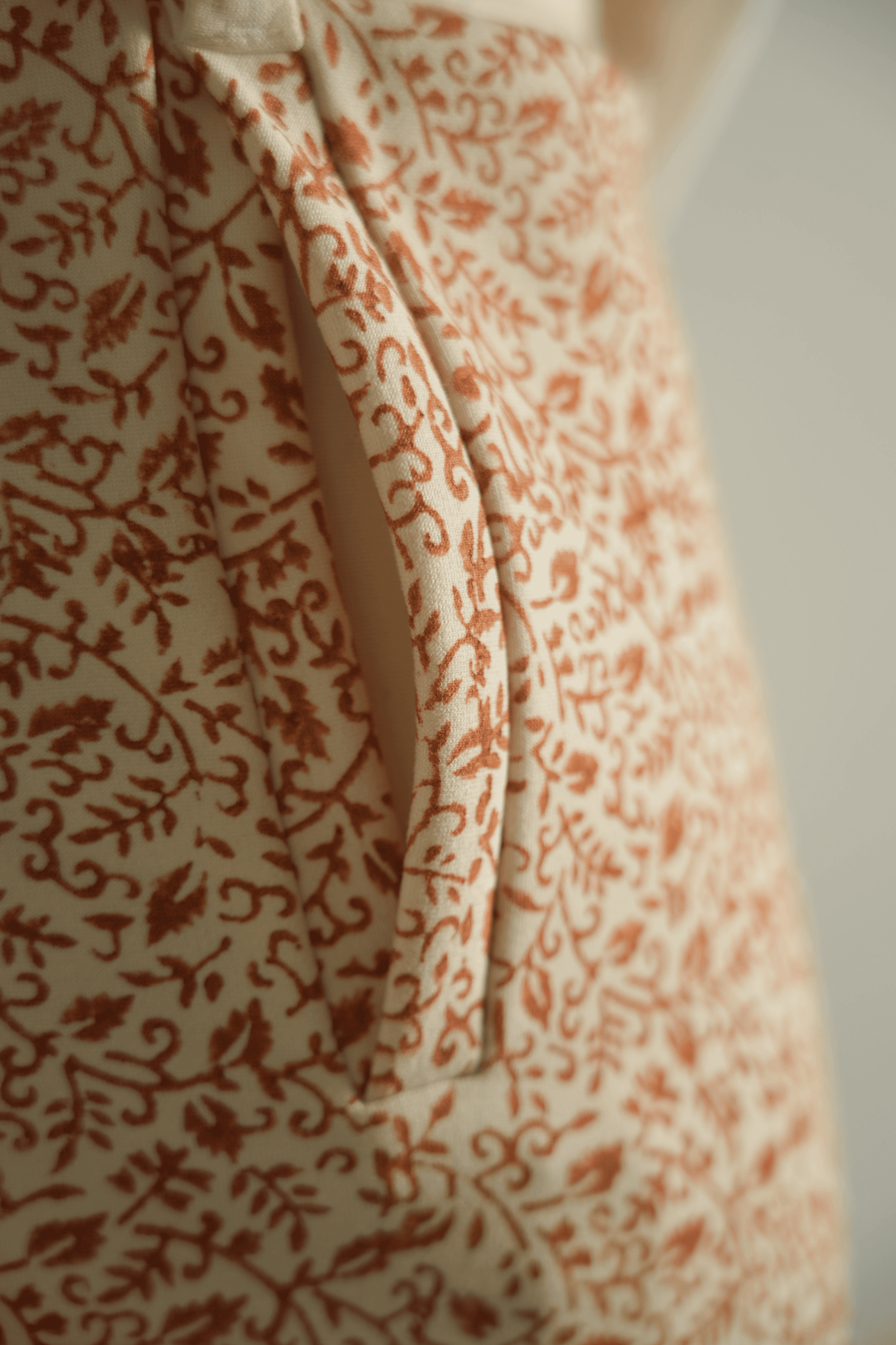 pants boast a handmade block print in vibrant brown along the sides. Perfect for adding a