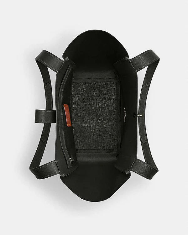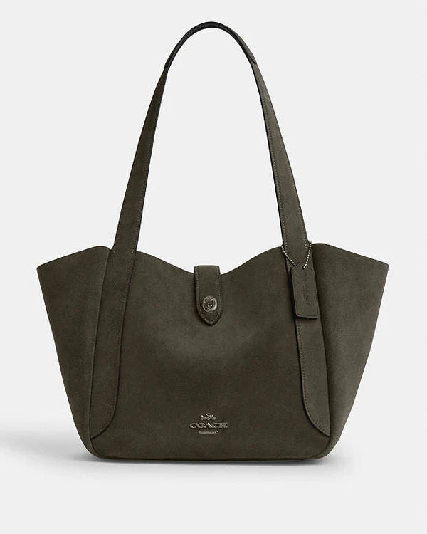 The Coach Hadley Turnlock Tote Bag in suede features a rich Army Green shade paired with a signature turnlock closure for secure access. Its spacious interior accommodates daily essentials effortlessly, while the soft suede offers an elevated tactile experience. Combining functionality with understated luxury, this tote is perfect for those seeking a refined, versatile accessory.