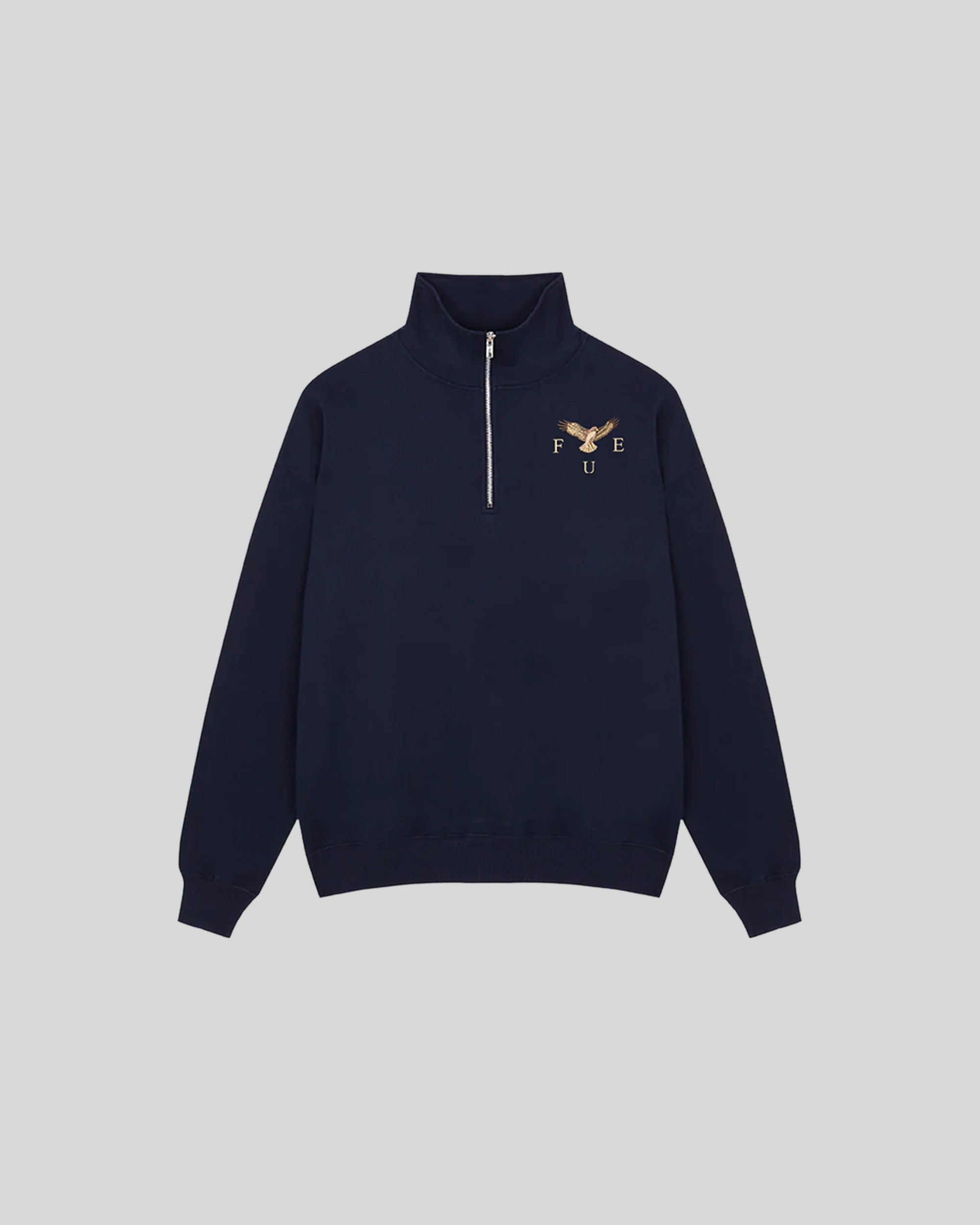 Stay sharp and grounded in the Flight Quarter Zip for men. This navy essential features a bold golden eagle graphic and “FUE†lettering at the chest. With its sleek zip-up collar, it’s the perfect blend of comfort and confidence.