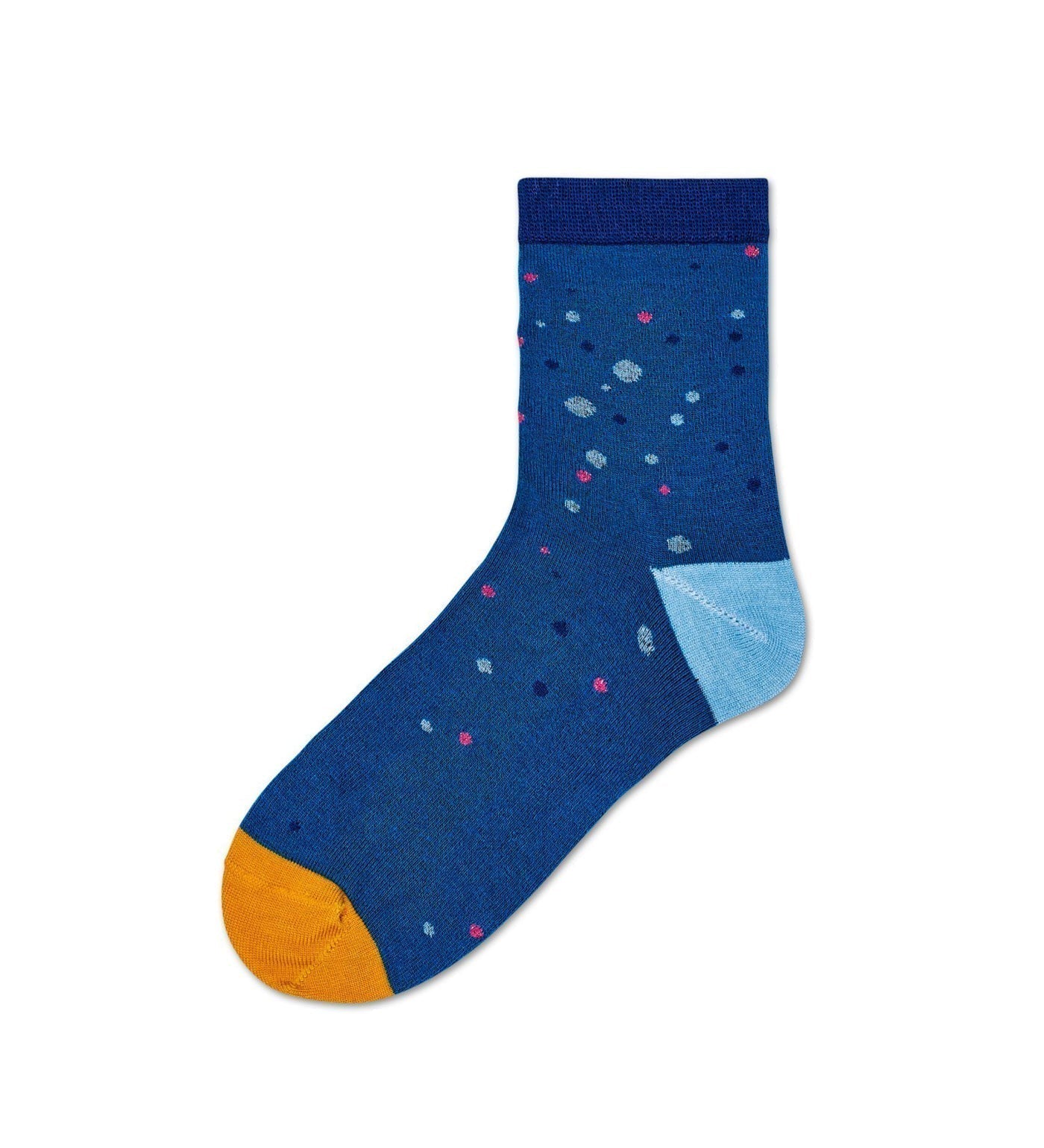 Discover vibrant socks for women with unique painted splatter spots in pale blue, pomegranate orange, and black on a deep blue background, perfect for adding fun to your wardrobe. Crafted by Happy Socks' talented team, these ankle socks combine comfort, durability, and bold design, making them ideal as casual or expressive ankle length socks. Made from a soft cotton blend of 75% Viscose, 22% Polyamide, and 3% Elastane, they deliver an airy, comfortable feel suitable for everyday wear. Reinforced heel and toe ensure long-lasting durability, while a hidden sunshine yellow toe adds an extra touch of uniqueness and style. Whether you're searching for cute socks for women, ankle socks, or stylish long socks, these are perfect for dressing up or down, suitable for pairing with loafers, sneakers, or casual shoes. These colorful socks for women make an excellent gift in socks gift boxes and are a popular choice among designer socks and aesthetic socks collections. Elevate your sock game with these fun, high-quality ankle socks designed for comfort and standout style, whether for daily wear or as a thoughtful gift.