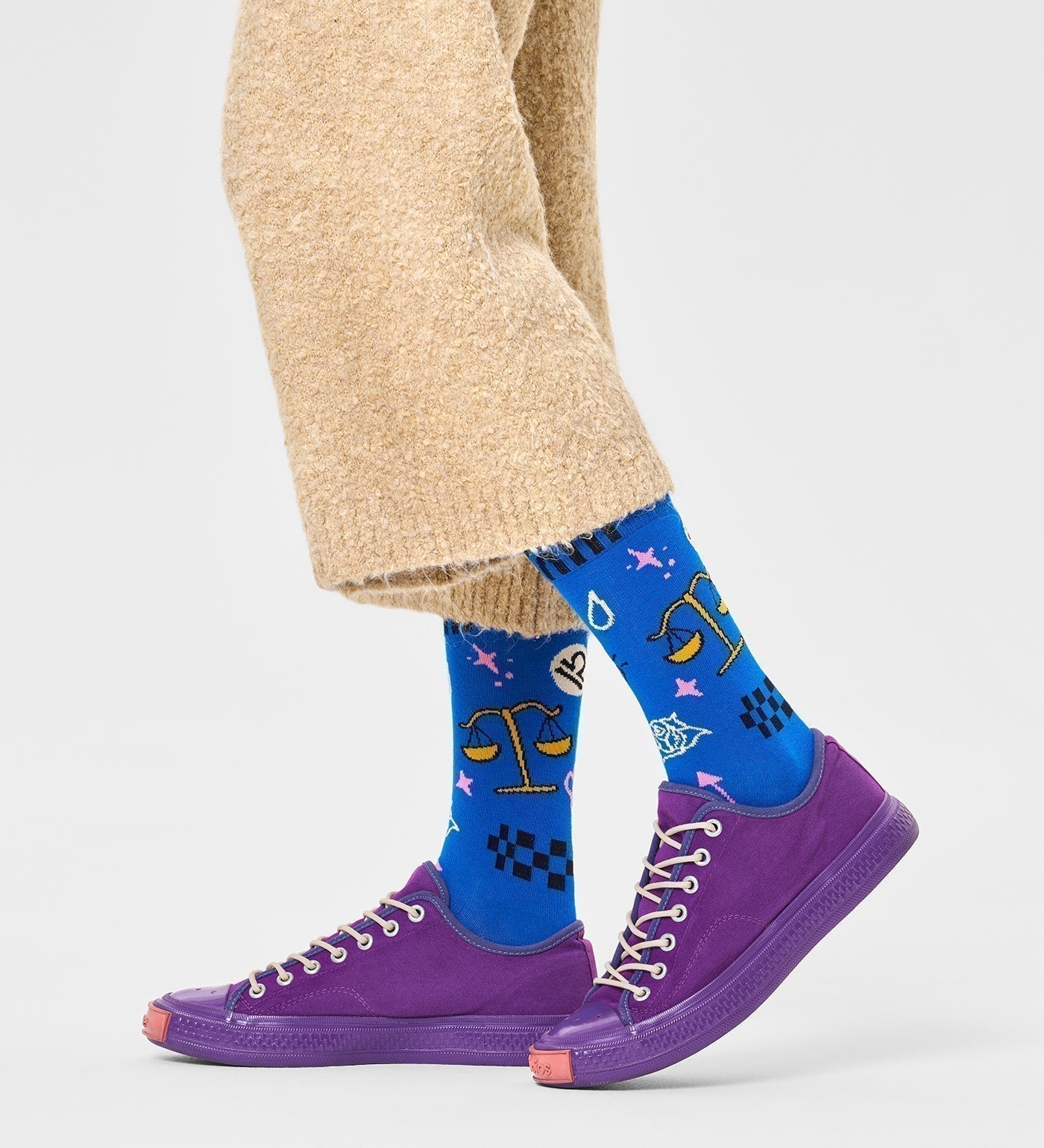 Express your zodiac pride with these vibrant Happy Socks Unisex Libra Crew Length Socks for Women and Men, featuring celestial Libra-inspired designs that showcase harmony and balance. Crafted from ultra-soft TENCEL Modal fibers, these eco-friendly socks provide a smooth, breathable feel suitable for all-day comfort, whether you're dressing casually or adding a bold statement to formal outfits. Perfect as socks for women, crew length socks, or stylish long socks for men, they effortlessly blend aesthetic appeal with versatile style. Ideal as a thoughtful gift for astrology lovers or Libra birthdays, these printed socks combine fun, fashion, and comfort in one. Elevate your sock collection with colorful, designer socks perfect for everyday wear, gym, or as a unique gift box item.