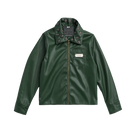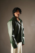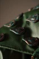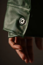 Design - Bold green leather jacket with hand-embroidered beads, zigzag pocket, and a 3D HIRA logo at the back.