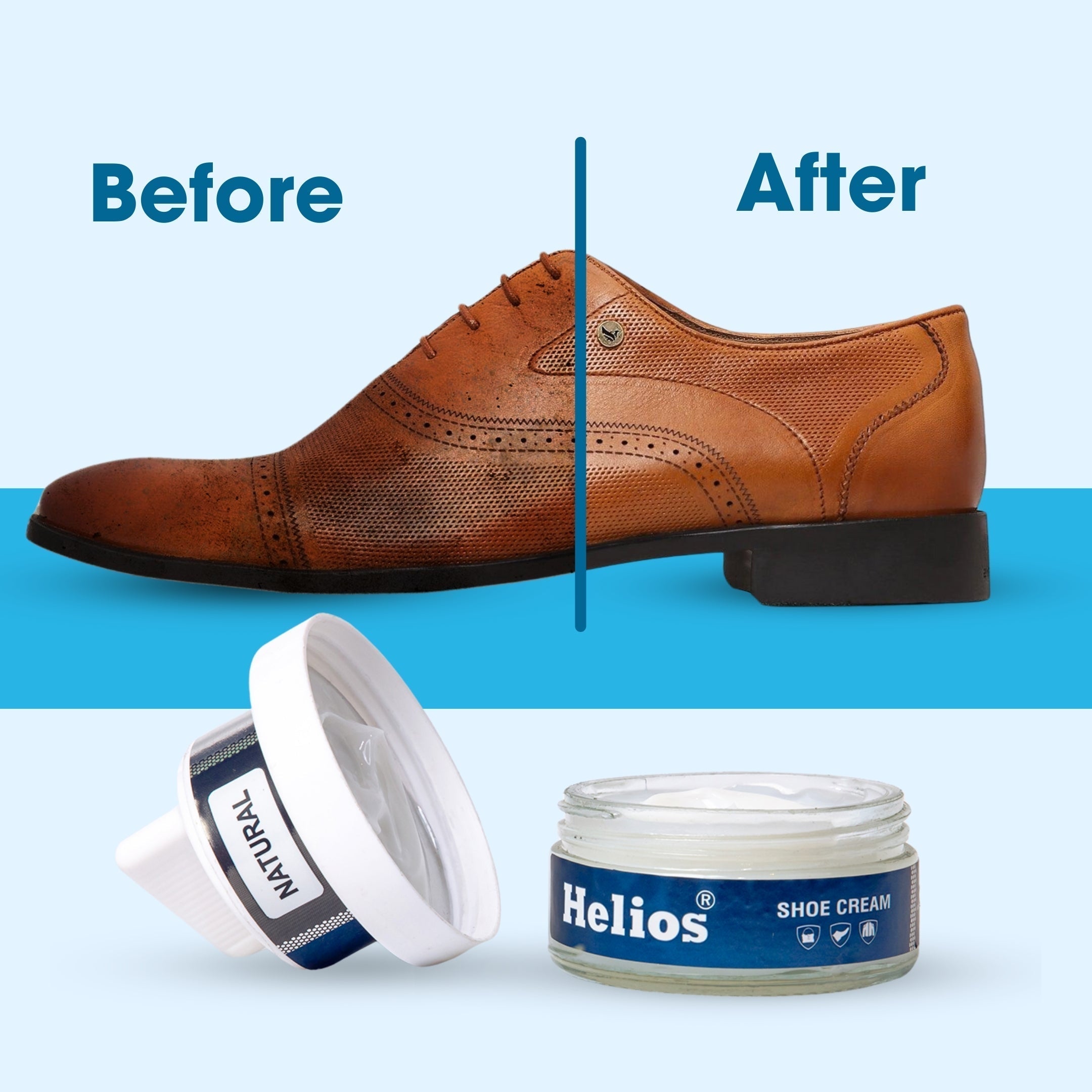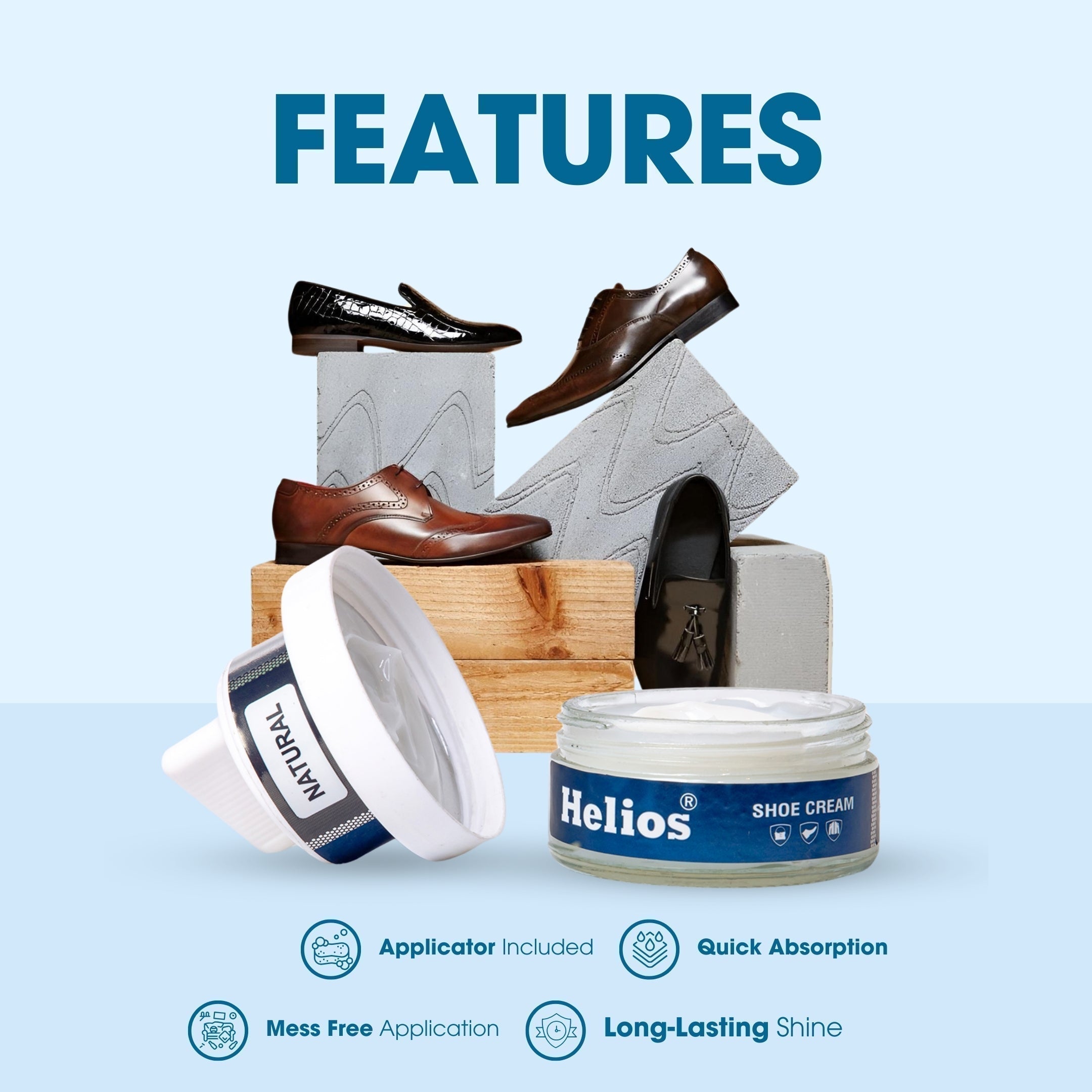 - Apply cream over the surface of the shoe with the help of a Helios Brush or Helios Cloth.