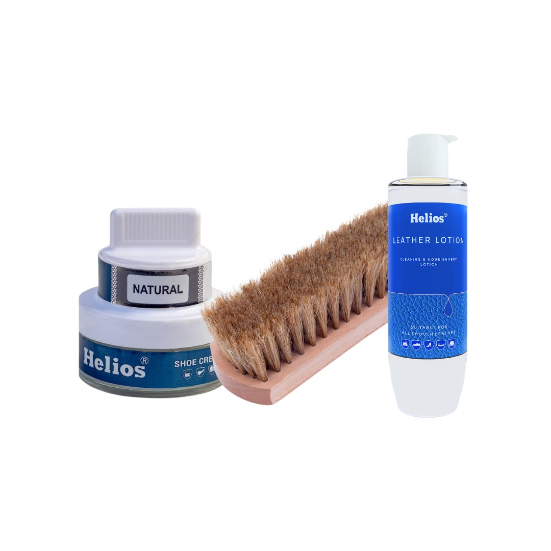 Helios Leather Lotion cleans and nourishes the leather and maintain its natural softness. Especially recommended for leather goods and upholstery. For an example use a clean cloth to apply the lotion. leave to dry. Buff it with a brush for better results. Can be used on any leather product like a leather bag, wallet, belt and much more.