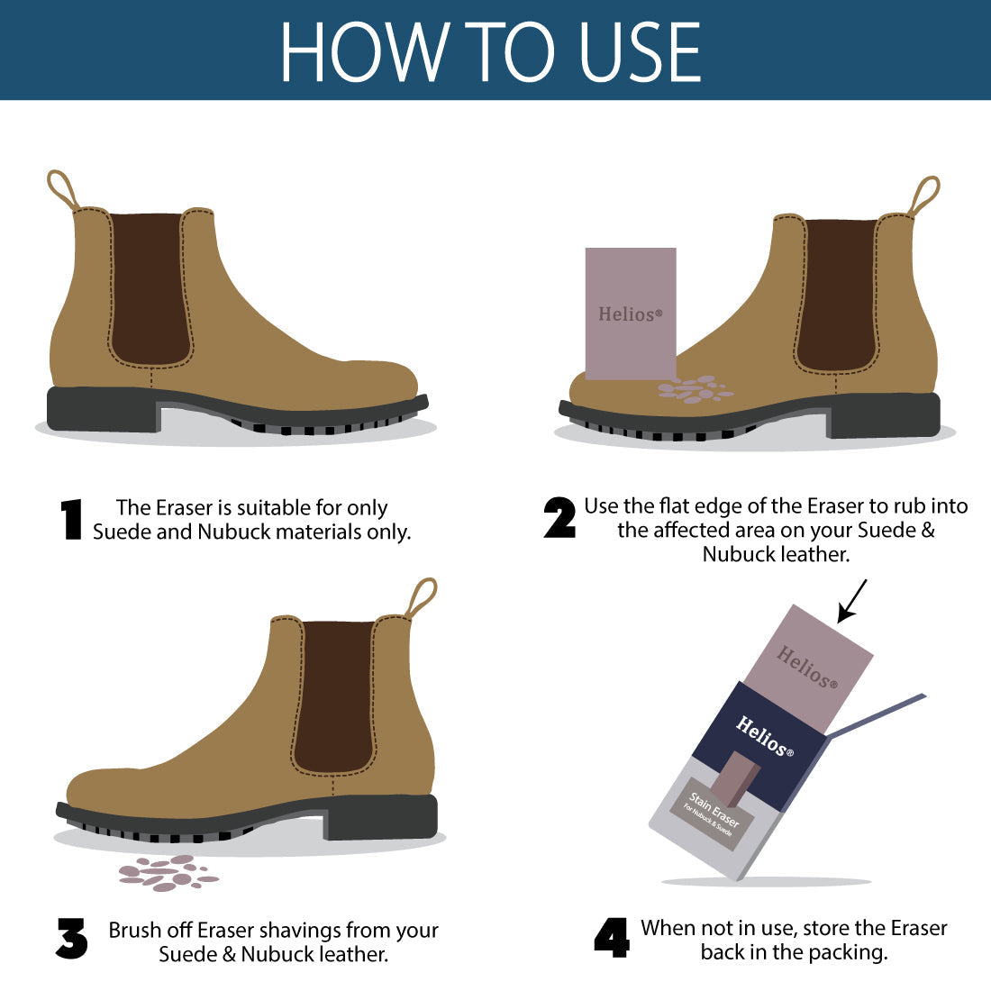 - In case of remaining dirt, brush it off using the Helios Suede Leather Brush.