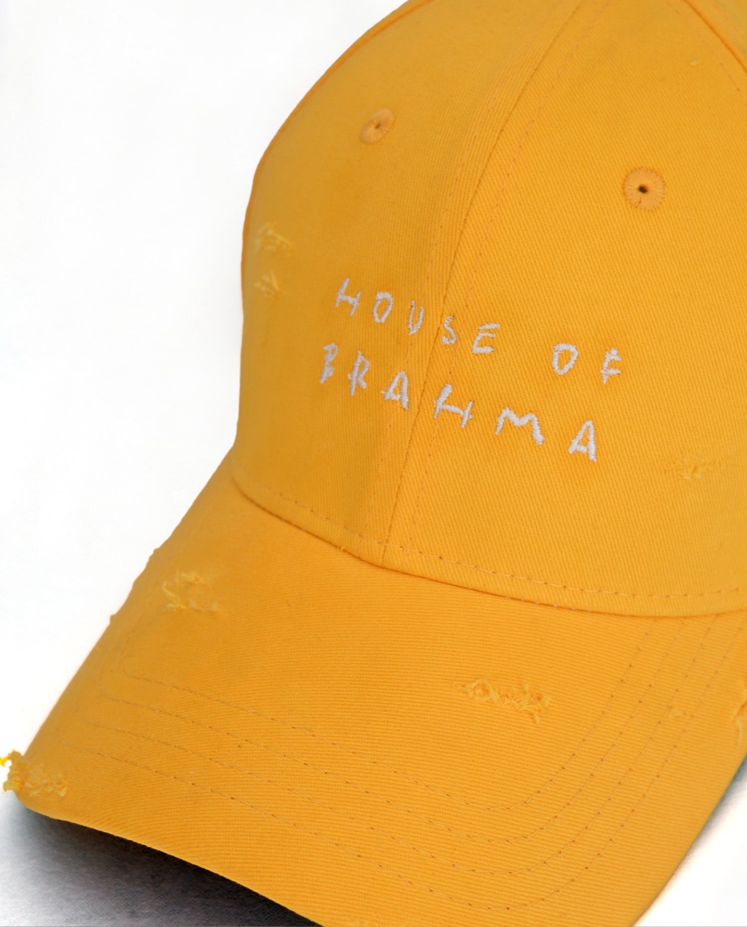 The cap features the "House of Brahma" text, beautifully embroidered on the front, symbolizing elegance and exclusivity of our community. The subtle hand-distress work adds a touch of edge to the cap, ensuring that each piece is as unique as the person wearing it.