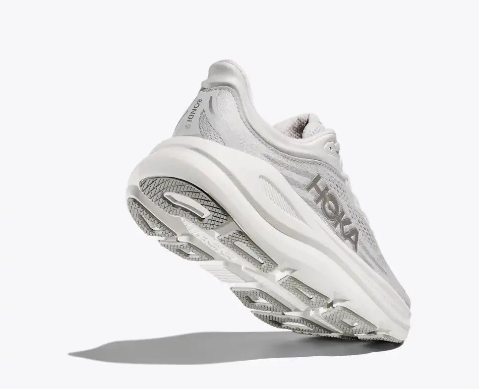 The Hoka Bondi 9 in Stardust and Silver presents a sophisticated option for runners prioritizing comfort and performance. Engineered with Hoka's advanced cushioning technology, this shoe excels at absorbing impact during extended runs while maintaining responsiveness. The extended rocker geometry facilitates a smooth heel-to-toe transition, reducing strain on joints and muscles. The elegant stardust and silver palette offers a contemporary look that complements both athletic and casual wardrobes. Perfect for runners seeking a refined aesthetic without compromising on the plush, supportive ride that makes the Bondi 9 a trusted choice for serious athletes and casual joggers alike.