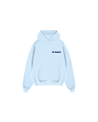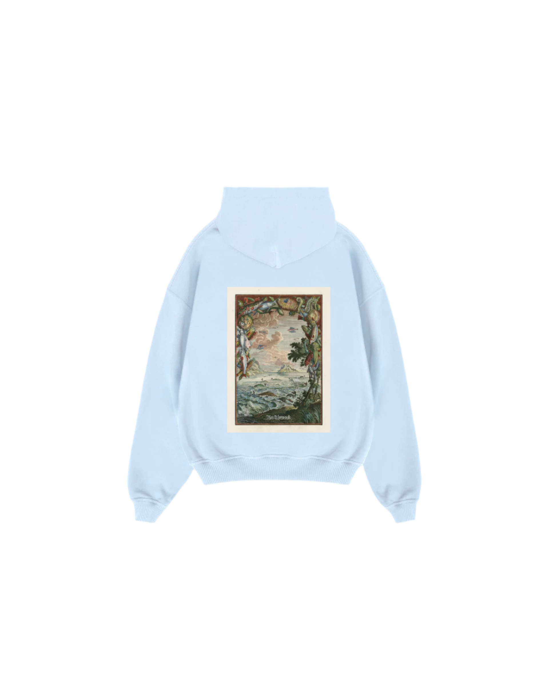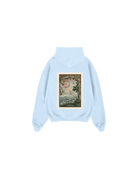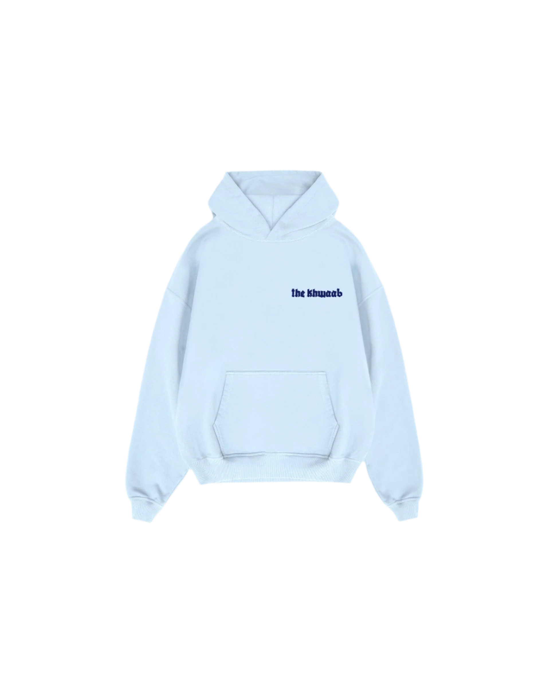 Full sleeves hoodie in hydra blue color crafted in mid weight breathable cotton fleece, with the khwaab script embroidered front and an intricately detailed artwork at the back showcasing hyrda garden botanical charm. Relaxed fit
