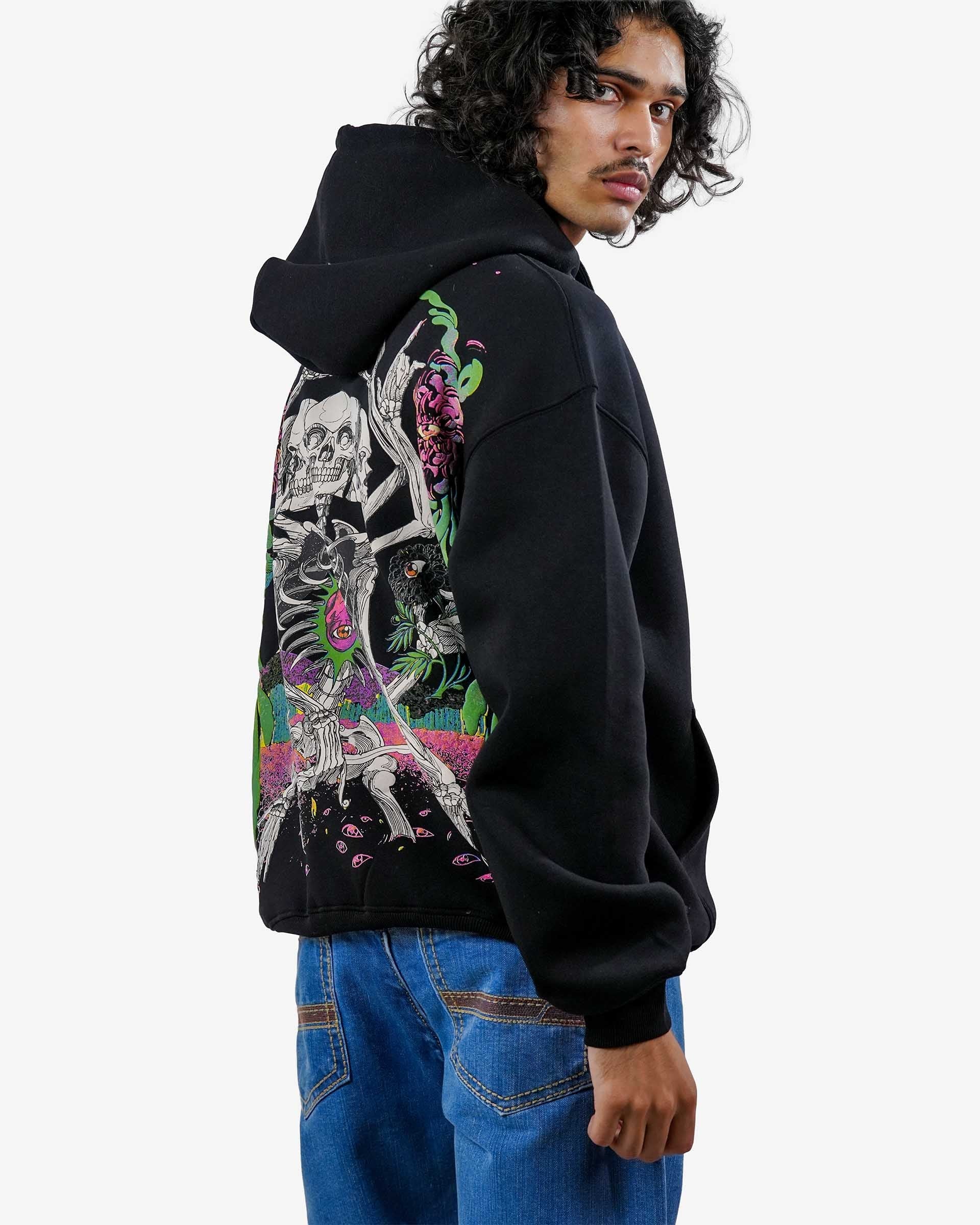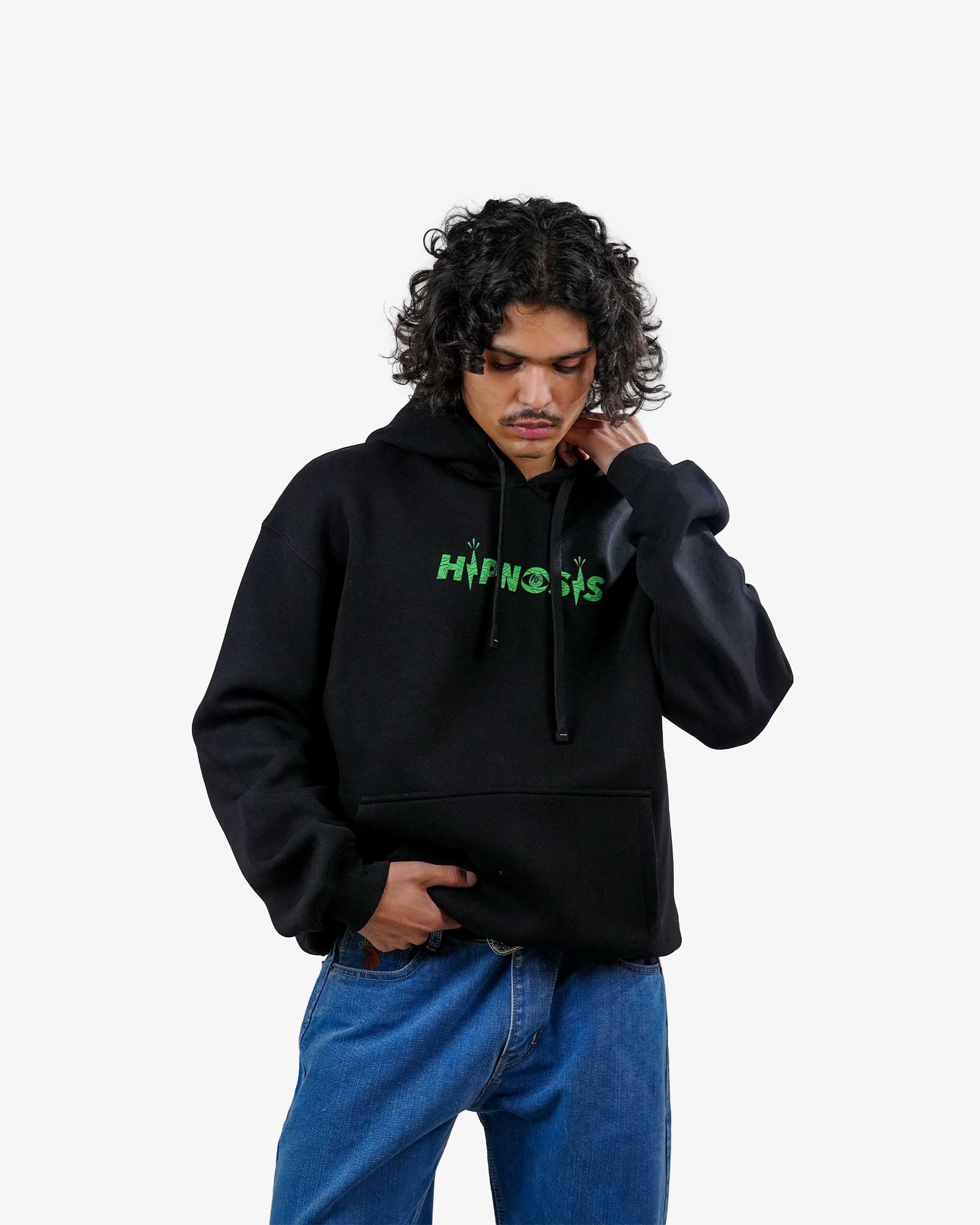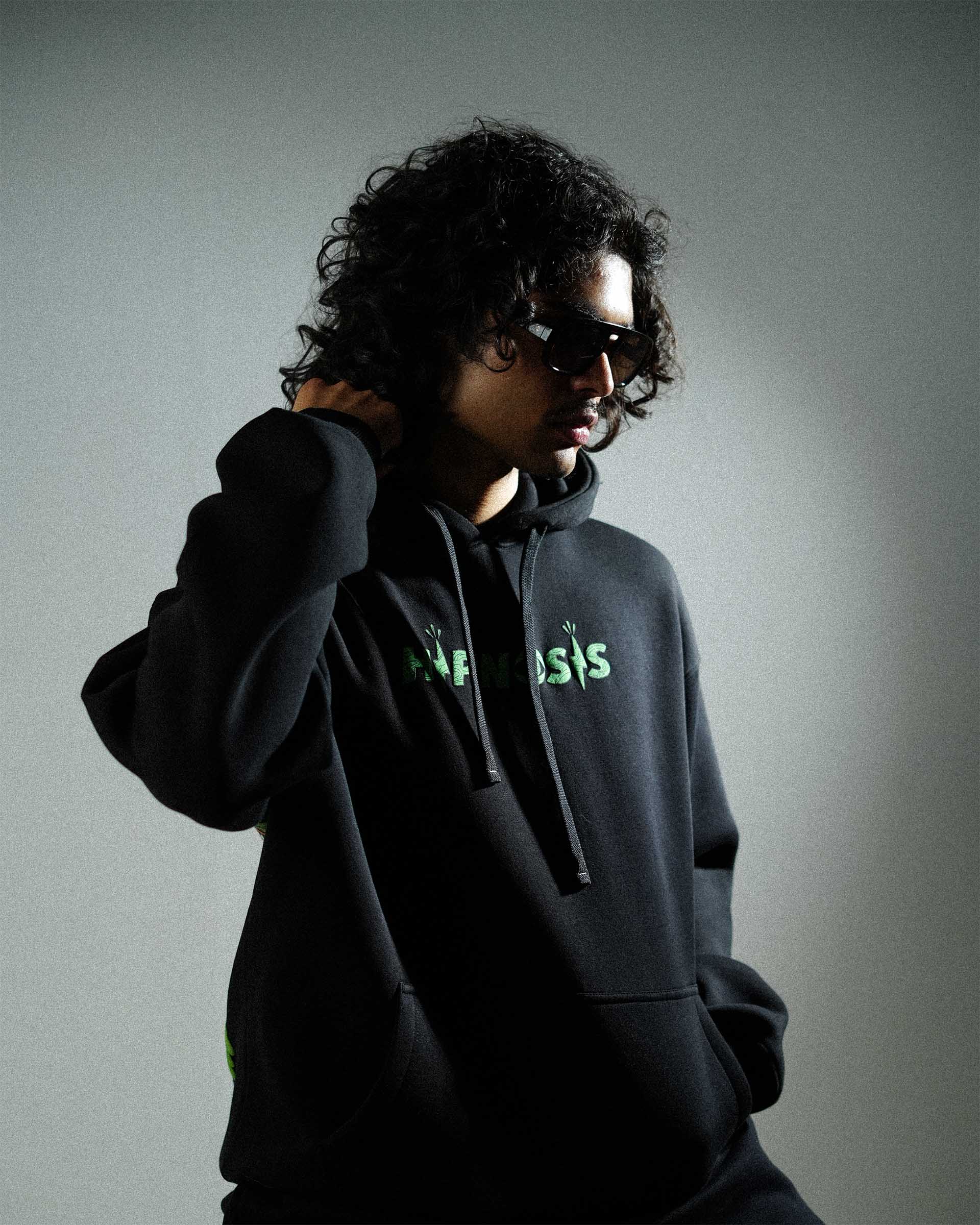 The Hypnosis Hoodie is crafted from luxurious 450 GSM Cotton 3-Thread Lycra Fleece, giving it a heavyweight, structured feel with comfortable stretch. The double silicone finish enhances smoothness, making the black fabric soft and elevated.