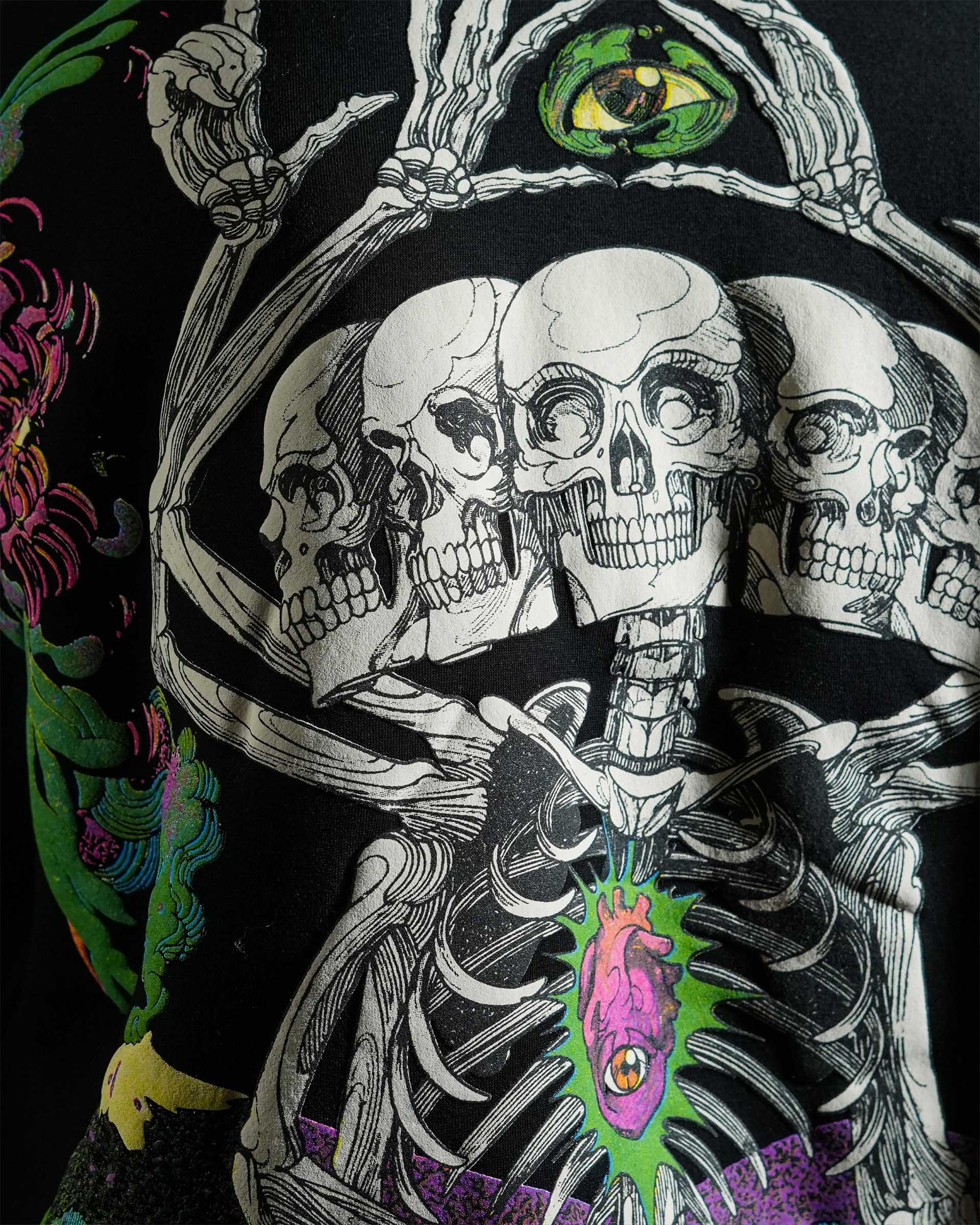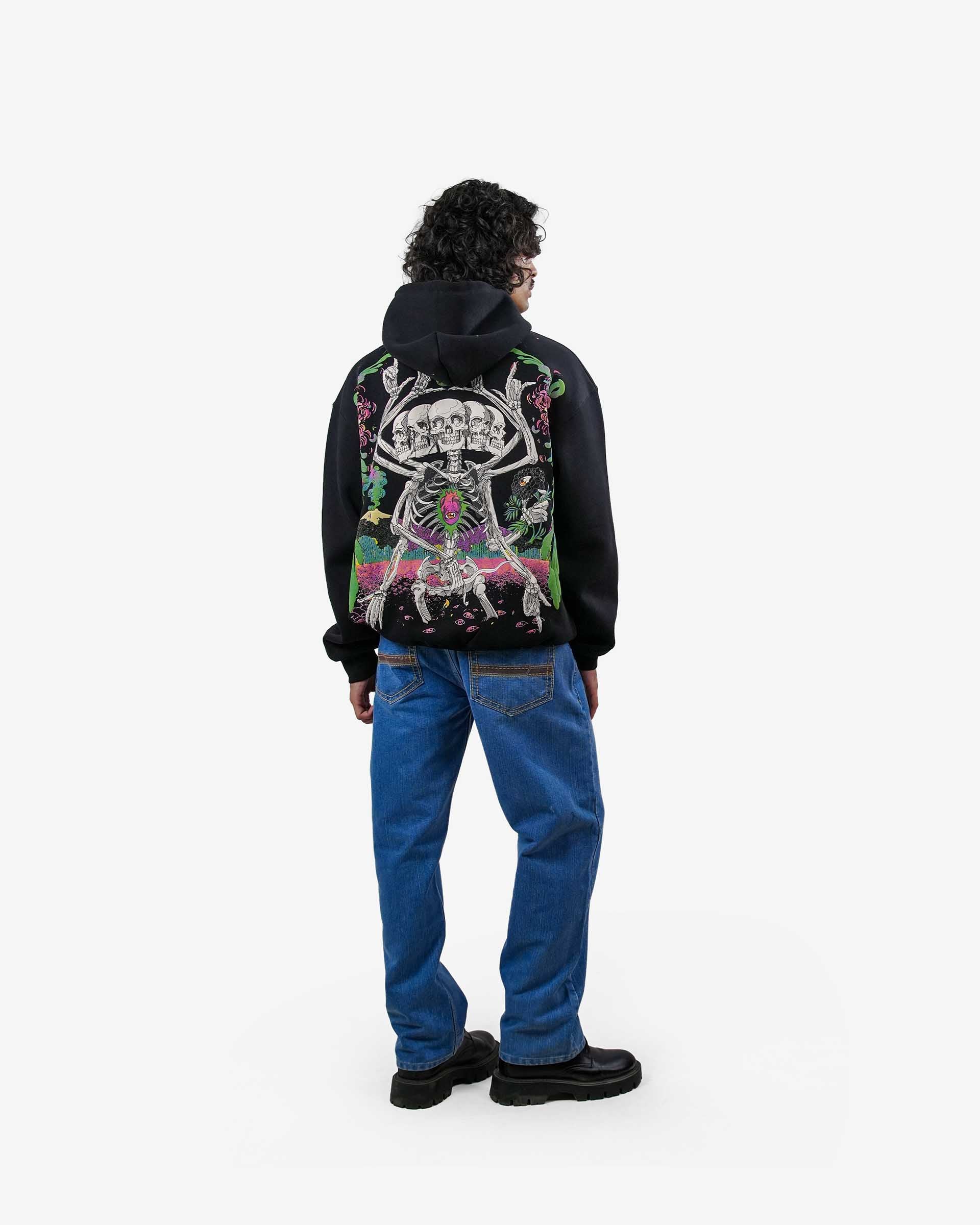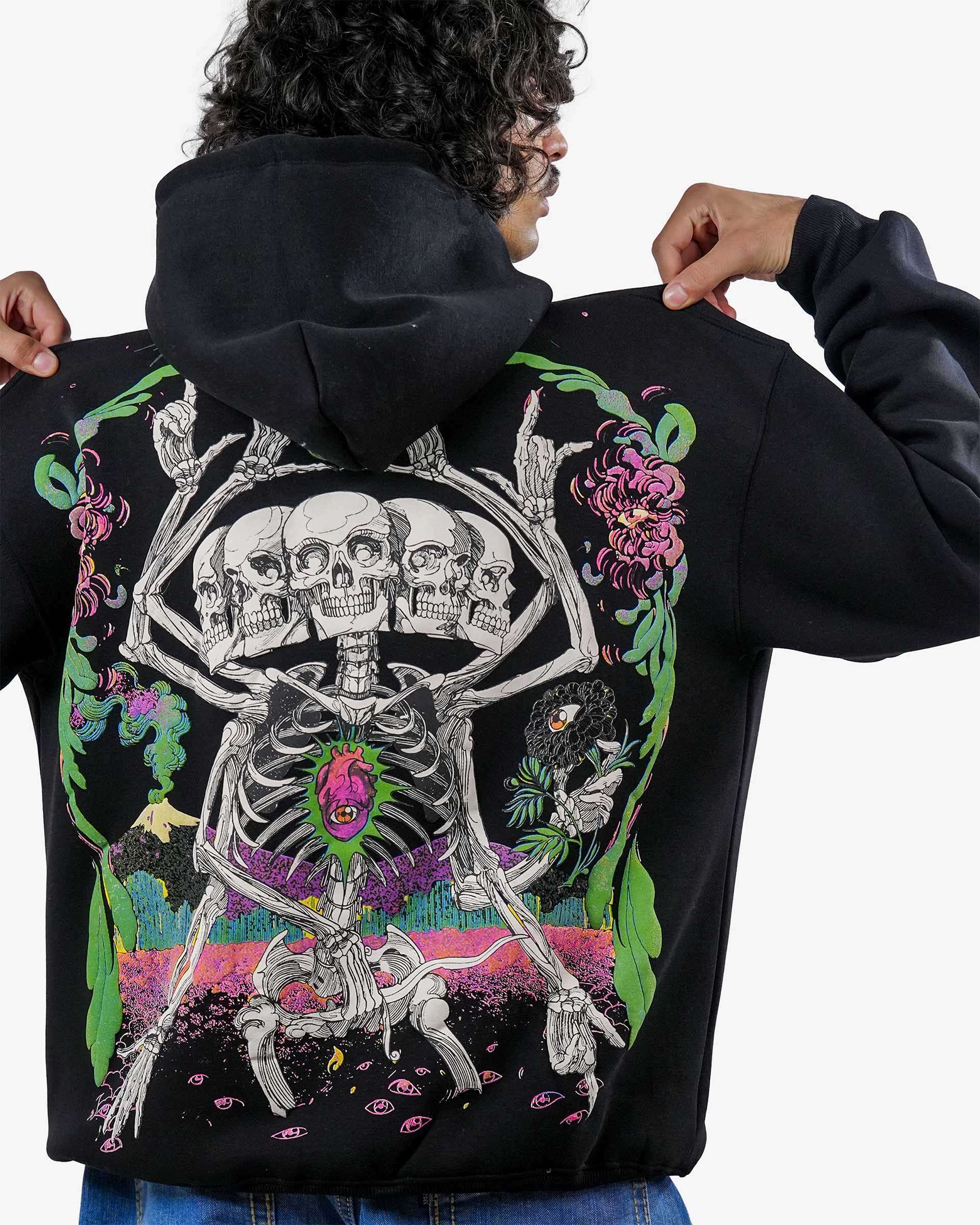 The Hypnosis Hoodie is crafted from luxurious 450 GSM Cotton 3-Thread Lycra Fleece, giving it a heavyweight, structured feel with comfortable stretch. The double silicone finish enhances smoothness, making the black fabric soft and elevated.