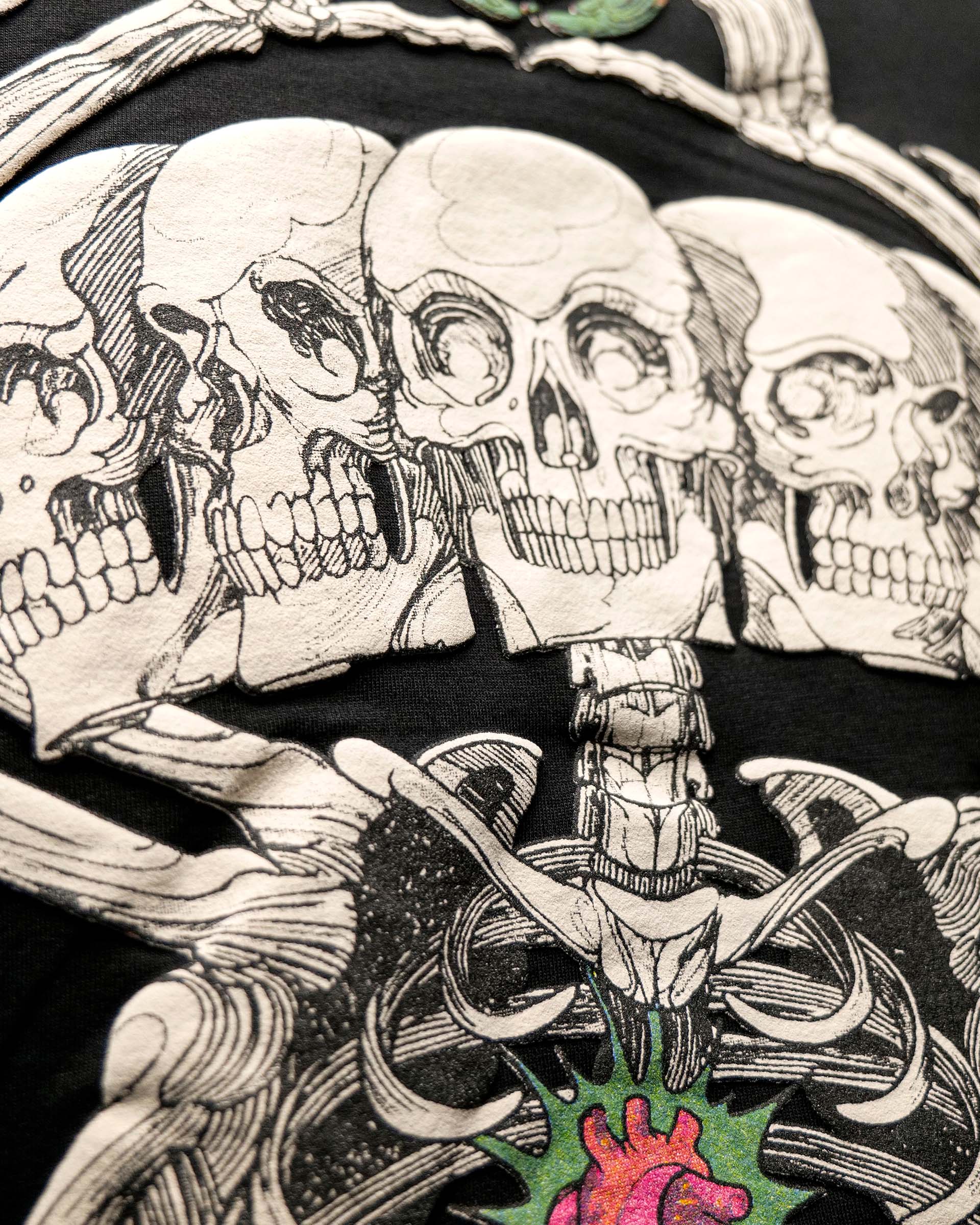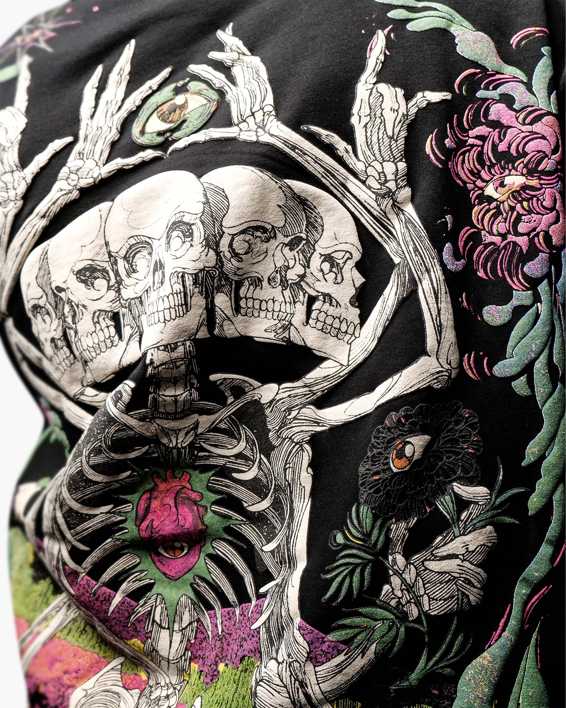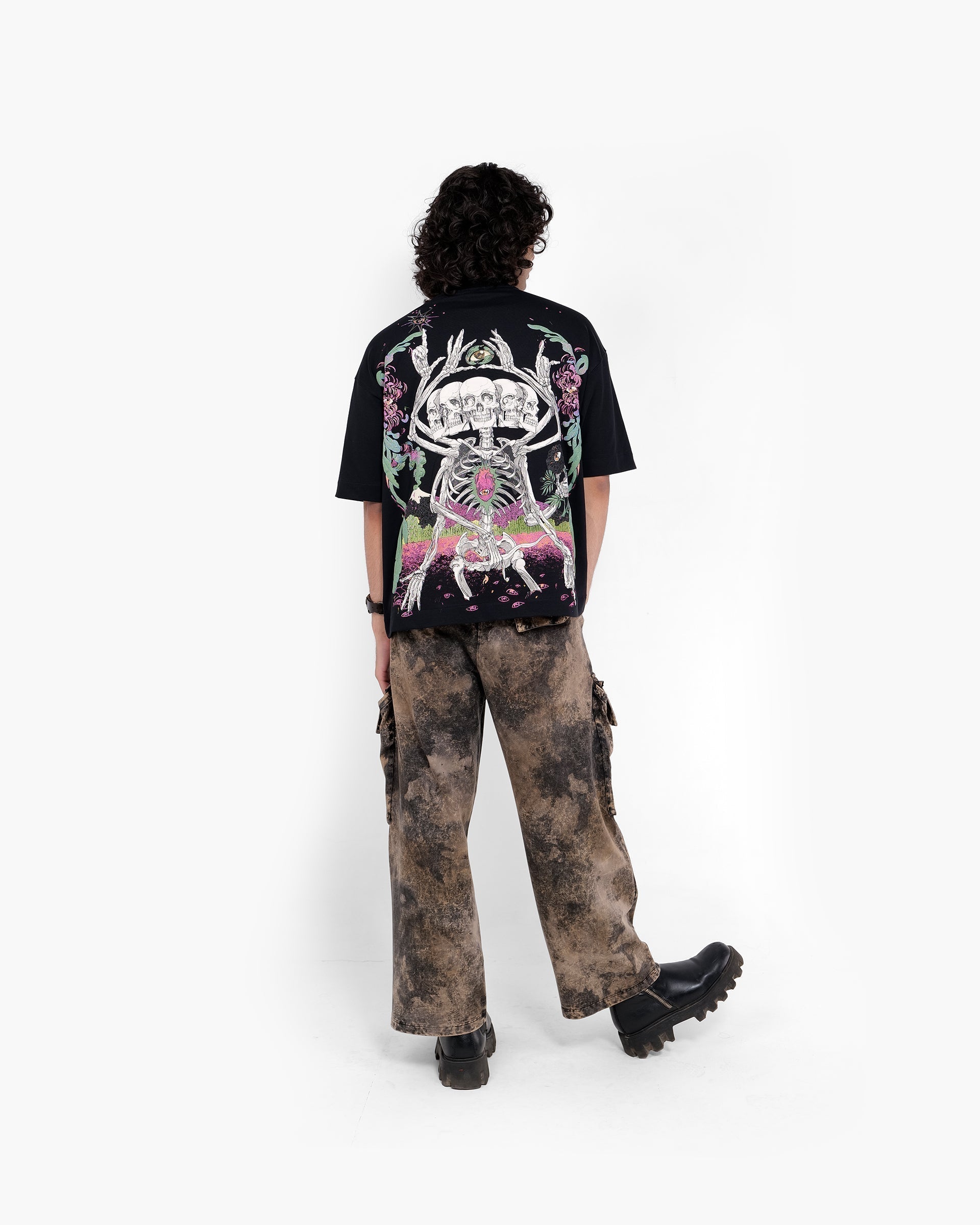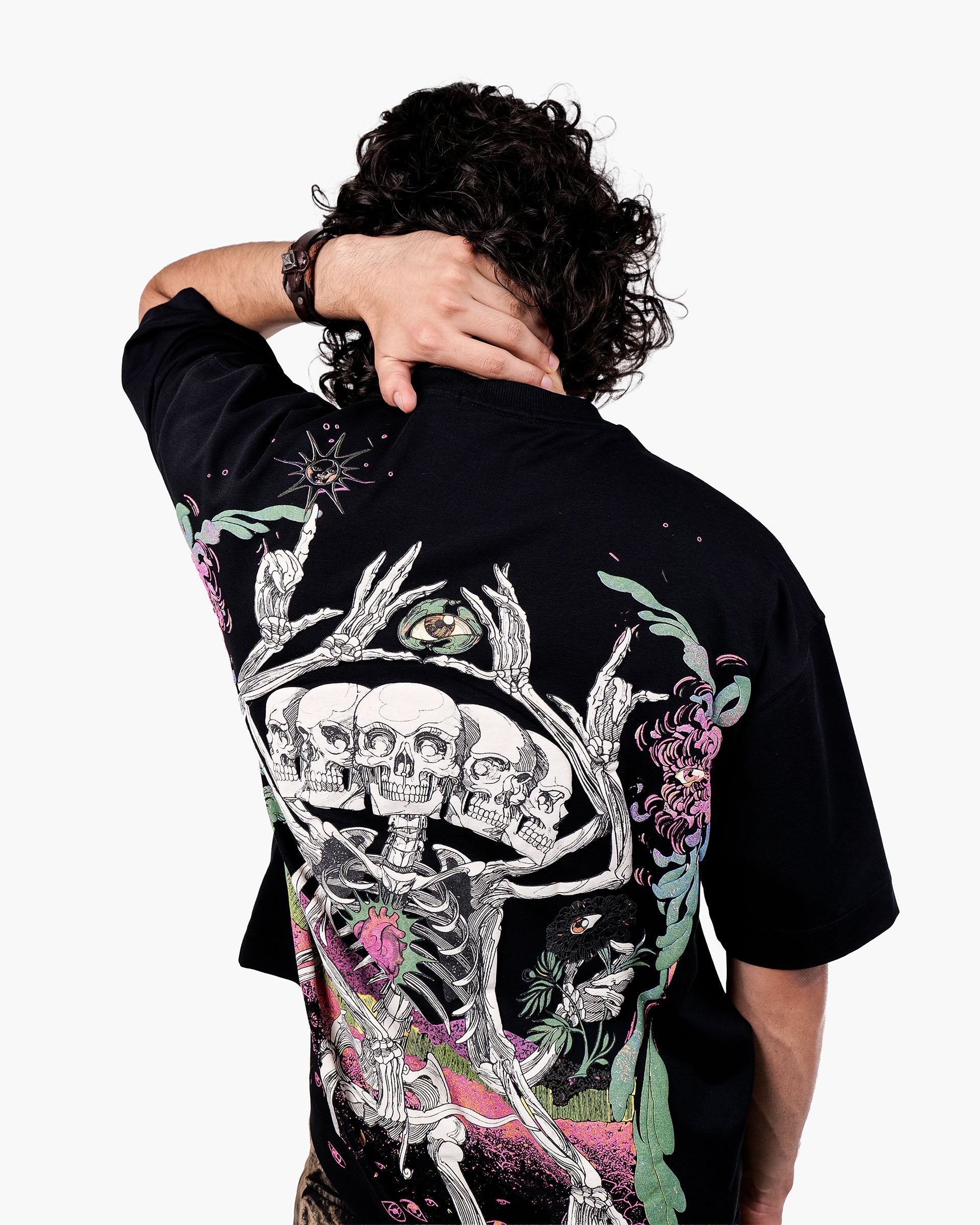 The back features a hypnotic puff print illustration of a skeletal figure crowned by multiple skulls, framed by blooming vines, piercing eyes, and cosmic symbols. This surreal design evokes themes of rebirth, consciousness, and psychedelic elegance. Finished in deep blacks with vivid pink, violet, and green tones, this tee commands attention while staying rooted in elevated streetwear style.