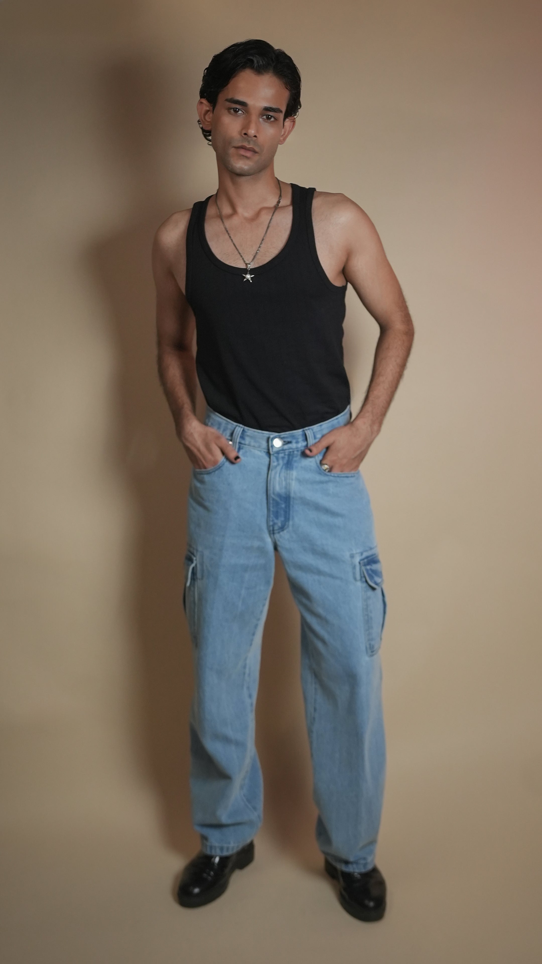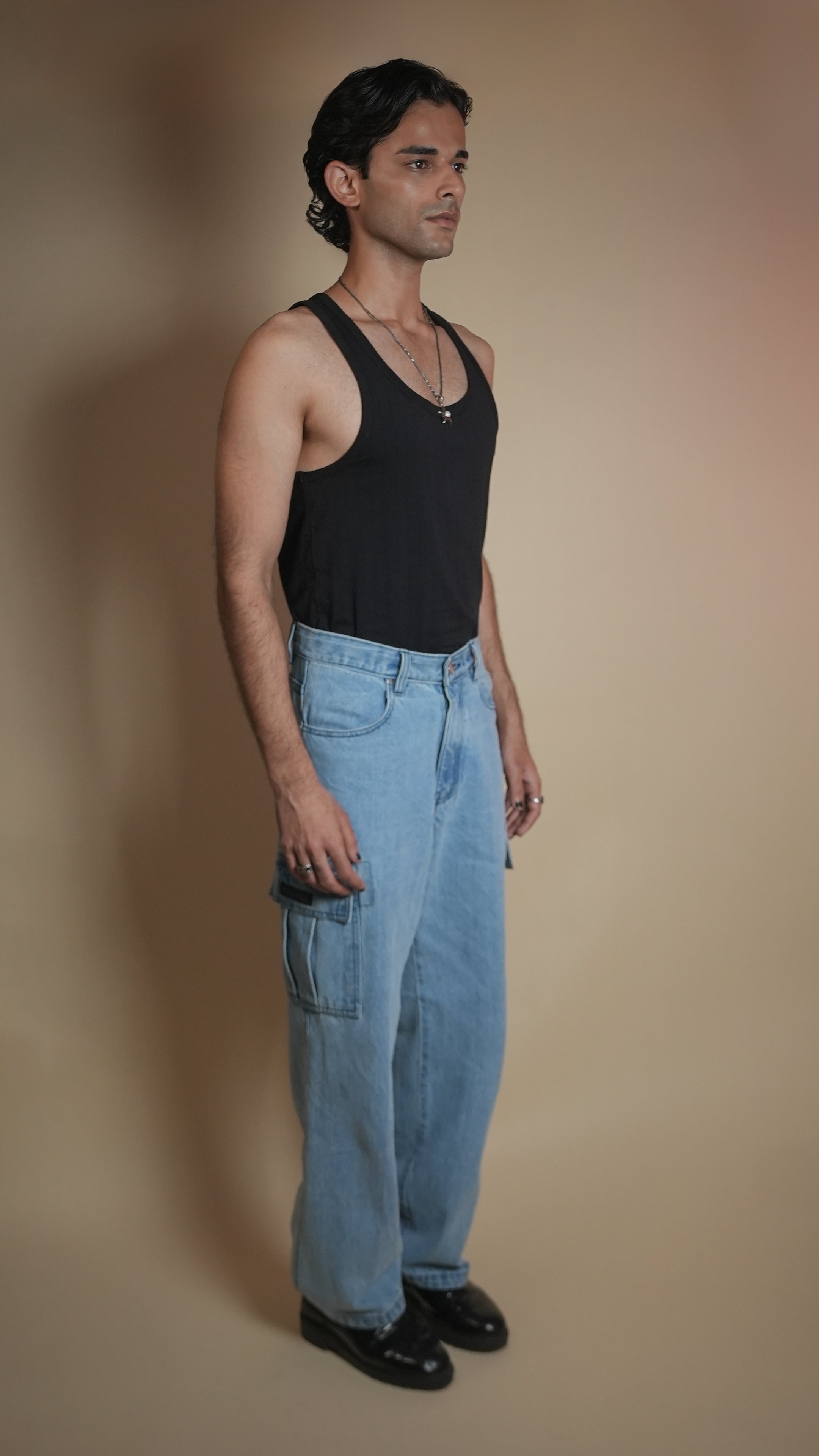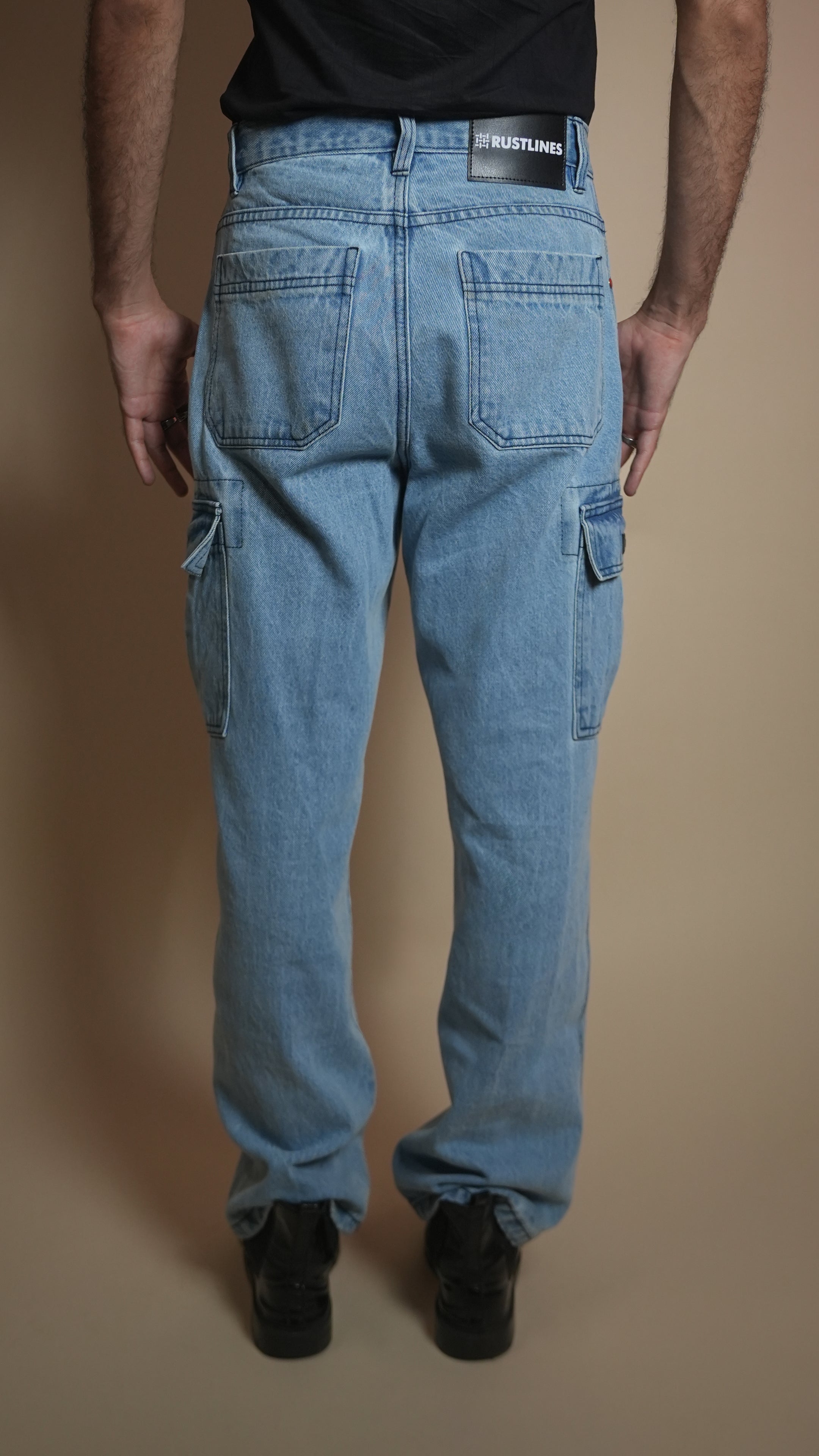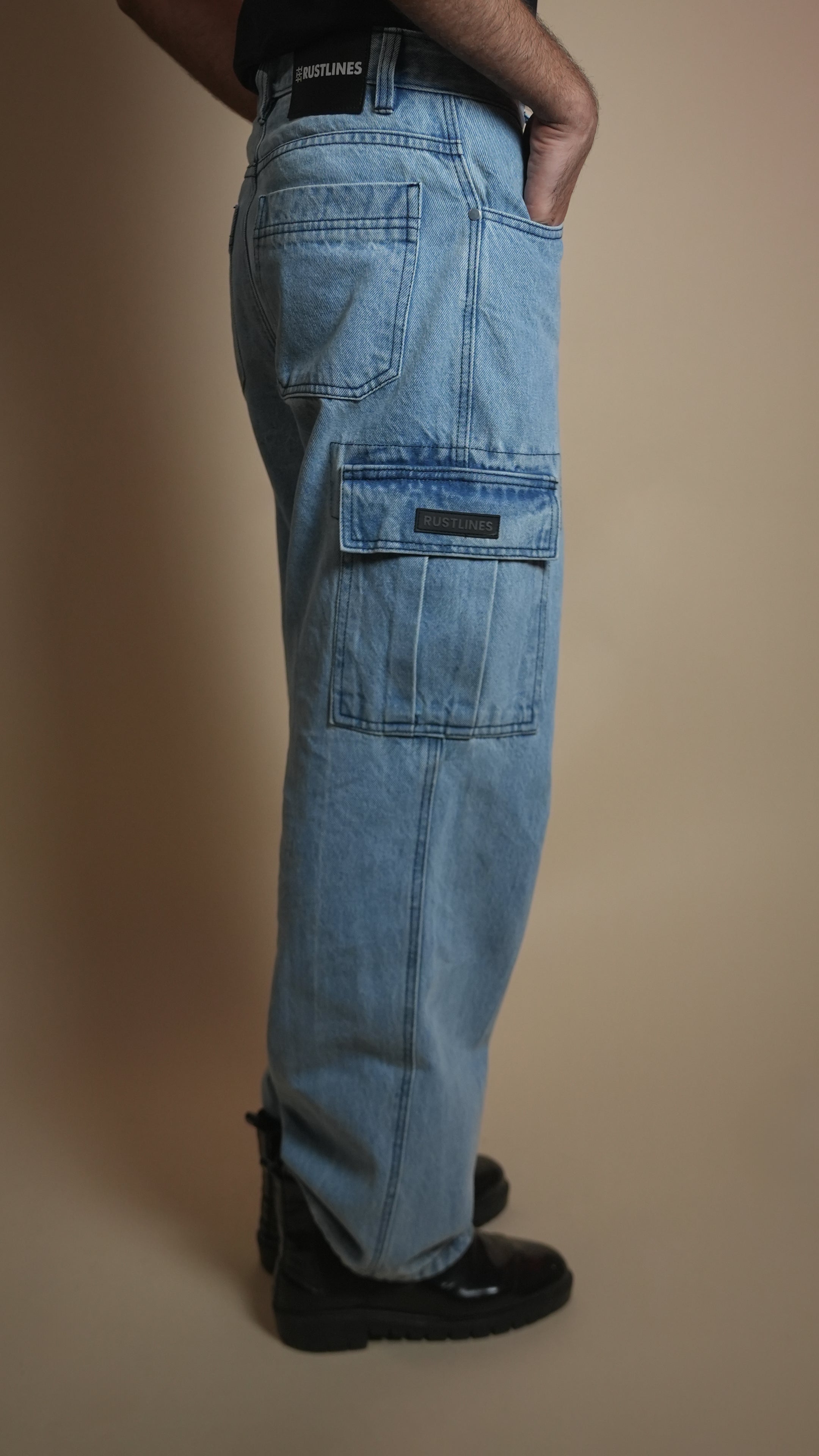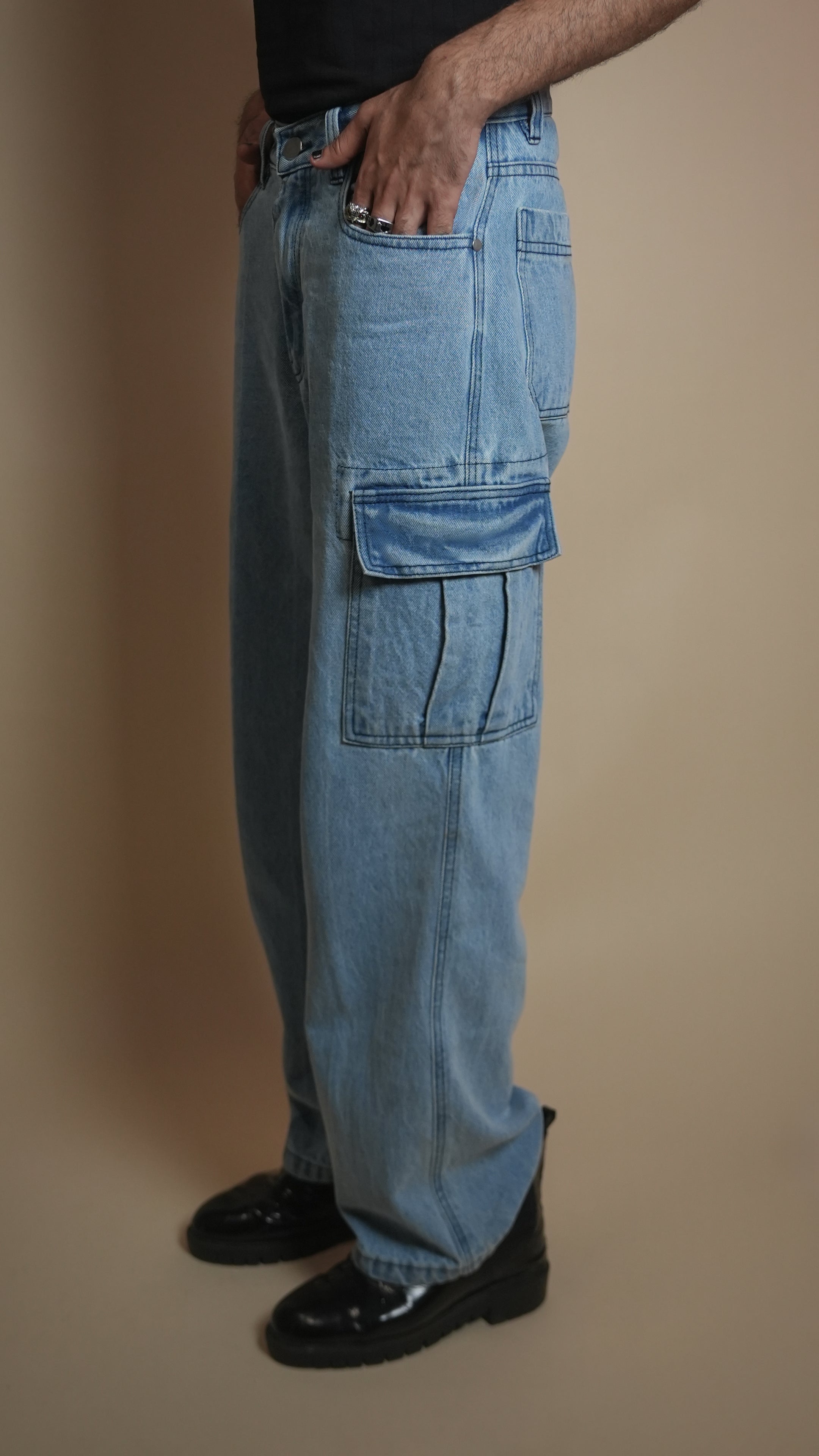 Cut from heavyweight 13.5 oz non-stretch cotton denim, these cargos bring an oversized, baggy silhouette in a striking ice-blue wash. Designed with 6 functional pockets, silver hardware, and YKK zippers for long-lasting performance, plus contrast stitching for a sharp, elevated look. Hand-cut and handcrafted for a rugged, urban finish.