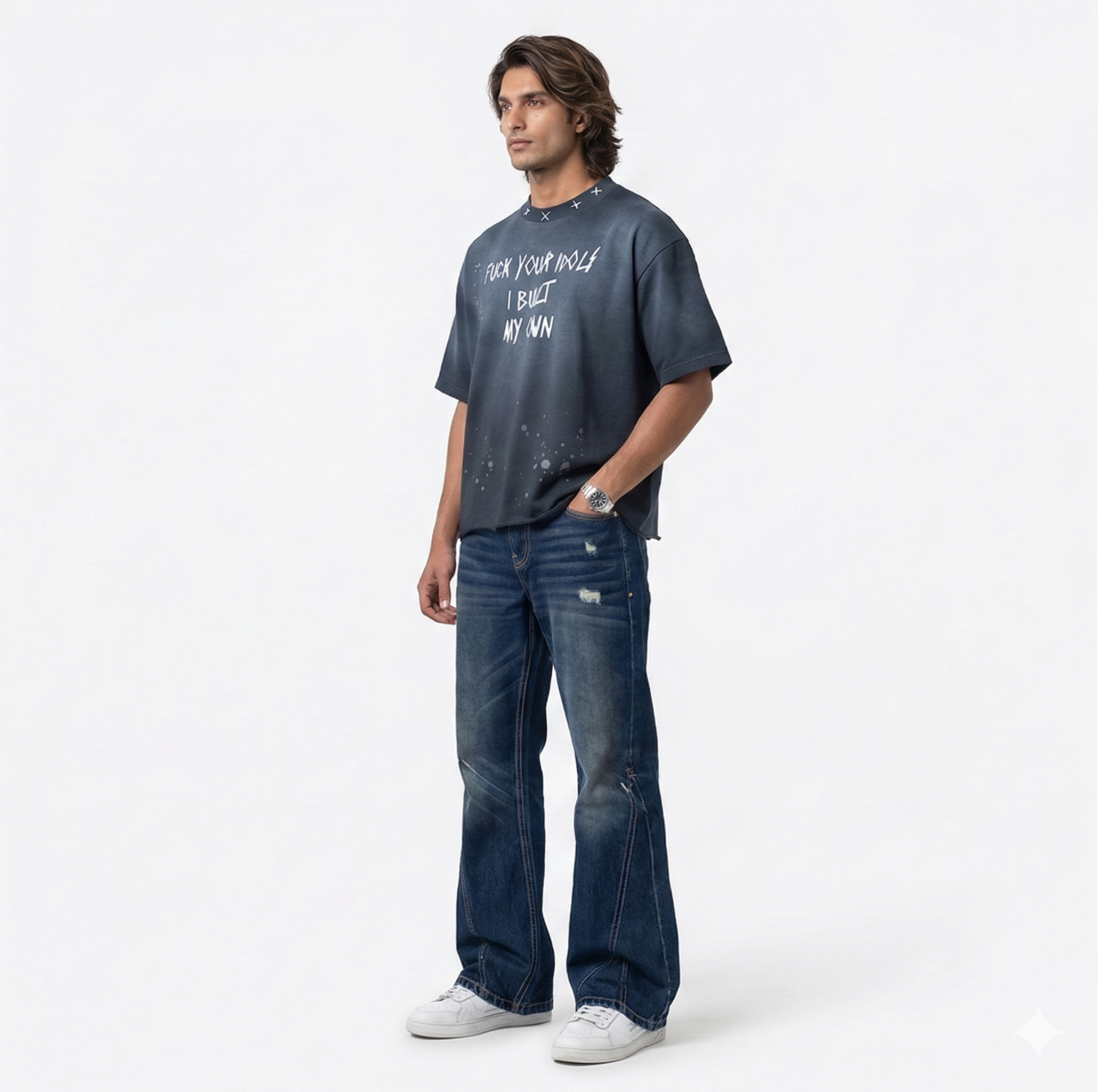 Elevate your wardrobe with the Idol Annihilator Acid Wash Tee from the Explicit Wings collection—a bold statement in blue acid-washed heavyweight cotton that embodies unapologetic self-made rebellion.
