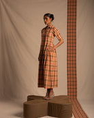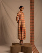 Long brown well-fitted chequered dress, half sleeves and buttoned down in the front
