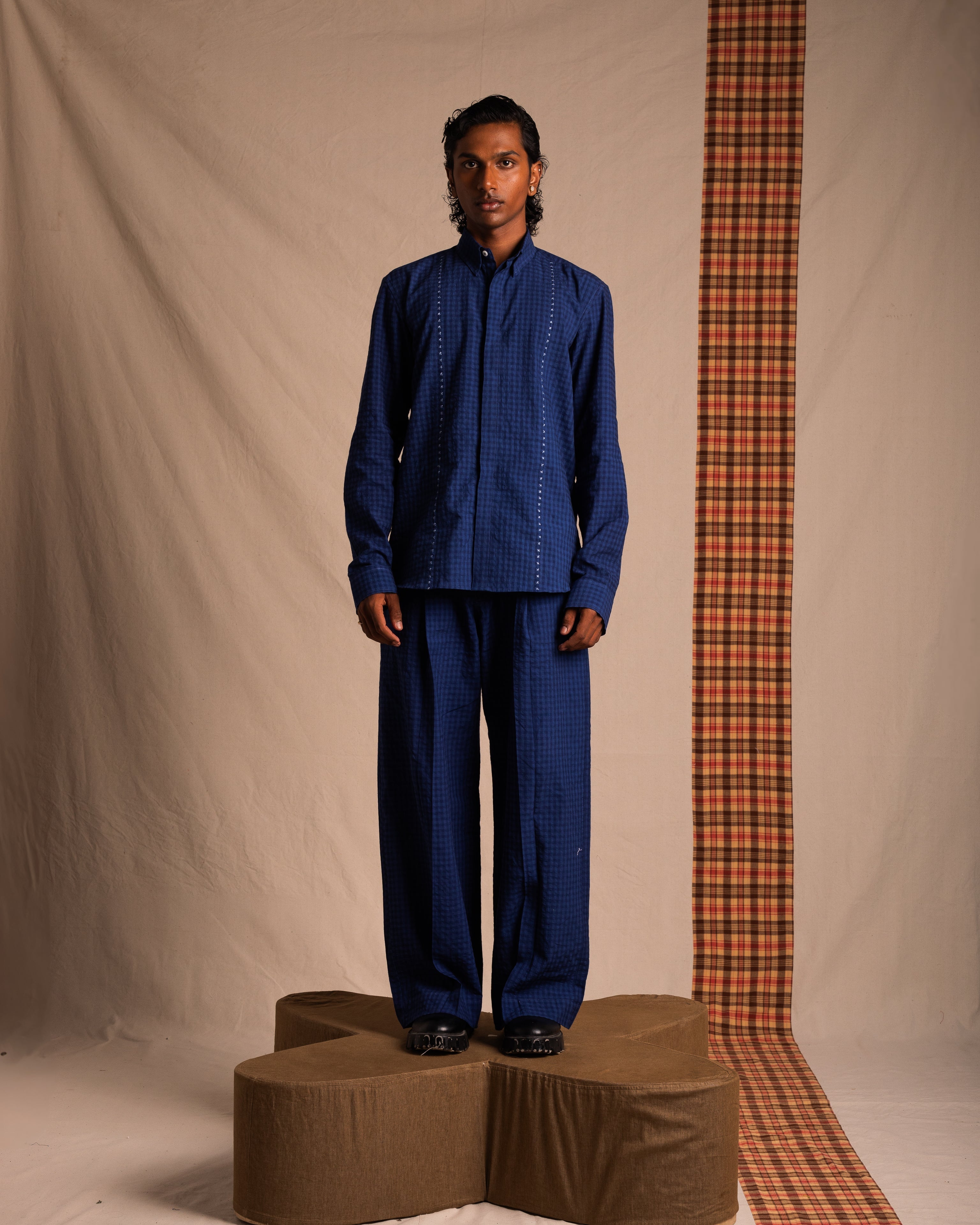 Relaxed button-down shirt with Erode’s motif cross stitch detailing on either side