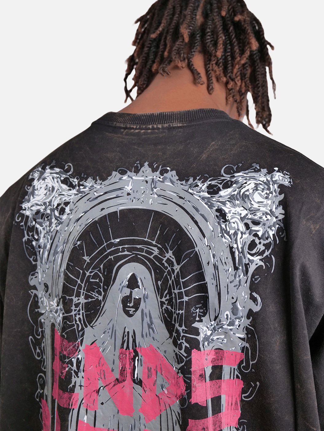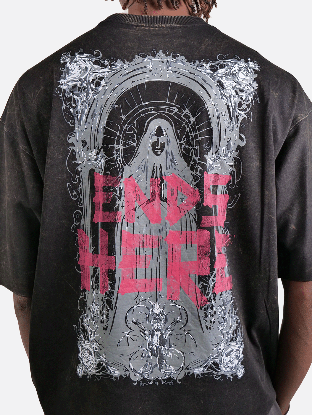It Ends Here! - Black Washed Graphic Drop Shoulder Unisex Oversized T-Shirt