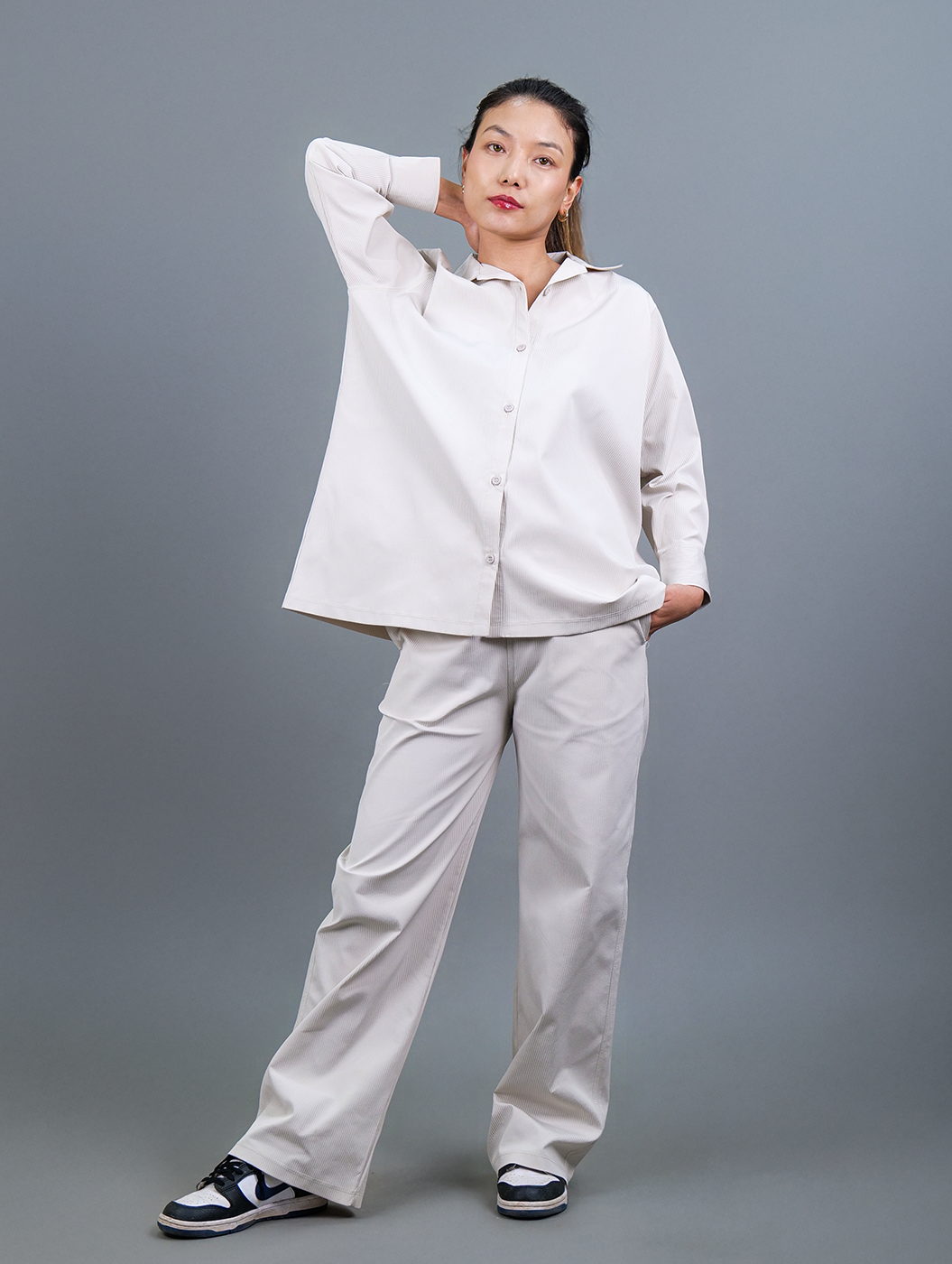 Featuring a soft, airy ensemble designed for all-day ease. The relaxed-fit Cuban collared shirt with full sleeves pairs effortlessly with comfy pants featuring functional pockets. Crafted from breathable fabric, it’s perfect for lounging or effortless daywear.