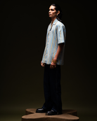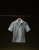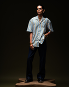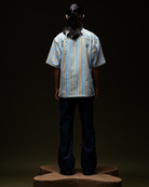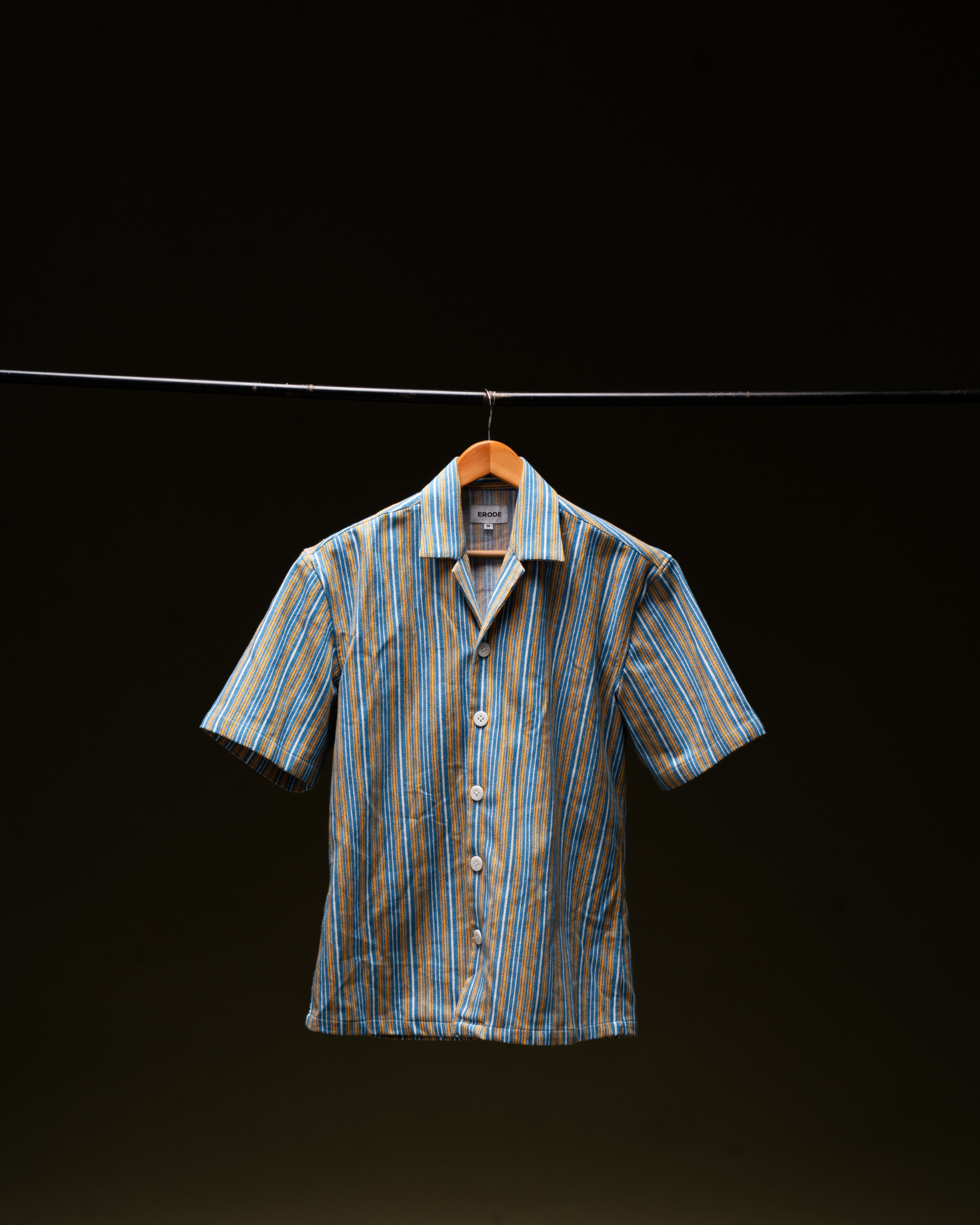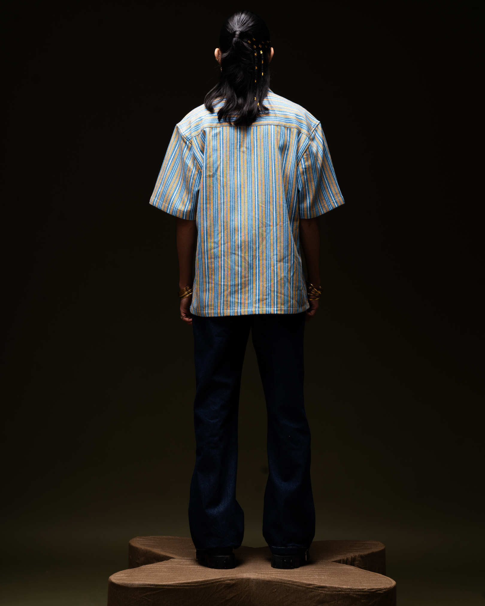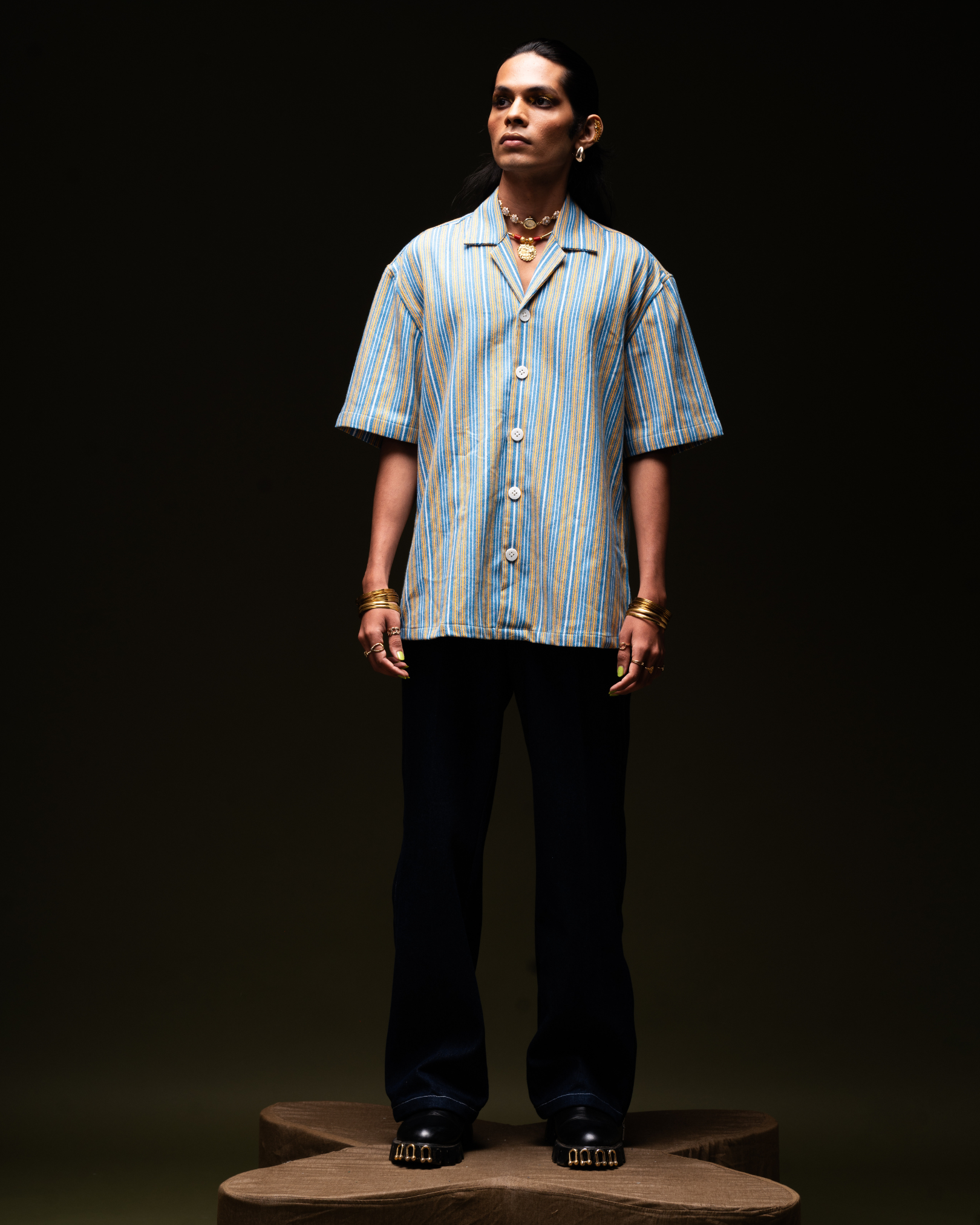 "KAALAM FROM THE PAST" is our BLUE-YELLOW striped quintessential mixture of a typical Tamil Nādu style shirt with all buttoned a new version of our very first “shacket.” This shacket is completely made from the Jamakkalam fabric. It features short kimono sleeves, lapel neckline, all buttons in the front, oversized fit.