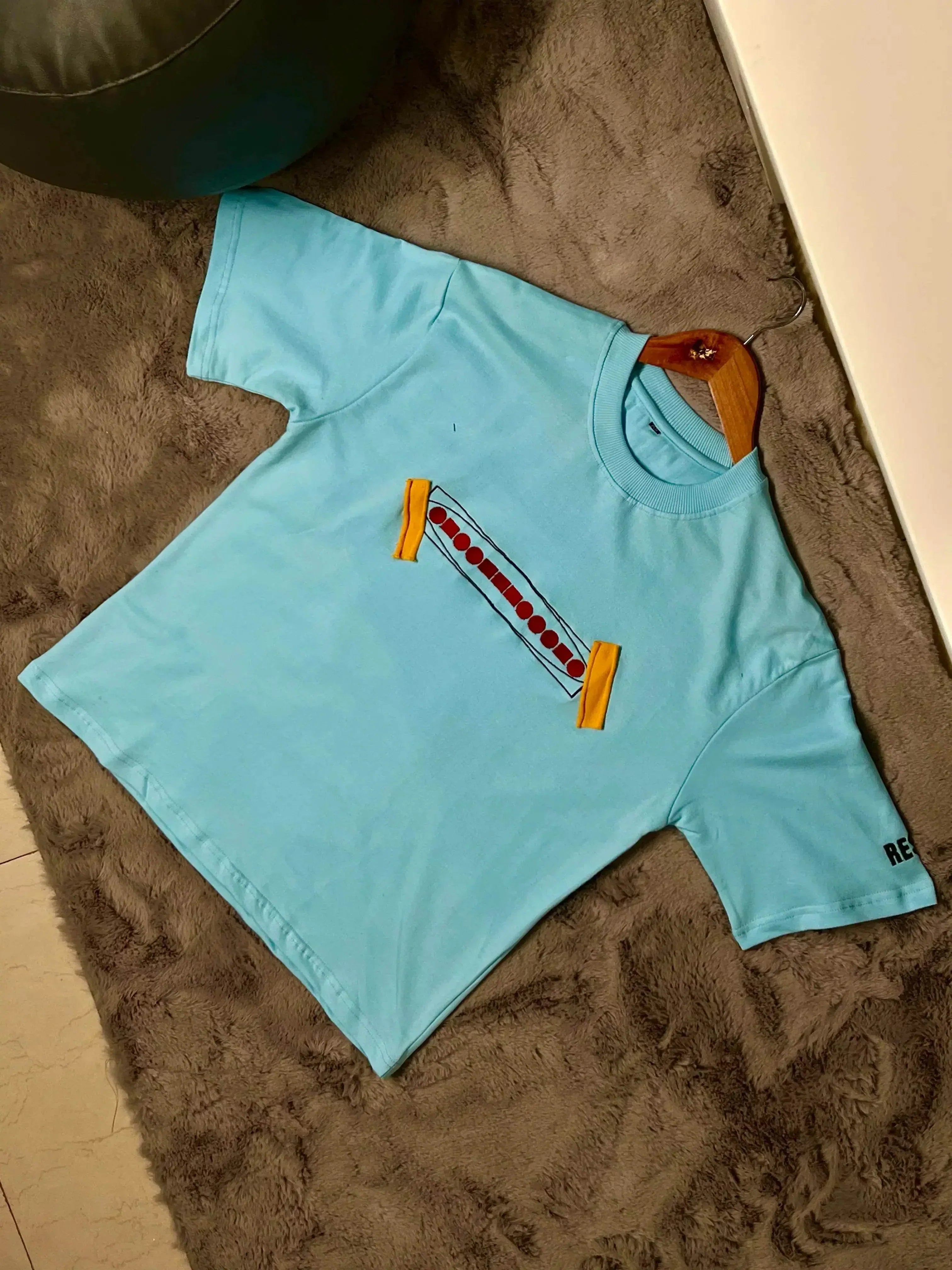 The front of the tshirt has the asks the rhetorical question 'what seperates your body from your soul' and the answer to that is love. The dots and dashes means the word LOVE in morse code and the yellow patchwork on the two corners signify tape for emphasizing on the answer that is love.