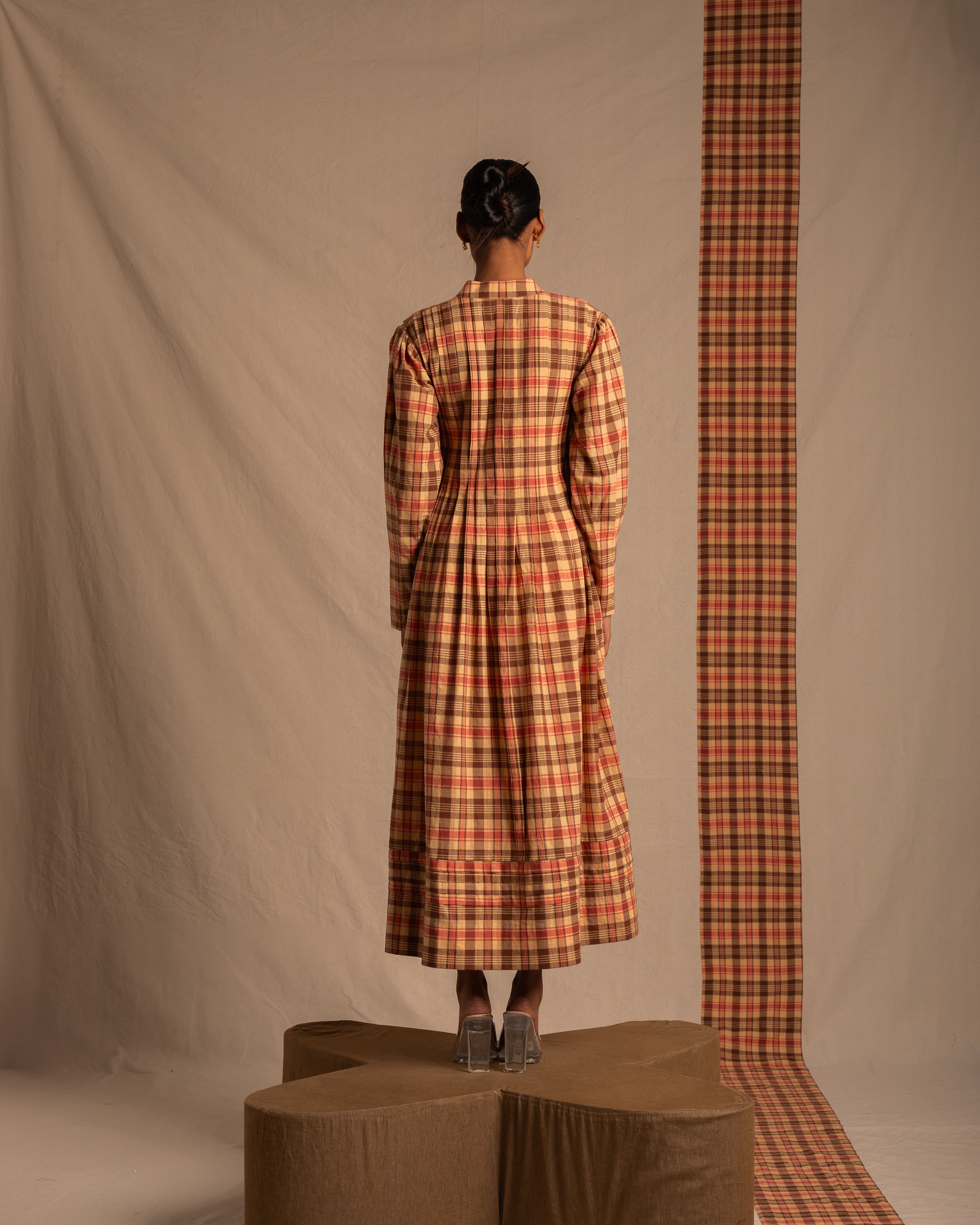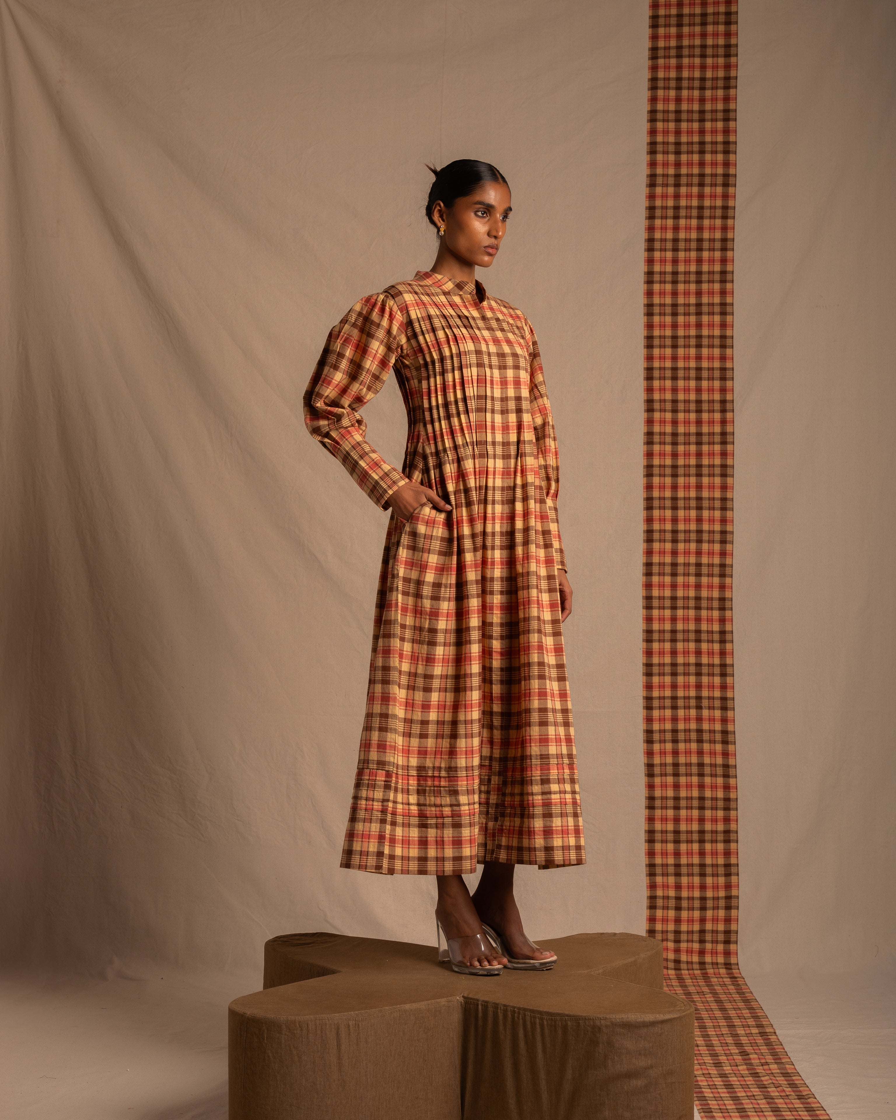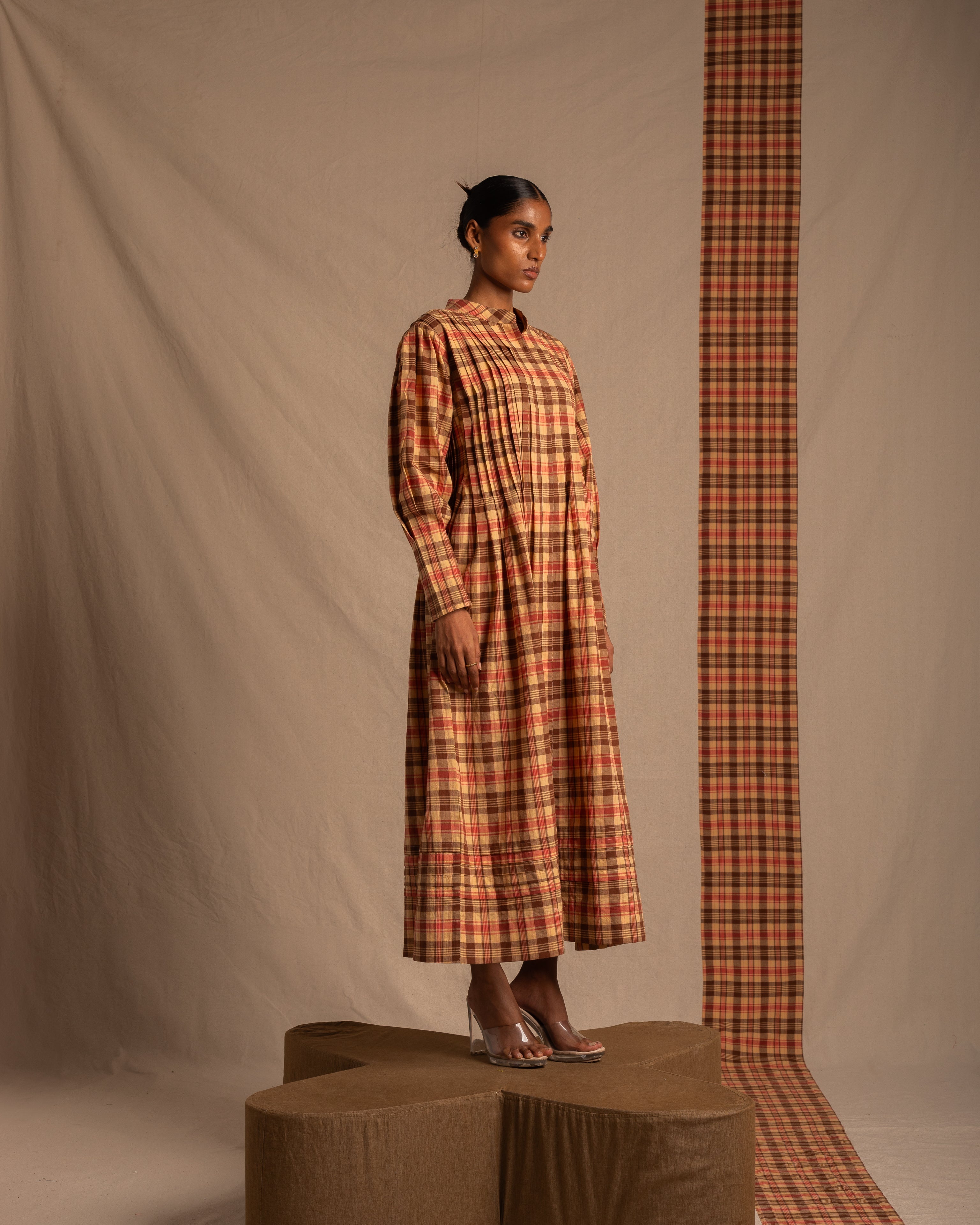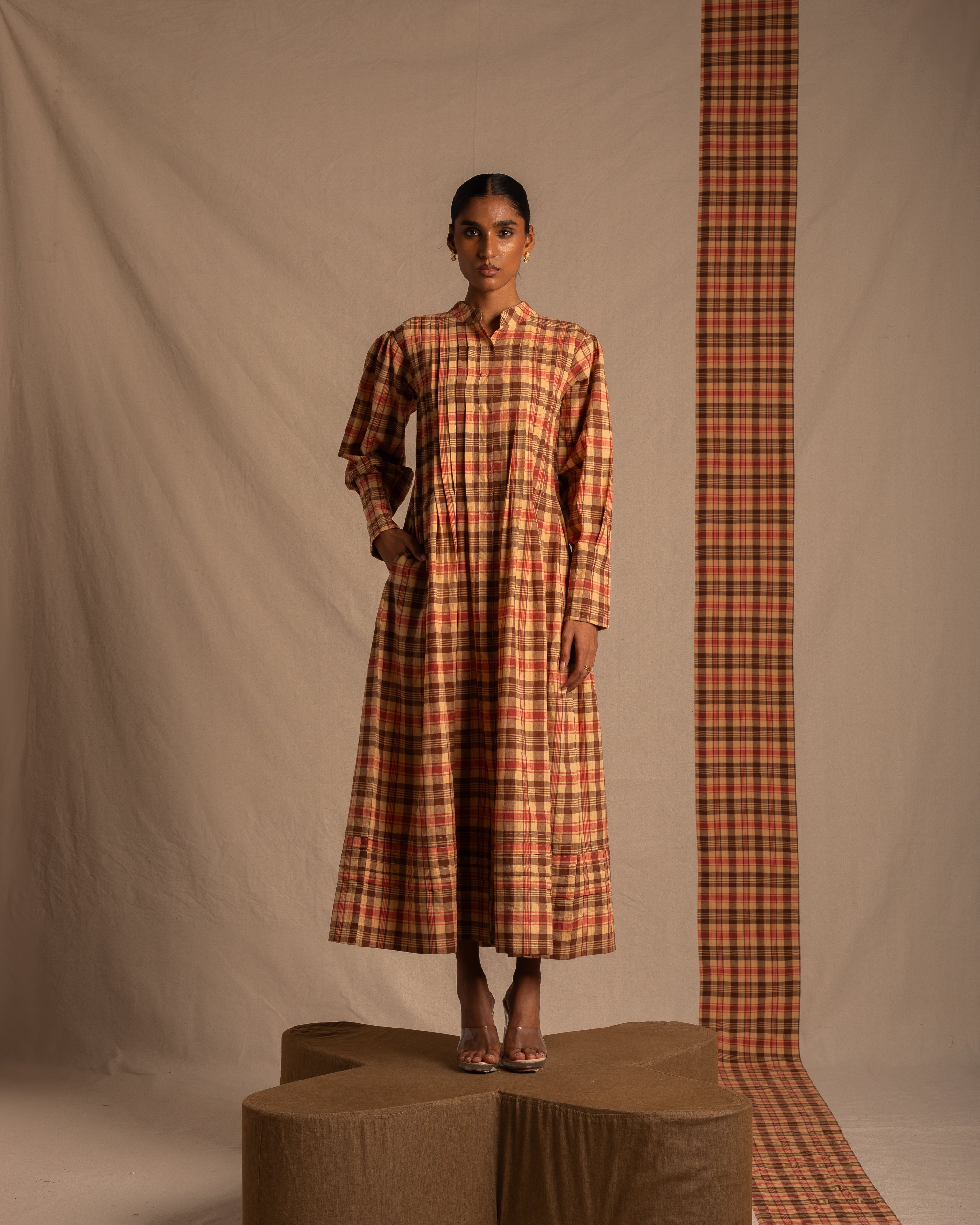 Long brown chequered dress with a relaxed fit and full sleeves with pleat detailing running all through the dress