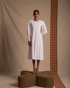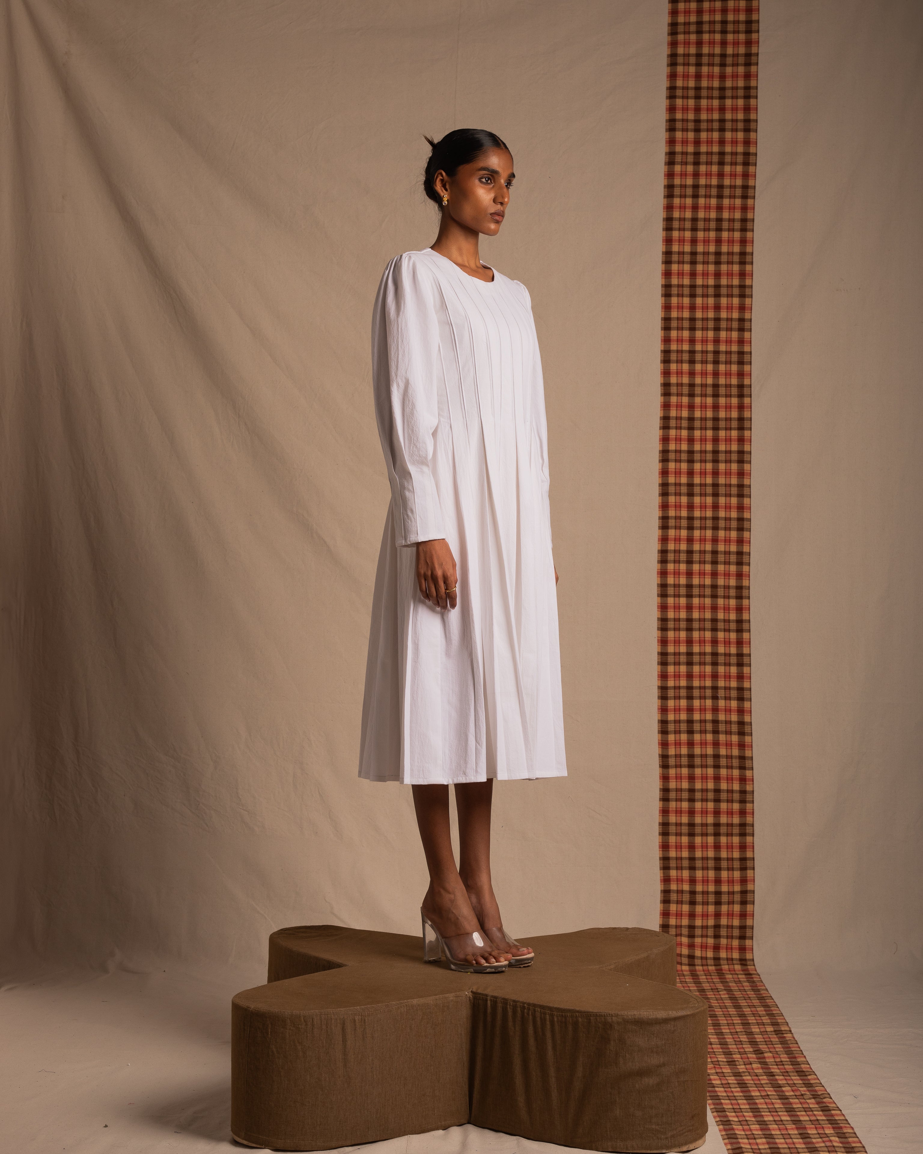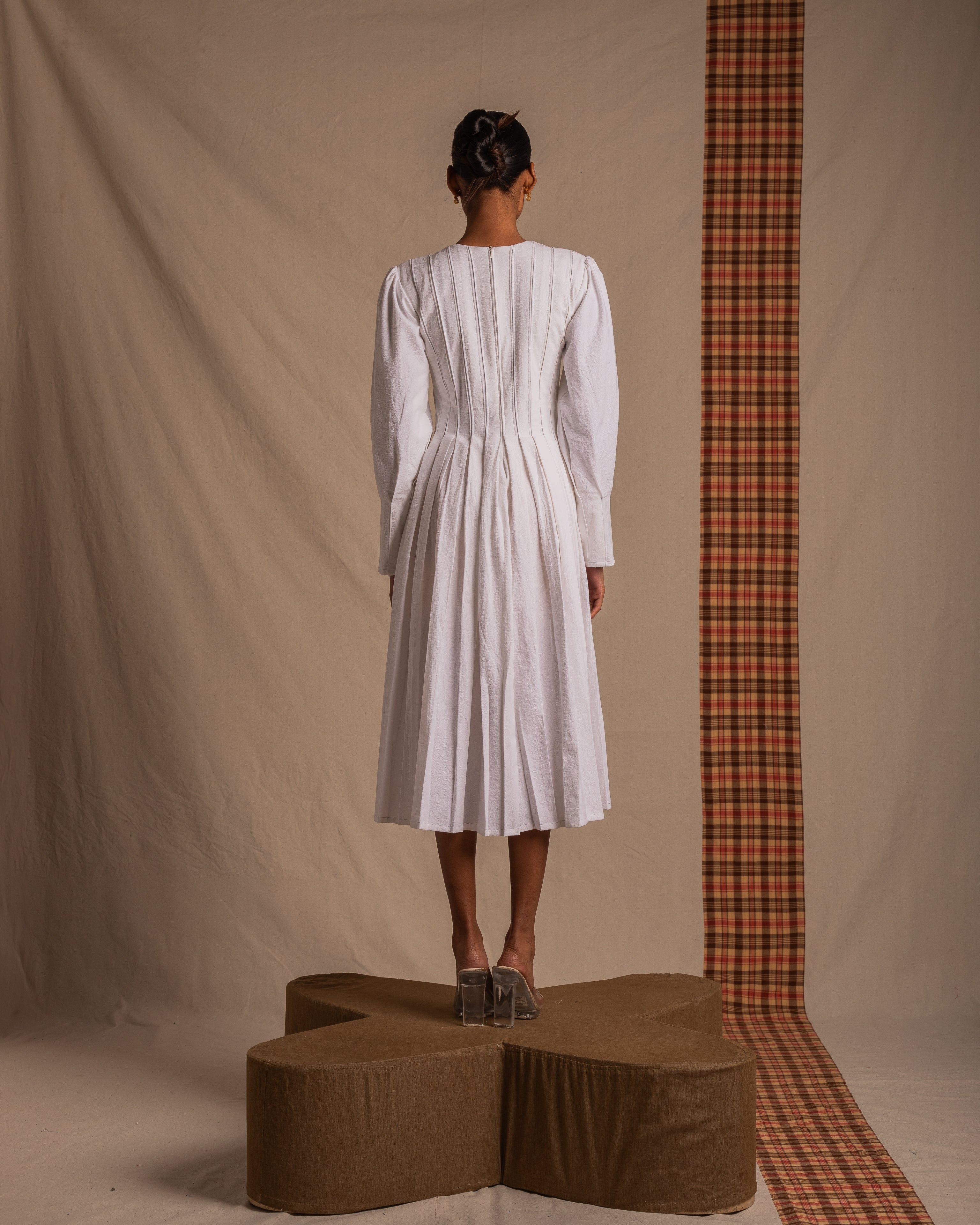White midi well fitted dress with box pleat detailing on the body and sleeves.