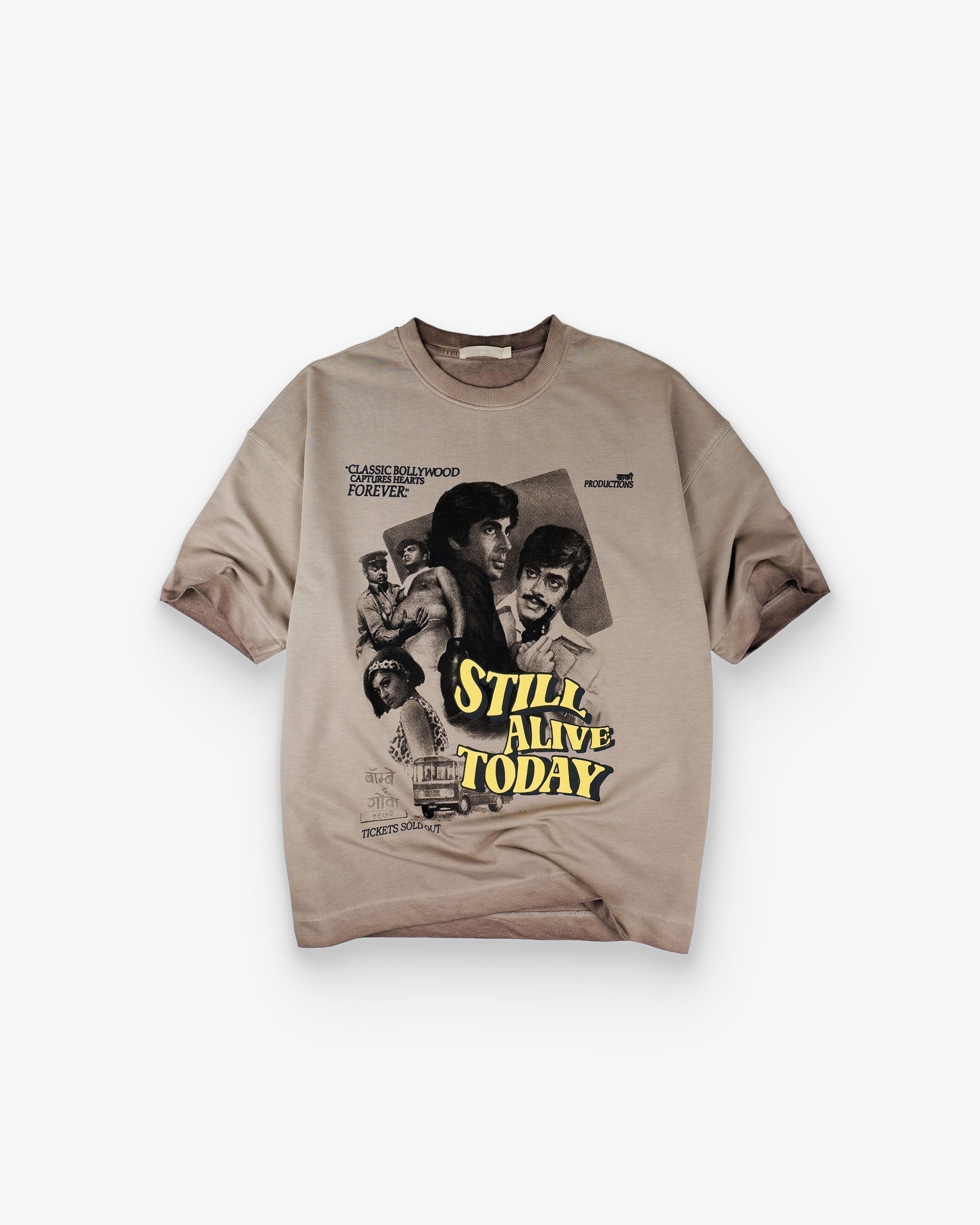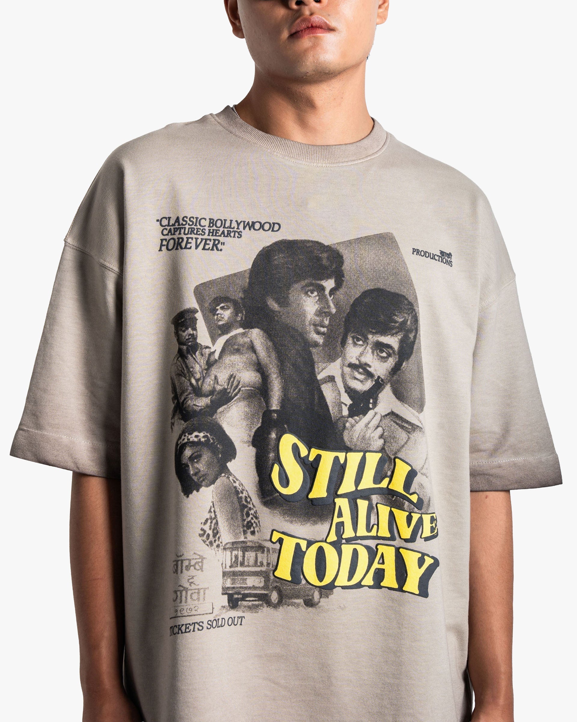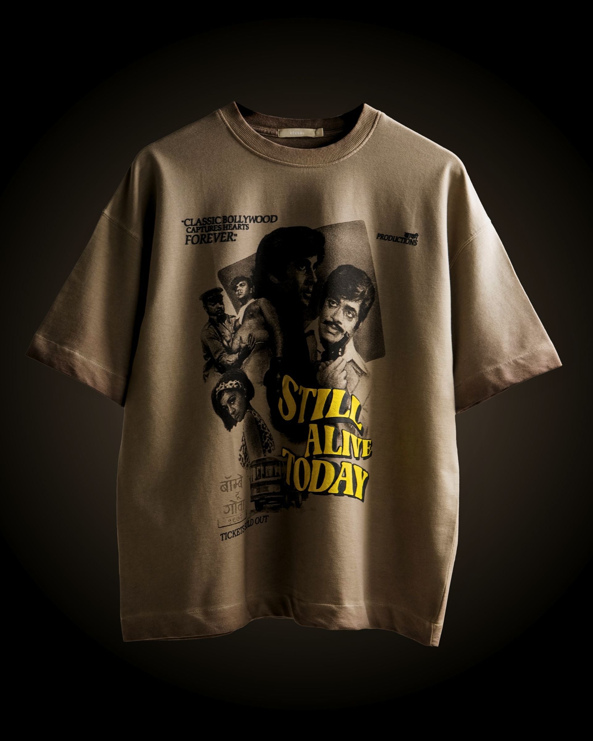 Celebrate the golden age of cinema with the Khaaki Productions Limited Edition t-shirt—an exclusive oversized unisex tee crafted from 250 GSM Cotton Spandex Terry with a pigment-washed finish for that perfect vintage, lived-in look. Paying homage to classic Bollywood cinema, the design showcases legendary film stars in a retro movie-poster style print with bold typography—making it a true collector’s piece for fans of retro fashion and graphic streetwear.