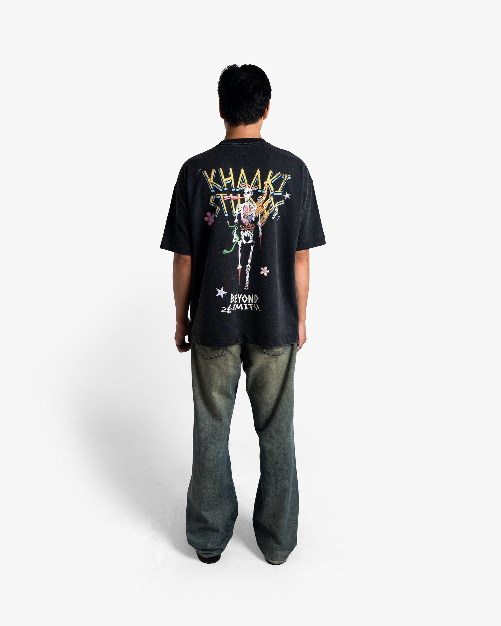 Featuring striking hand-drawn graphics—a stylized skeleton with vibrant accents and edgy text. Designed with a drop-shoulder silhouette, oversized relaxed fit, and unisex appeal, the Khaaki Studios tee pairs seamlessly with baggy jeans, cargos, or street-style outerwear—elevating any modern wardrobe.