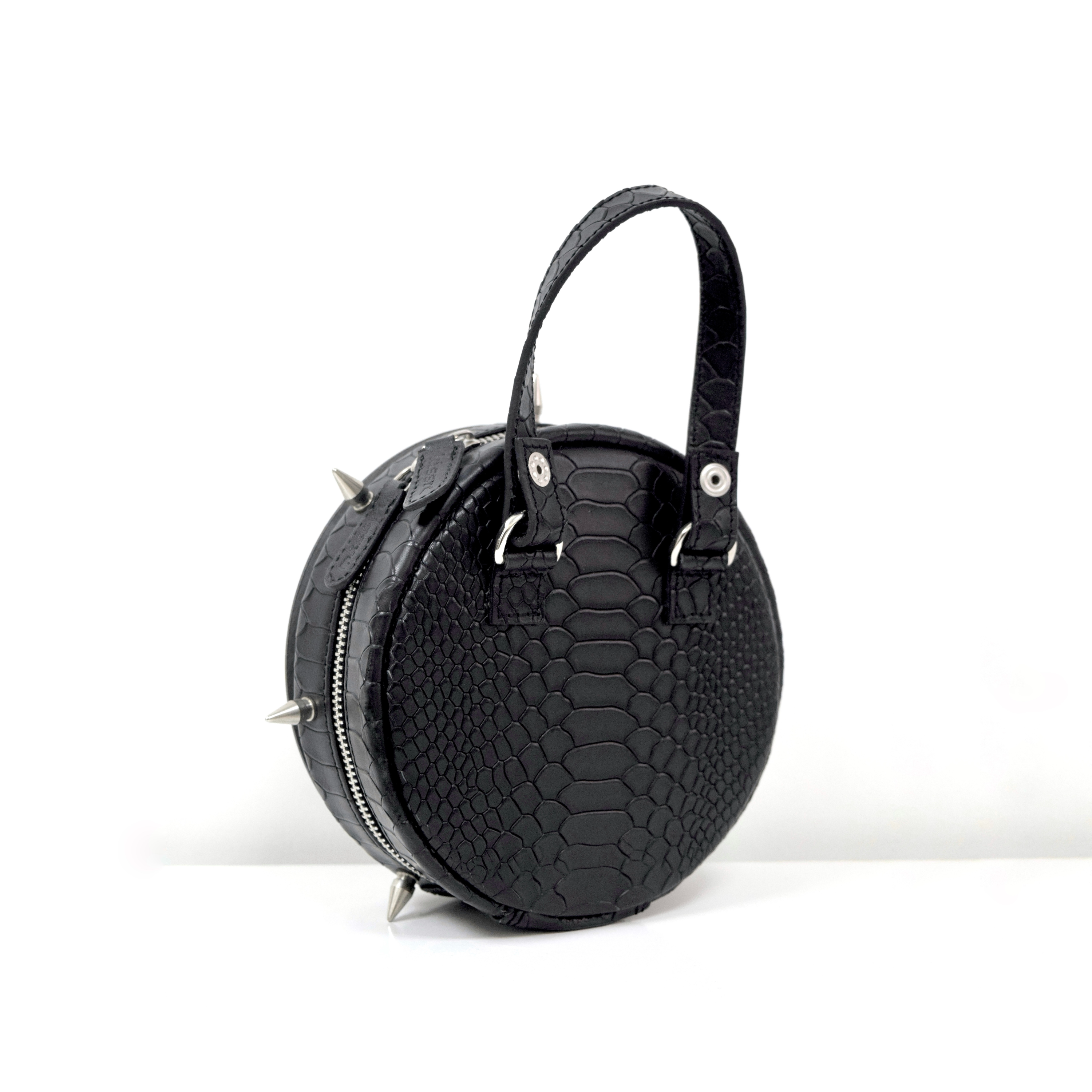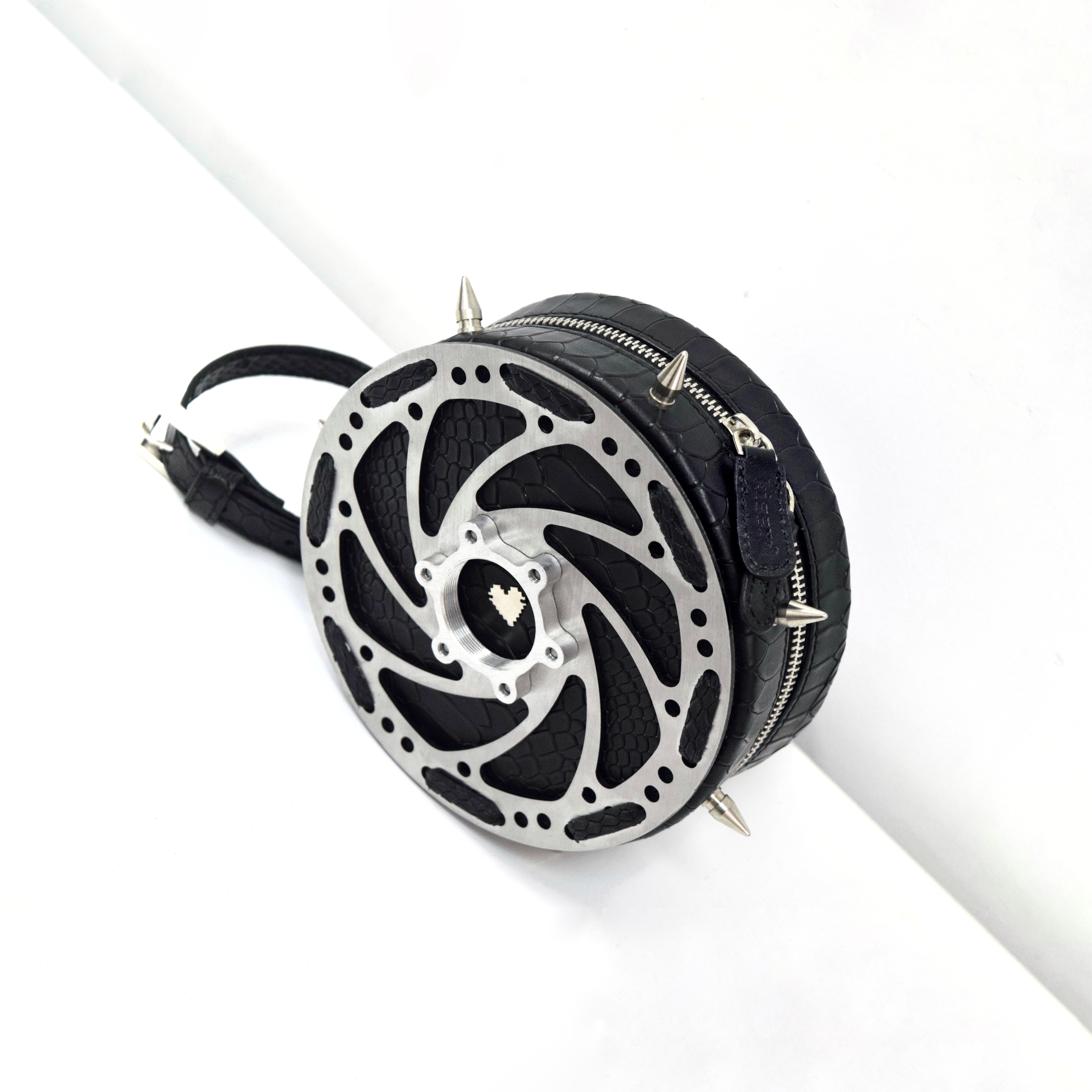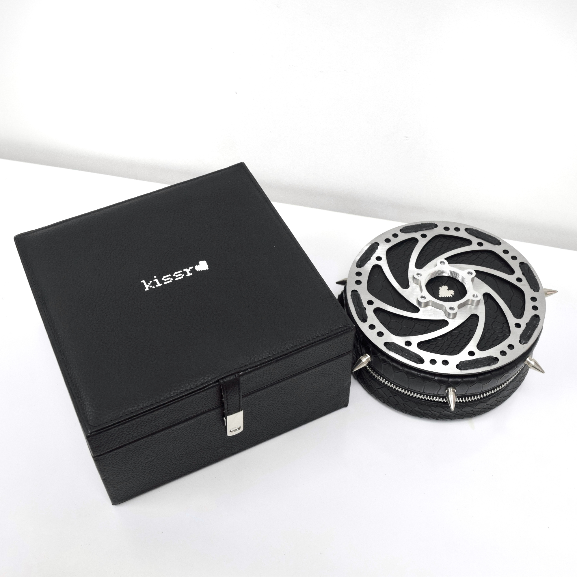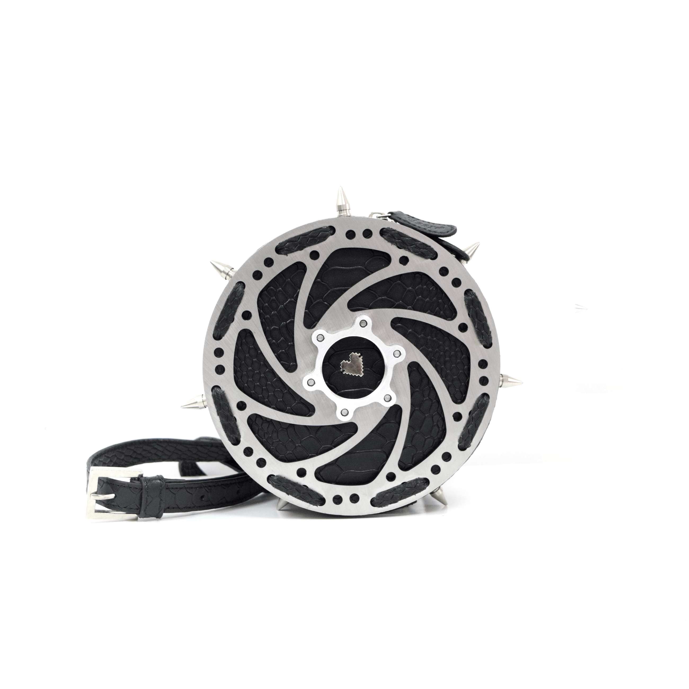 The world of Kissr evolves with the introduction of Killshot. It is the first step towards a line that will make use of multiple elements to create seamless designs. Killshot is a round mini leather bag with a stainless steel disk screwed on the front with the Kissr heart in the centre. The accessory is enhanced with evenly spaced spikes around the circumference of the bag.