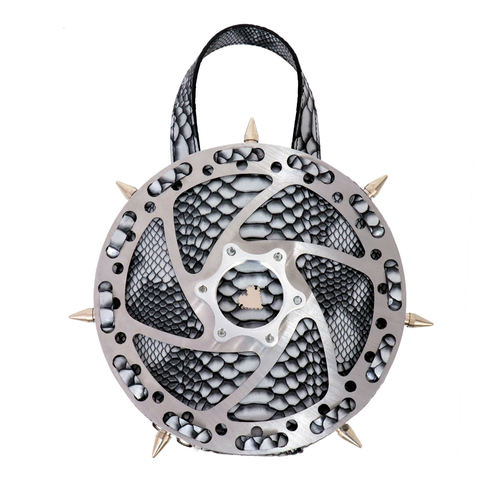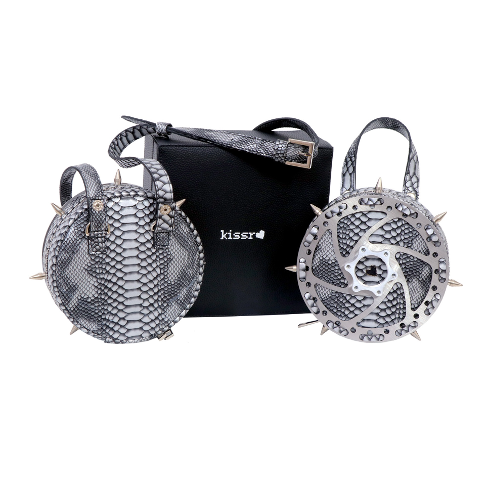 The world of Kissr evolves with the introduction of Killshot. It is the first step towards a line that will make use of multiple elements to create seamless designs. Killshot is a round vegan leather bag with a stainless steel disk screwed on the front with the Kissr heart in the centre. The accessory is enhanced with evenly spaced spikes around the circumference of the bag.
