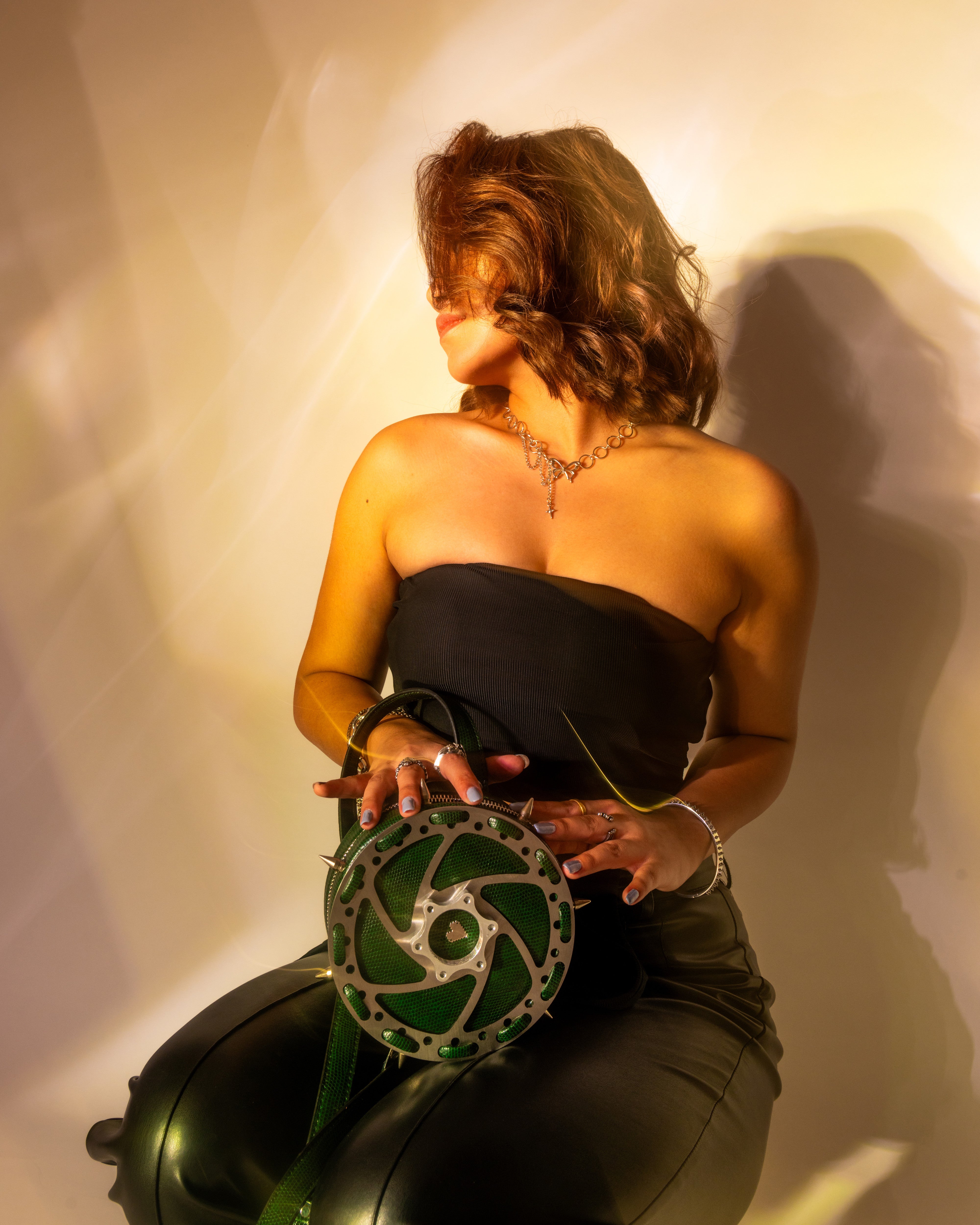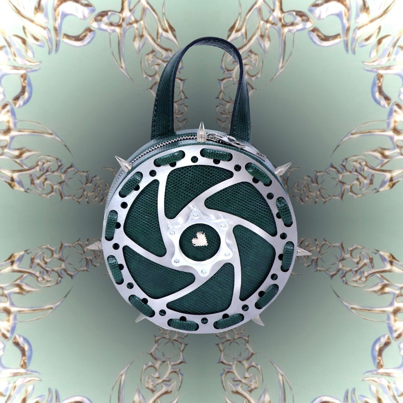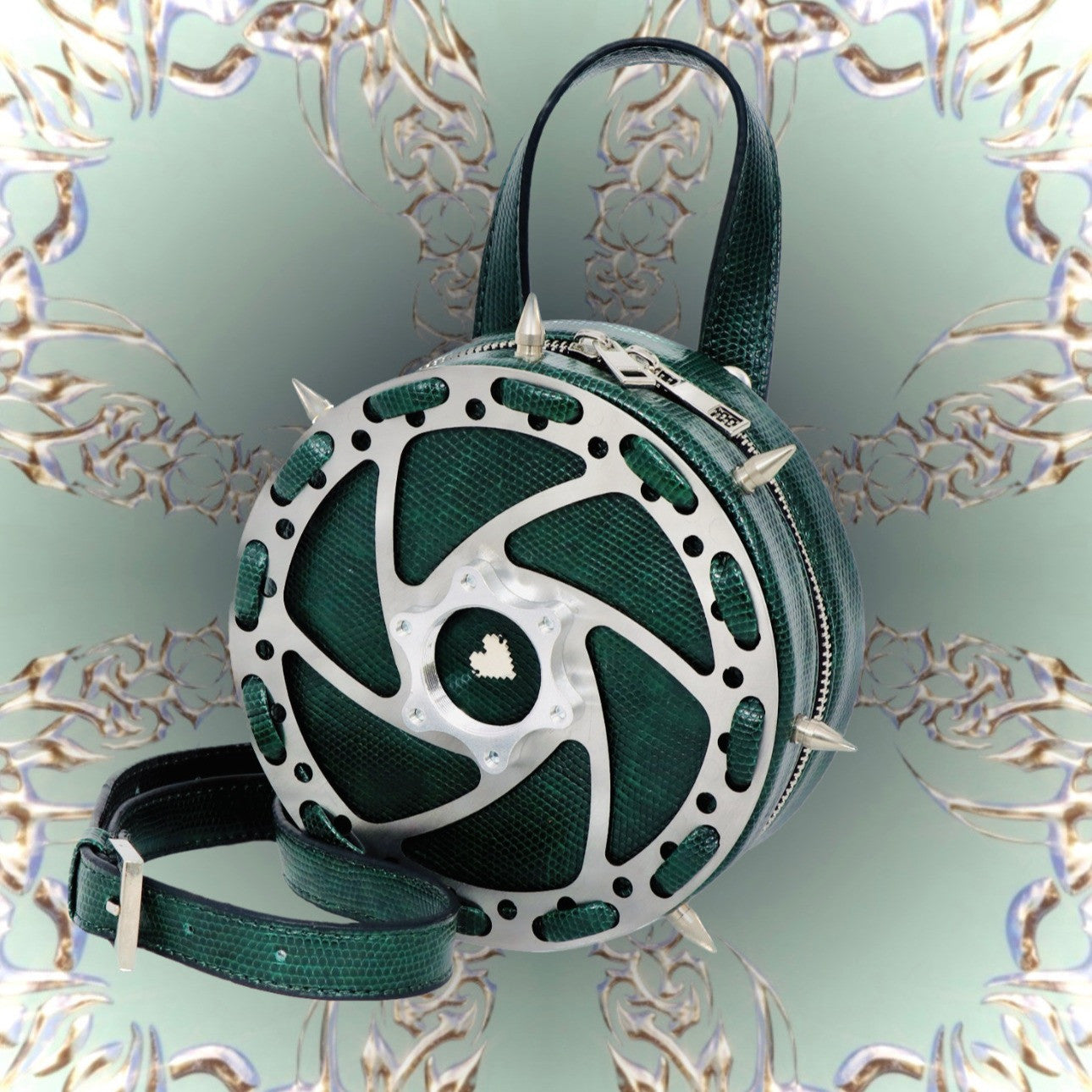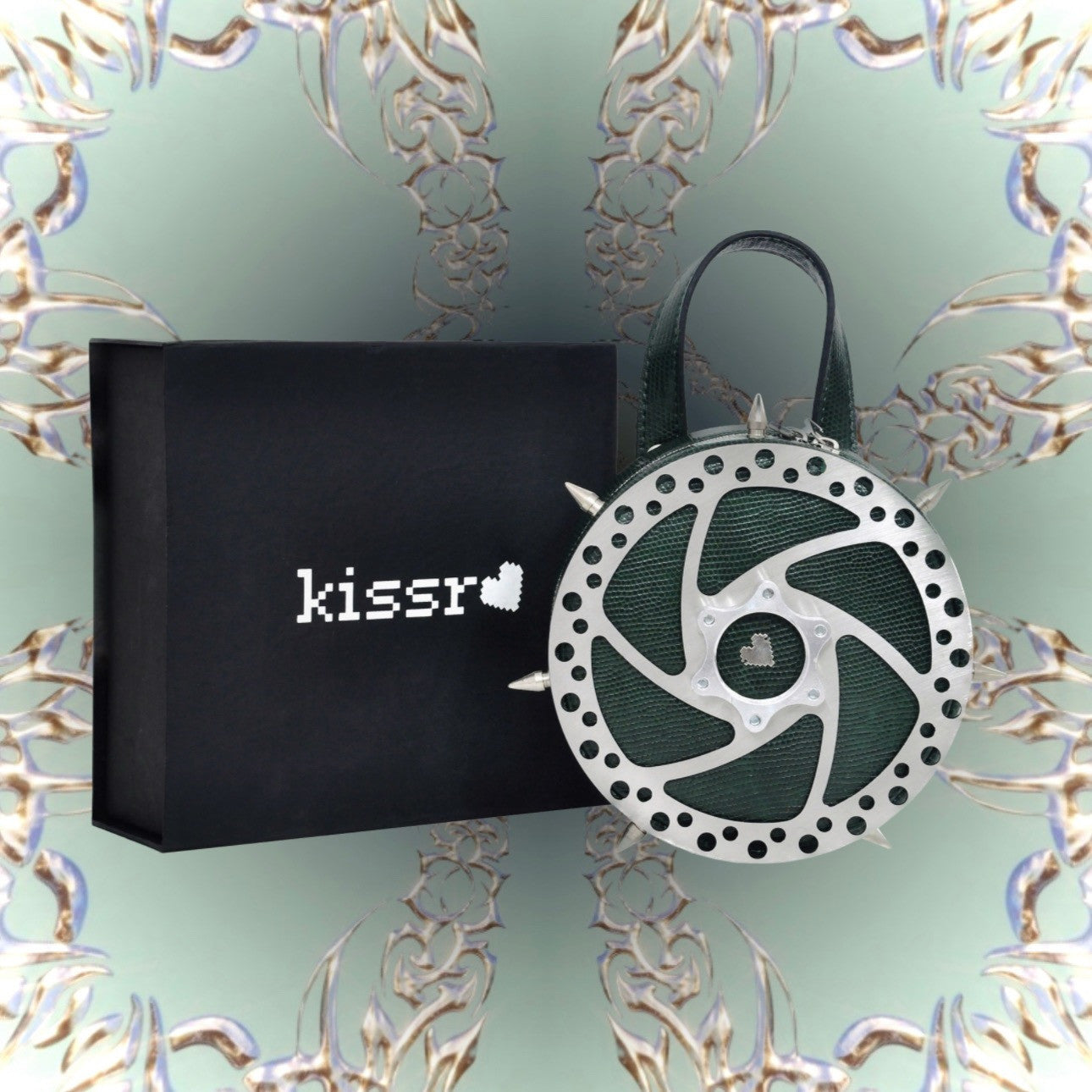 Killshot is a round vegan leather bag with a stainless steel disk screwed on the front with the Kissr heart in the centre.