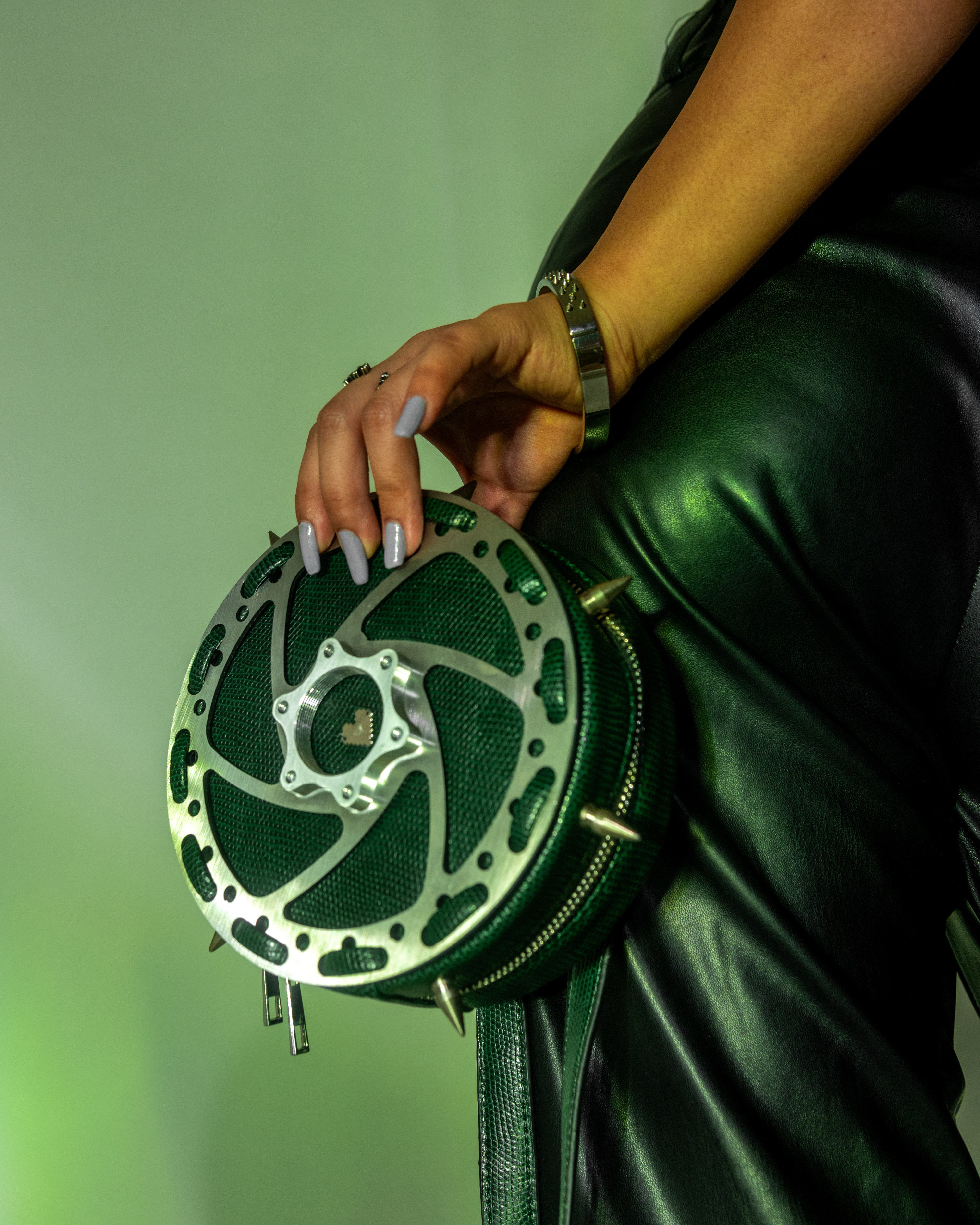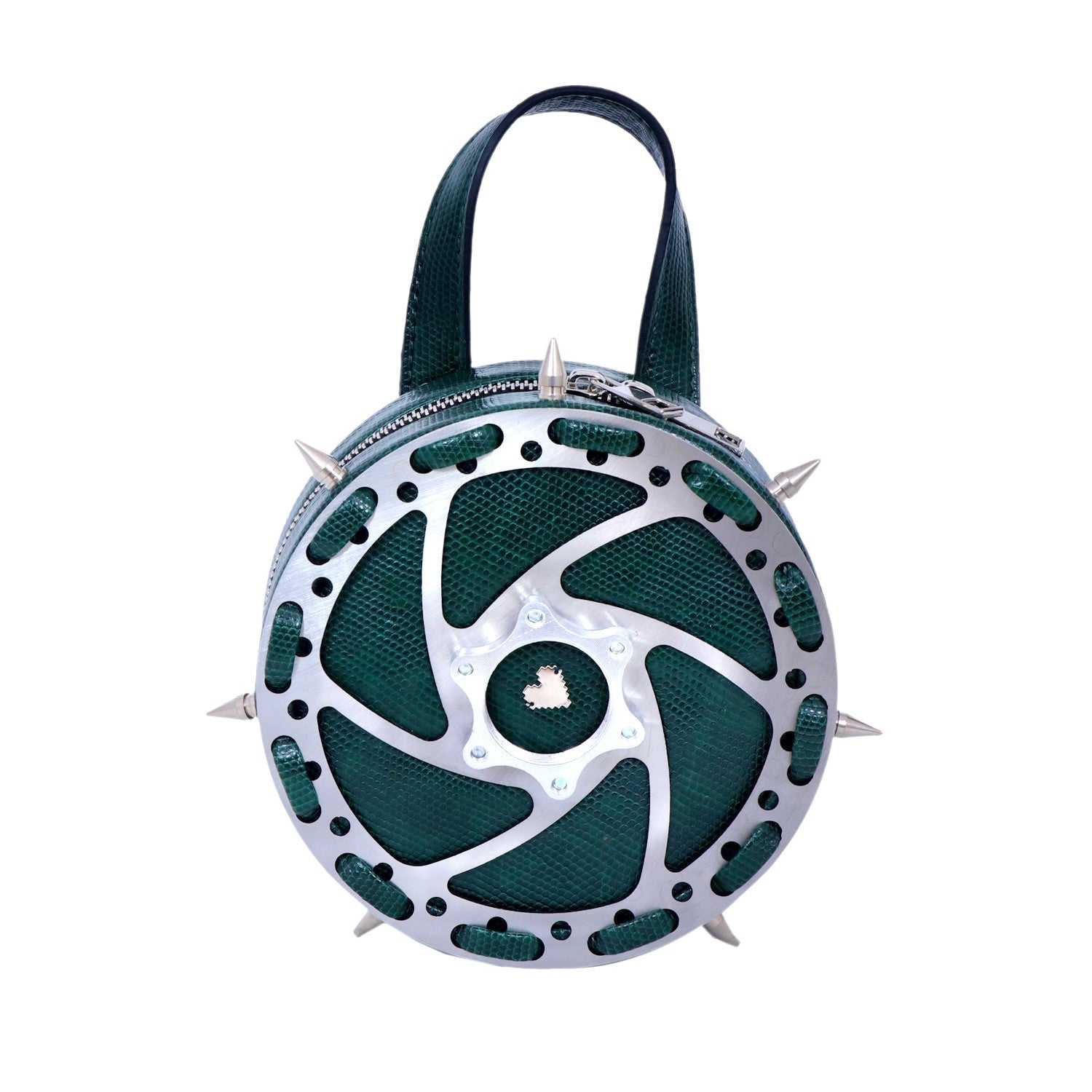 The accessory is enhanced with evenly spaced spikes around the circumference of the bag.