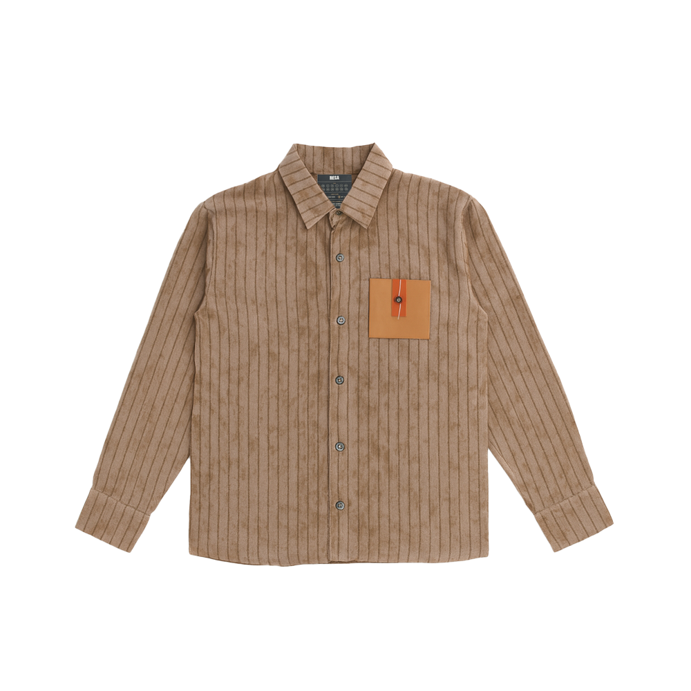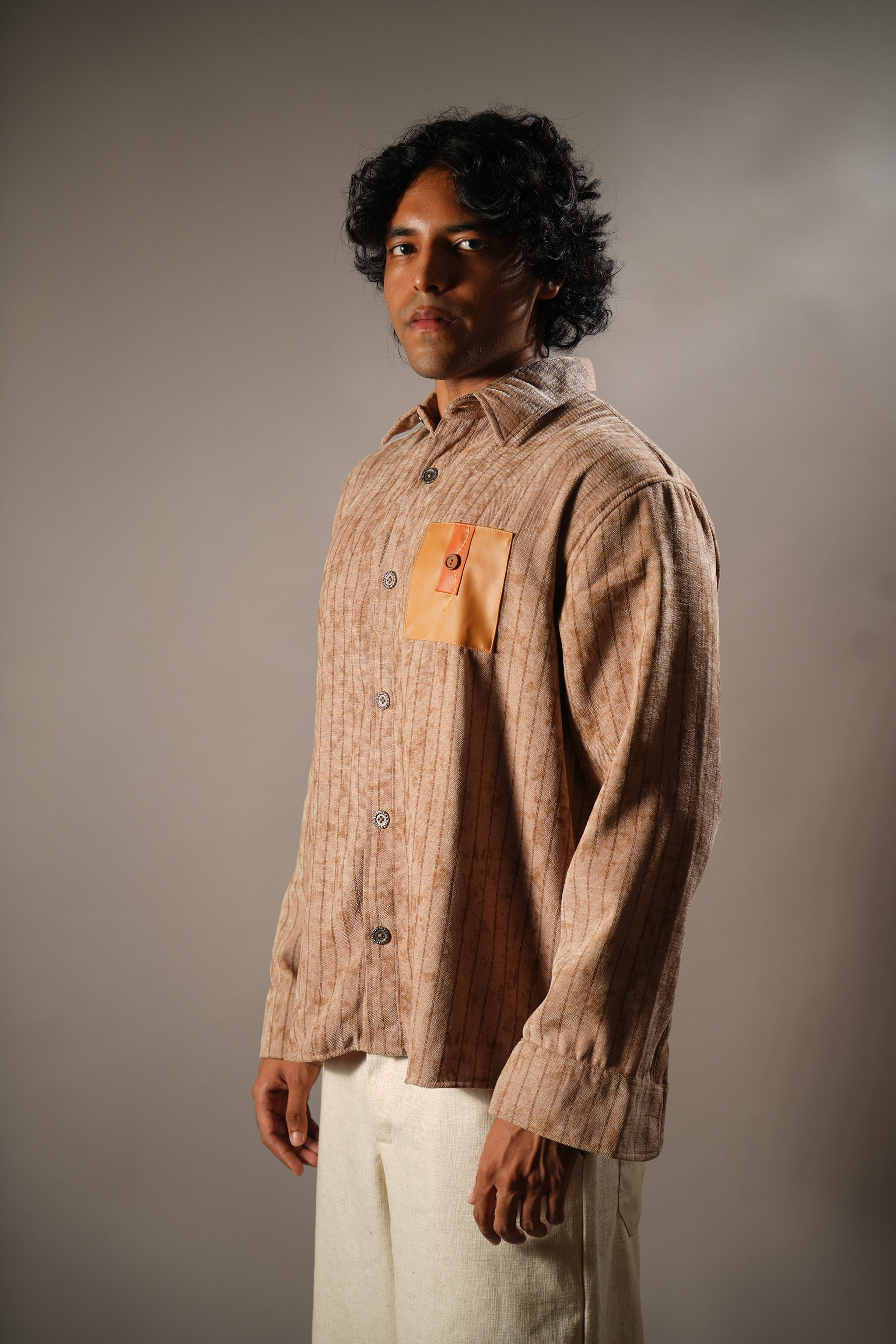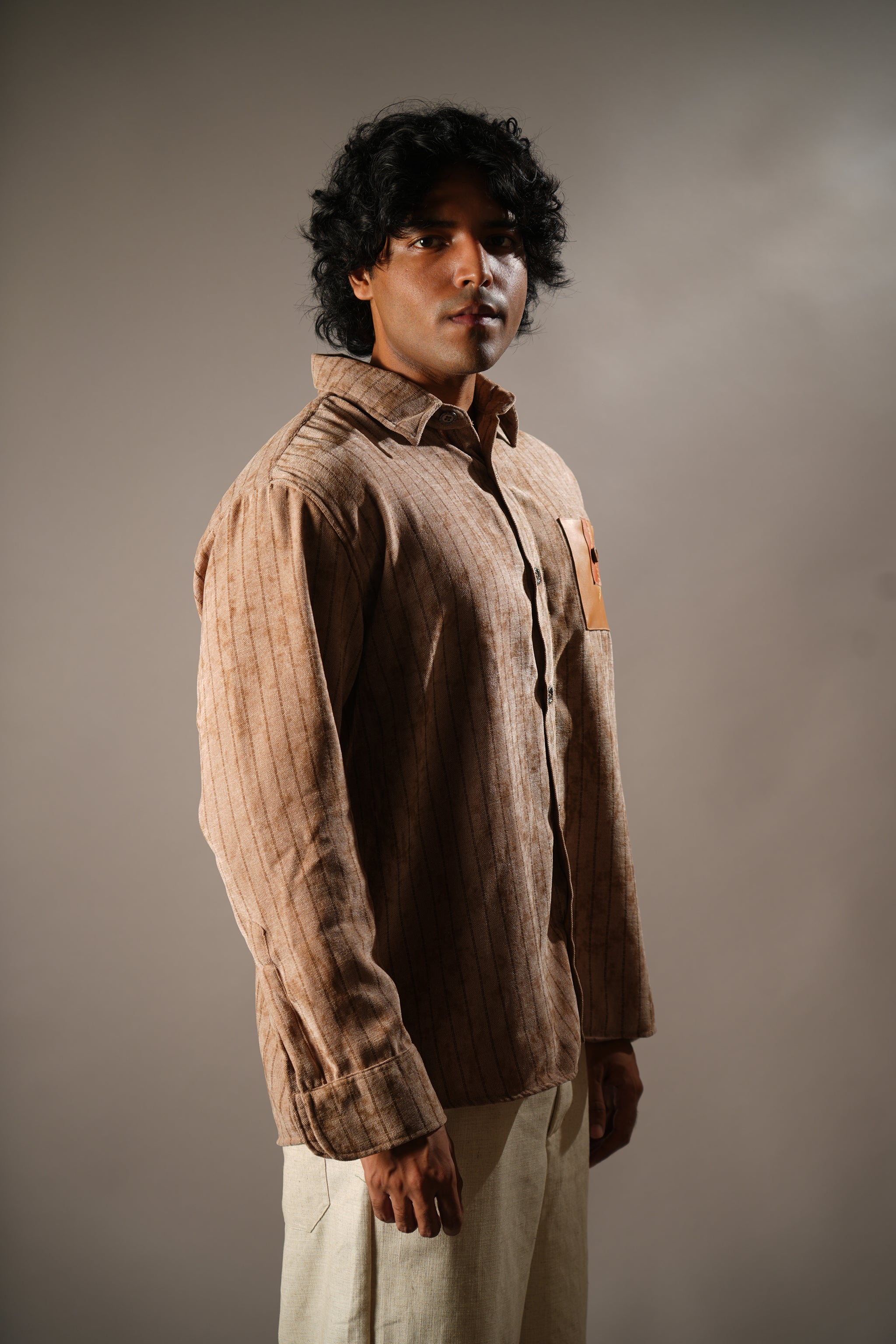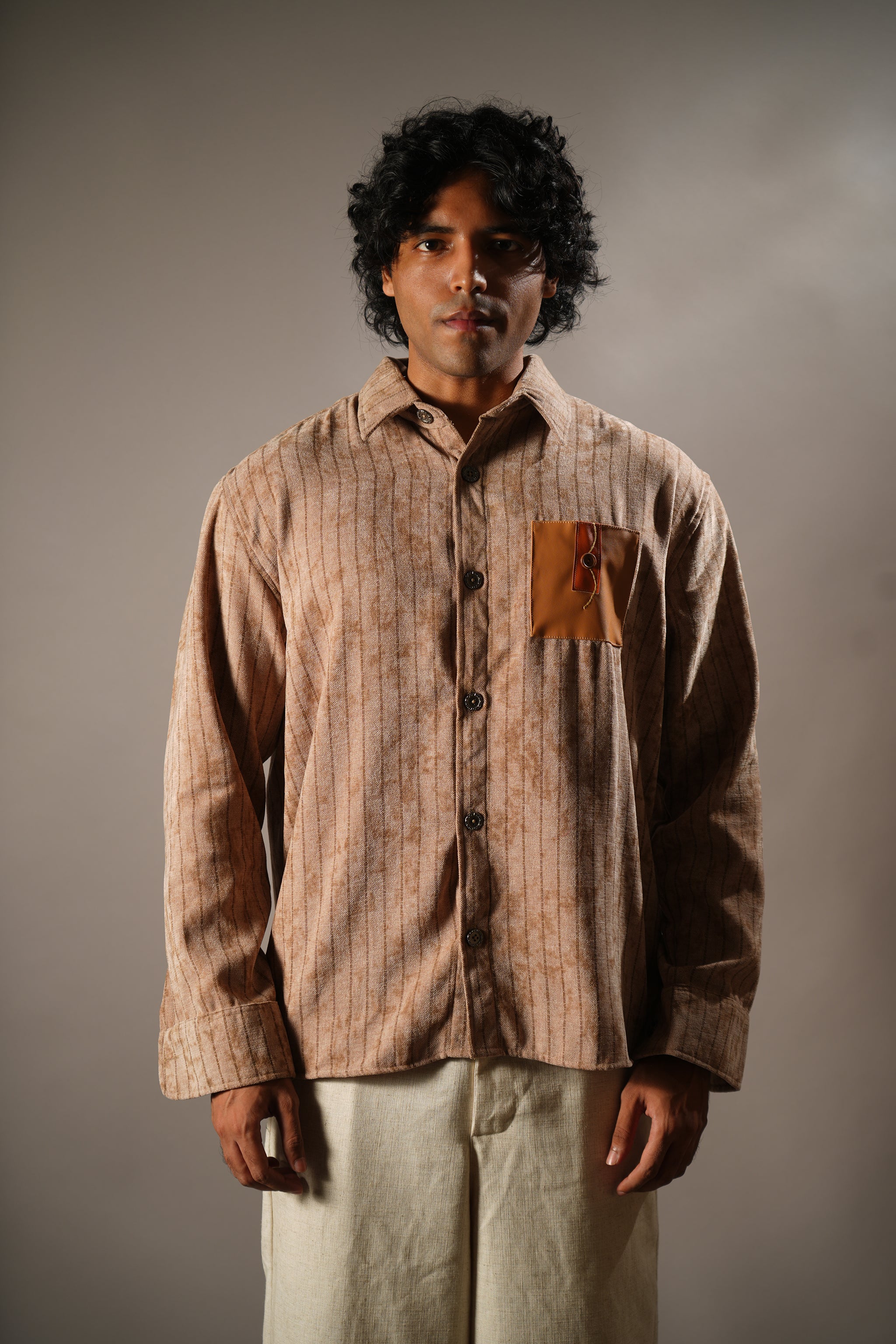 Design - Muted striped shirt with a leather pocket patch, inspired by age-old Indian kitaabs and the textures of ancient manuscripts.