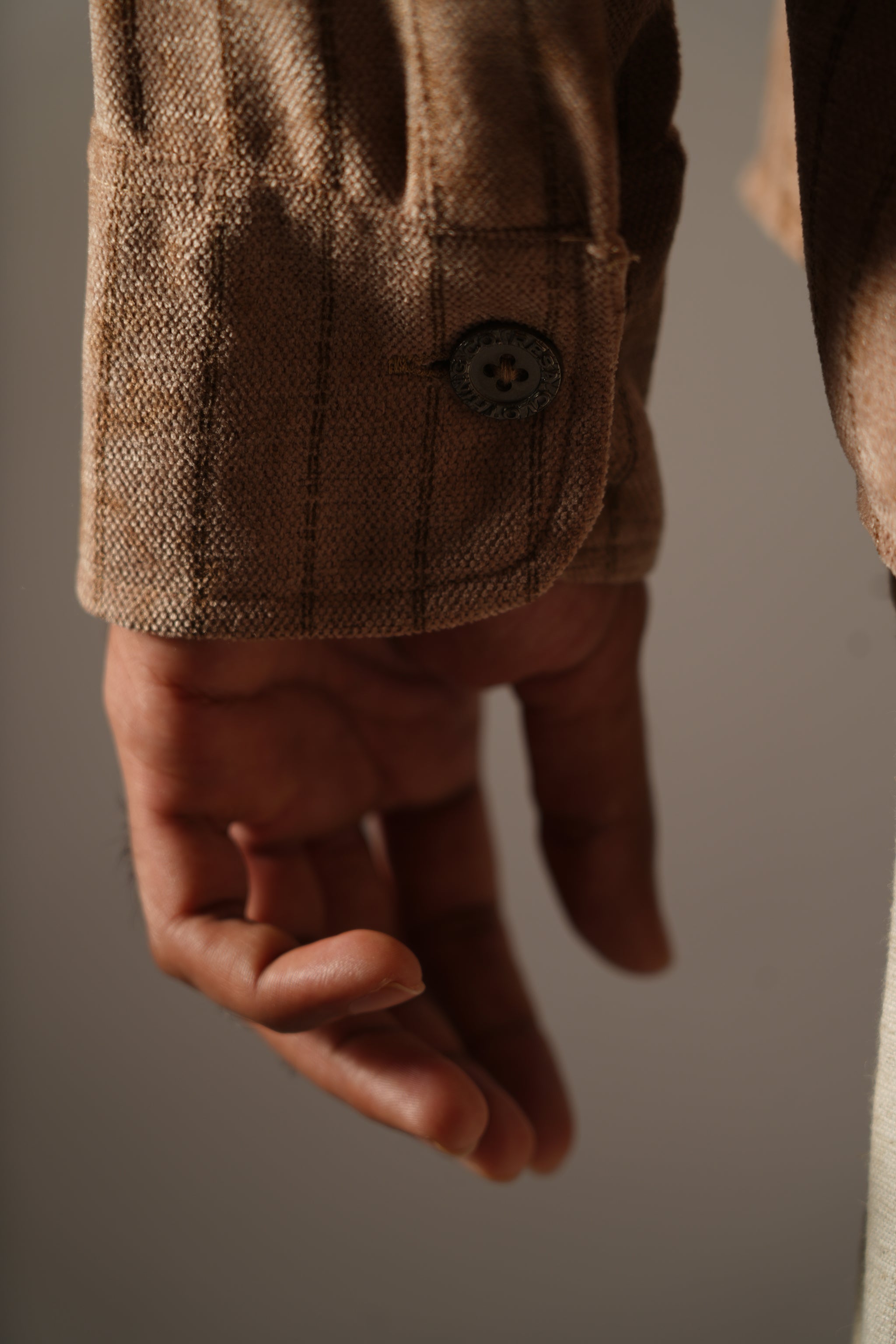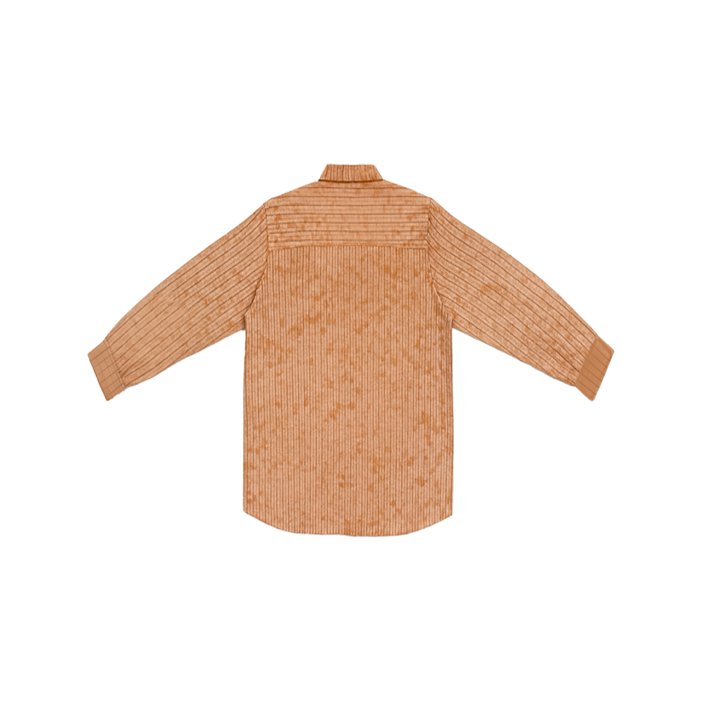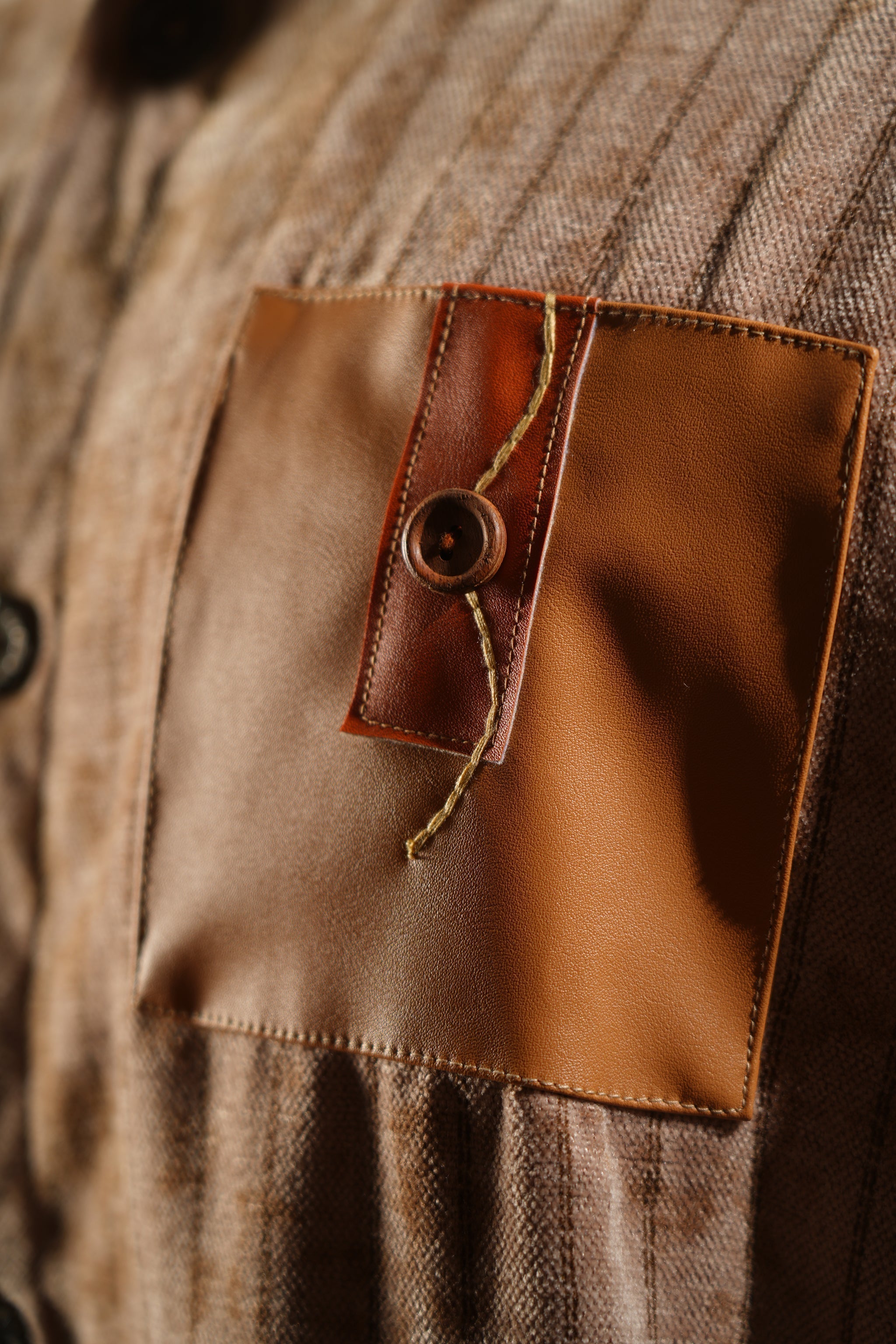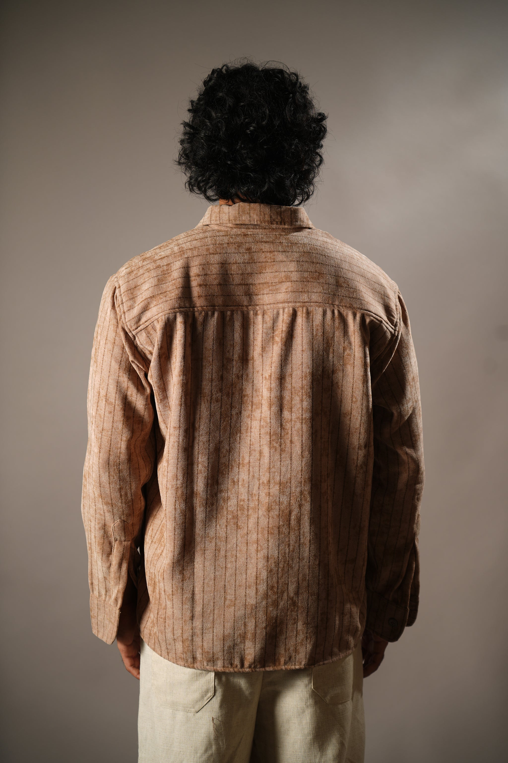 Design - Muted striped shirt with a leather pocket patch, inspired by age-old Indian kitaabs and the textures of ancient manuscripts.