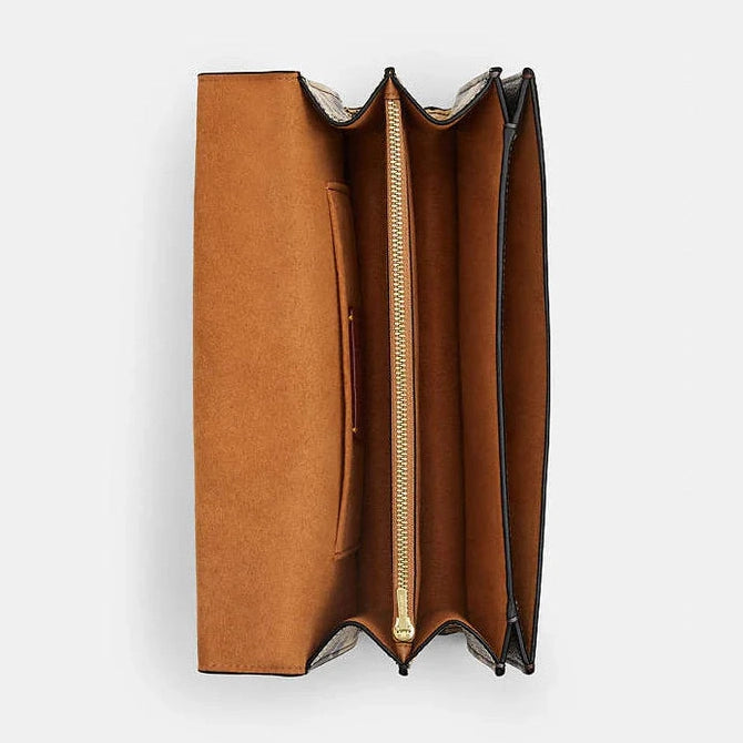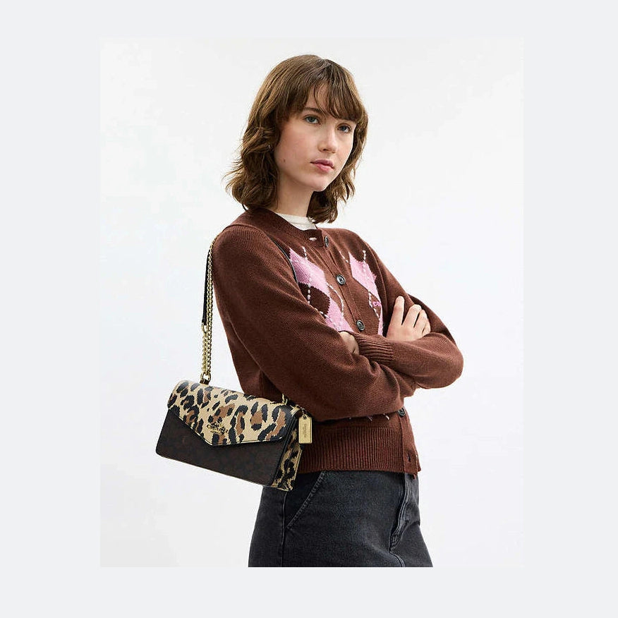 The Coach Klare Envelope Crossbody Bag expertly blends signature canvas with striking leopard print pebbled leather for a bold, fashionable statement. Its compact envelope design offers a sleek silhouette while providing convenient crossbody functionality for hands-free carrying. This bag balances distinctive style with practical usability, making it a versatile accessory for both casual outings and refined occasions.