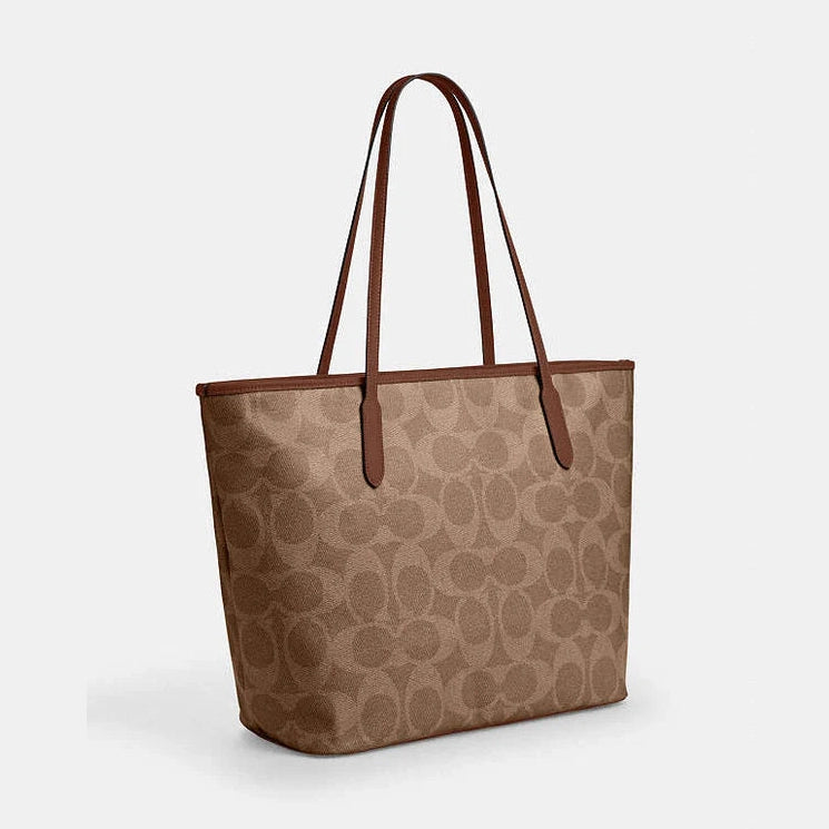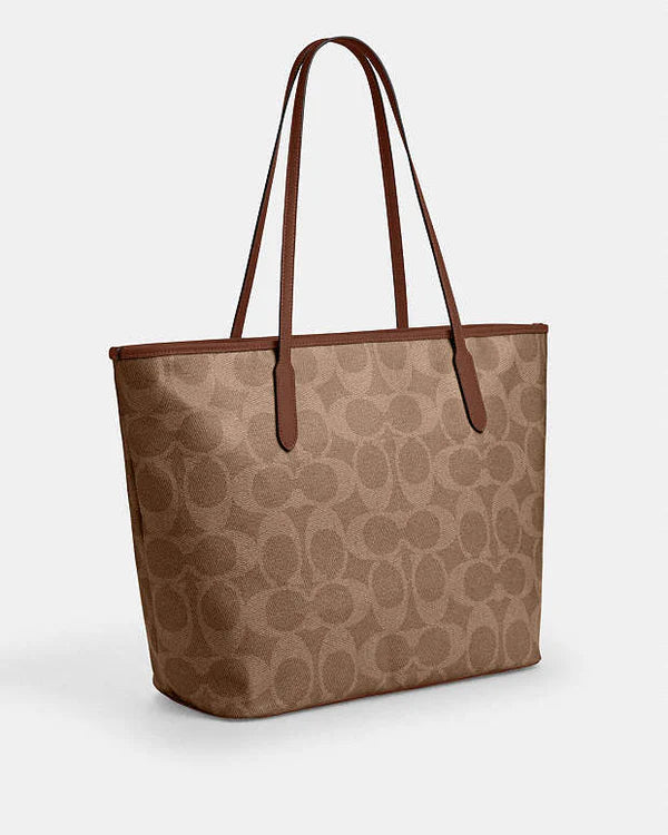 The Coach Large City Tote Bag in Maxi Signature Canvas features a spacious design crafted from durable signature canvas in gold, tan, and brown hues. Its roomy interior and sturdy construction make it ideal for carrying daily essentials with ease, while the classic color palette adds timeless elegance. This tote is perfect for professionals and style-conscious individuals who need both functionality and sophistication in a versatile everyday bag.