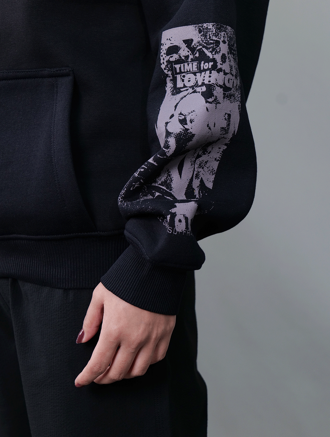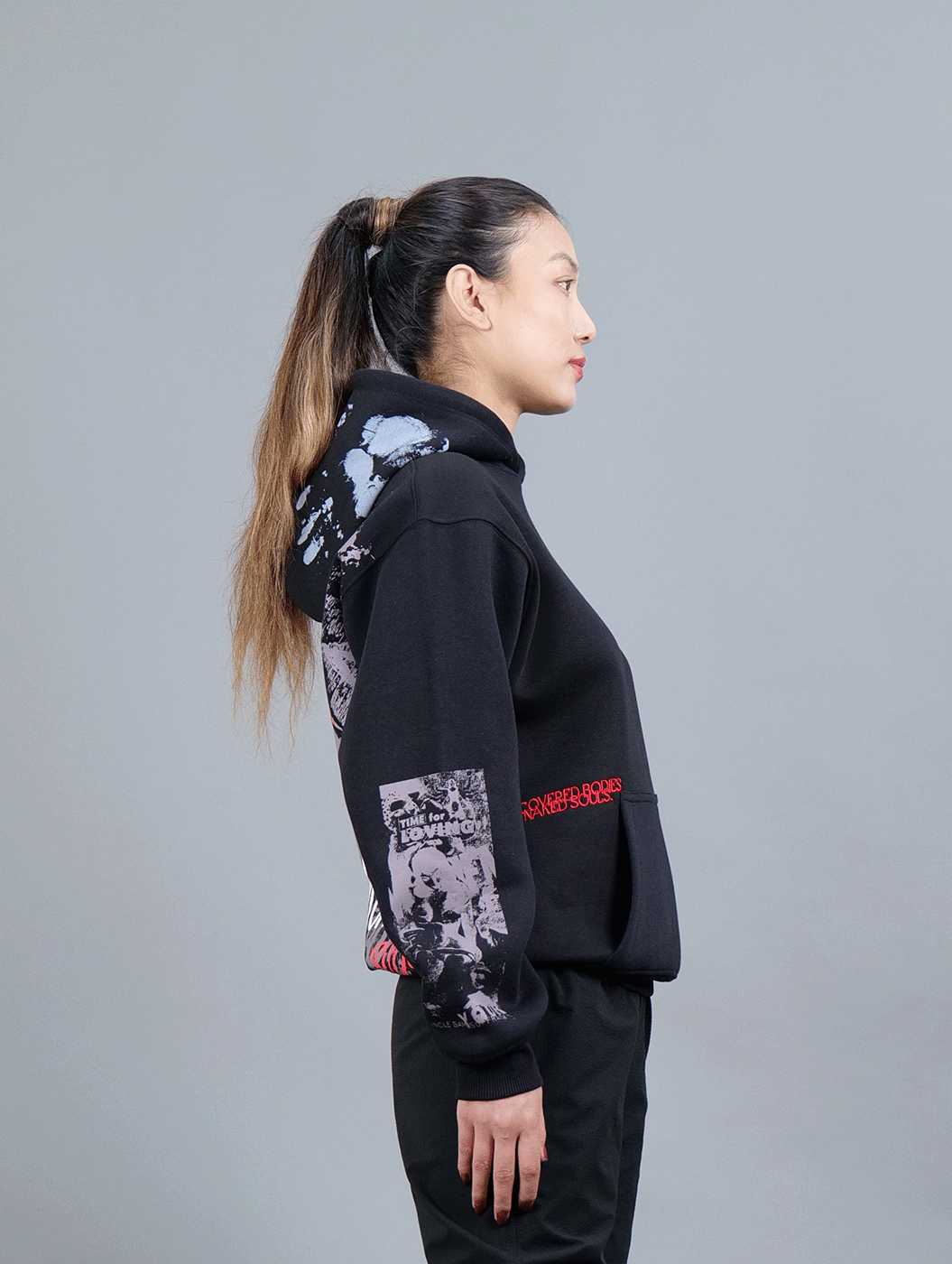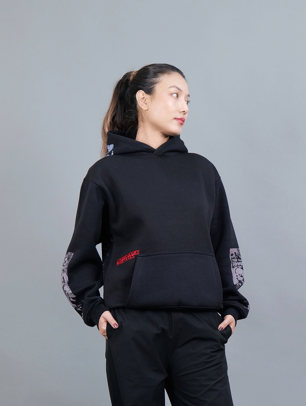 Crafted in classic black, this cropped hoodie features heavy graphic prints on the back and sleeves, paired with intricate embroidery on the front. With a statement-making design and a sleek, modern fit, it’s built for those who dare to stand out.
