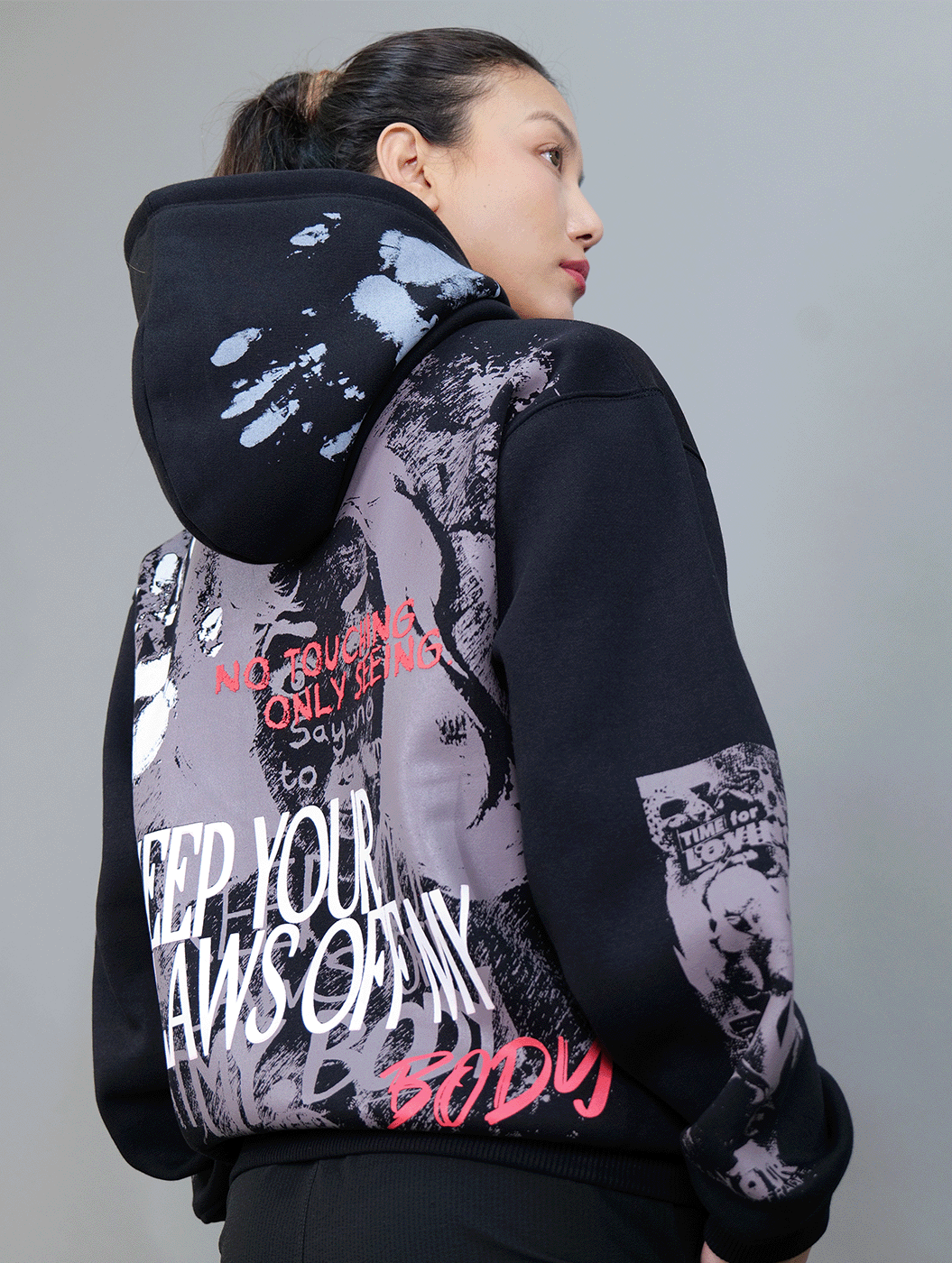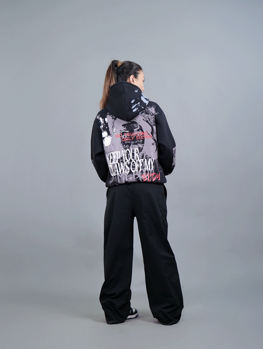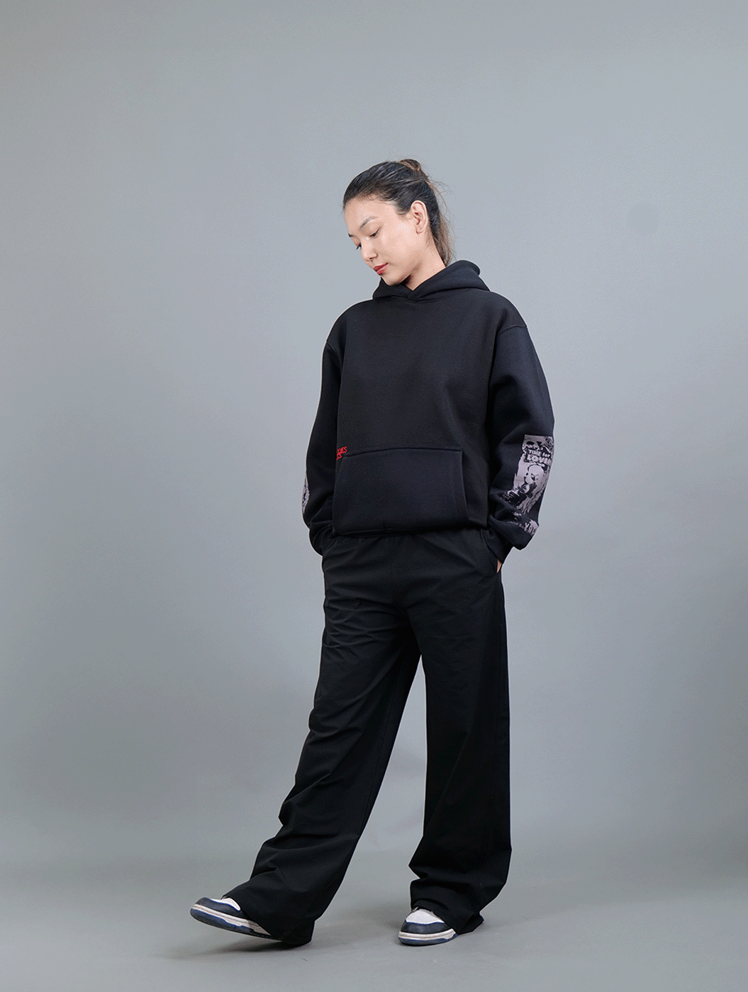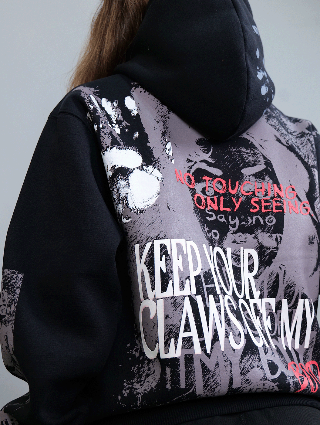 Crafted in classic black, this cropped hoodie features heavy graphic prints on the back and sleeves, paired with intricate embroidery on the front. With a statement-making design and a sleek, modern fit, it’s built for those who dare to stand out.