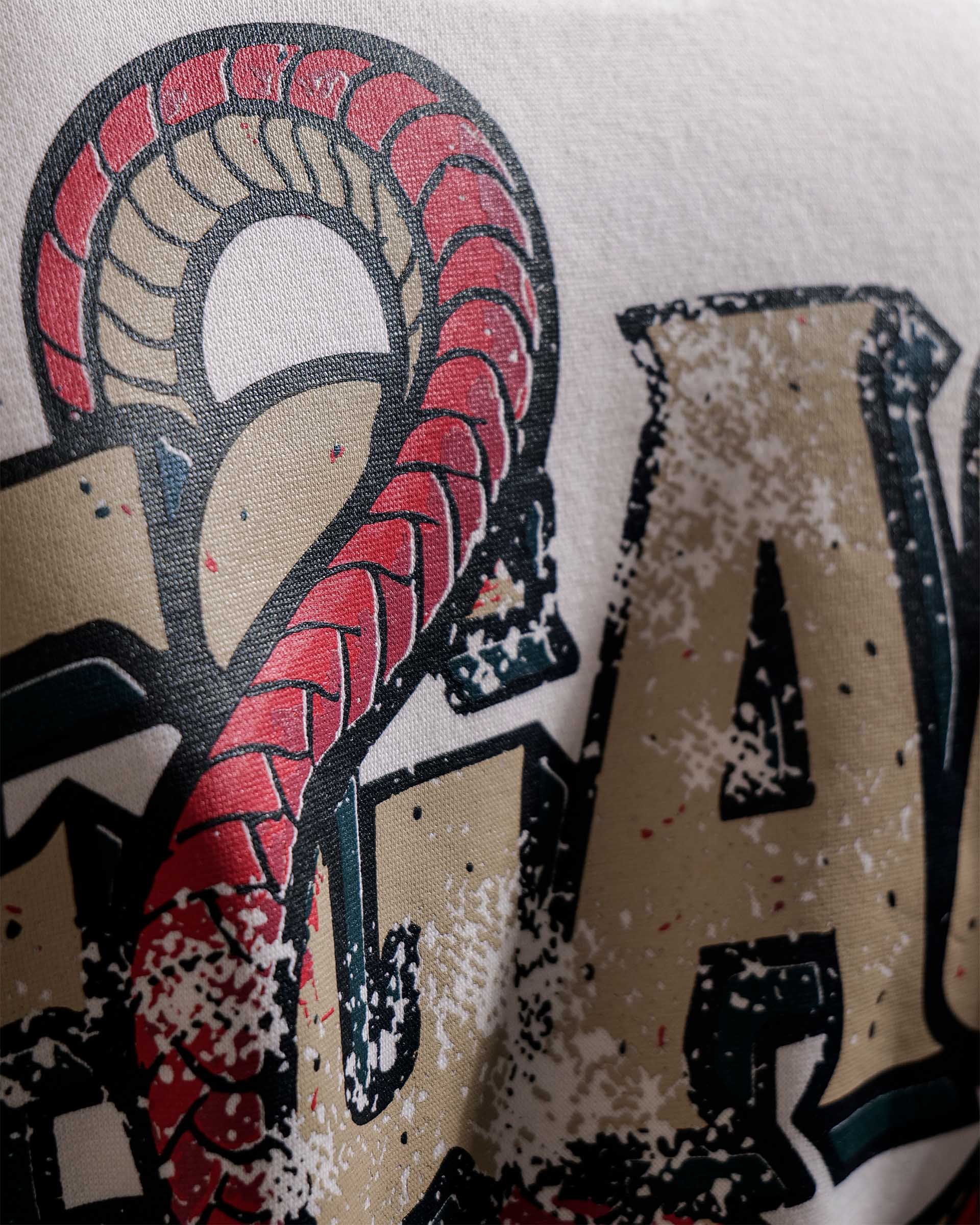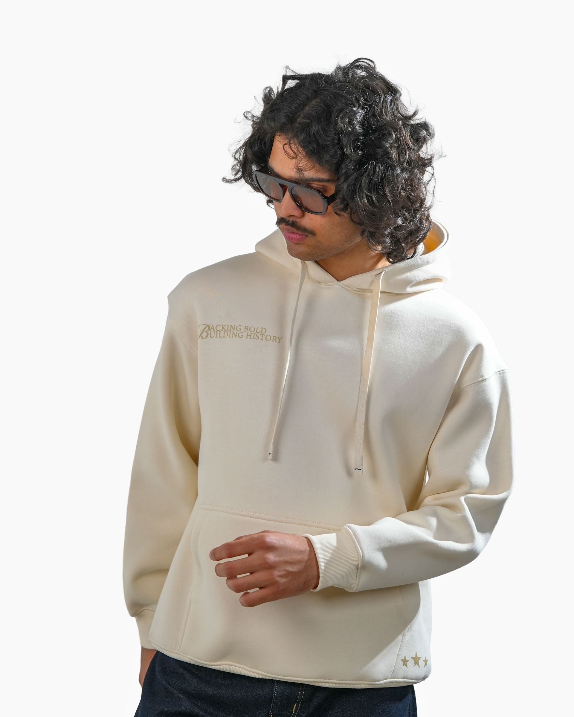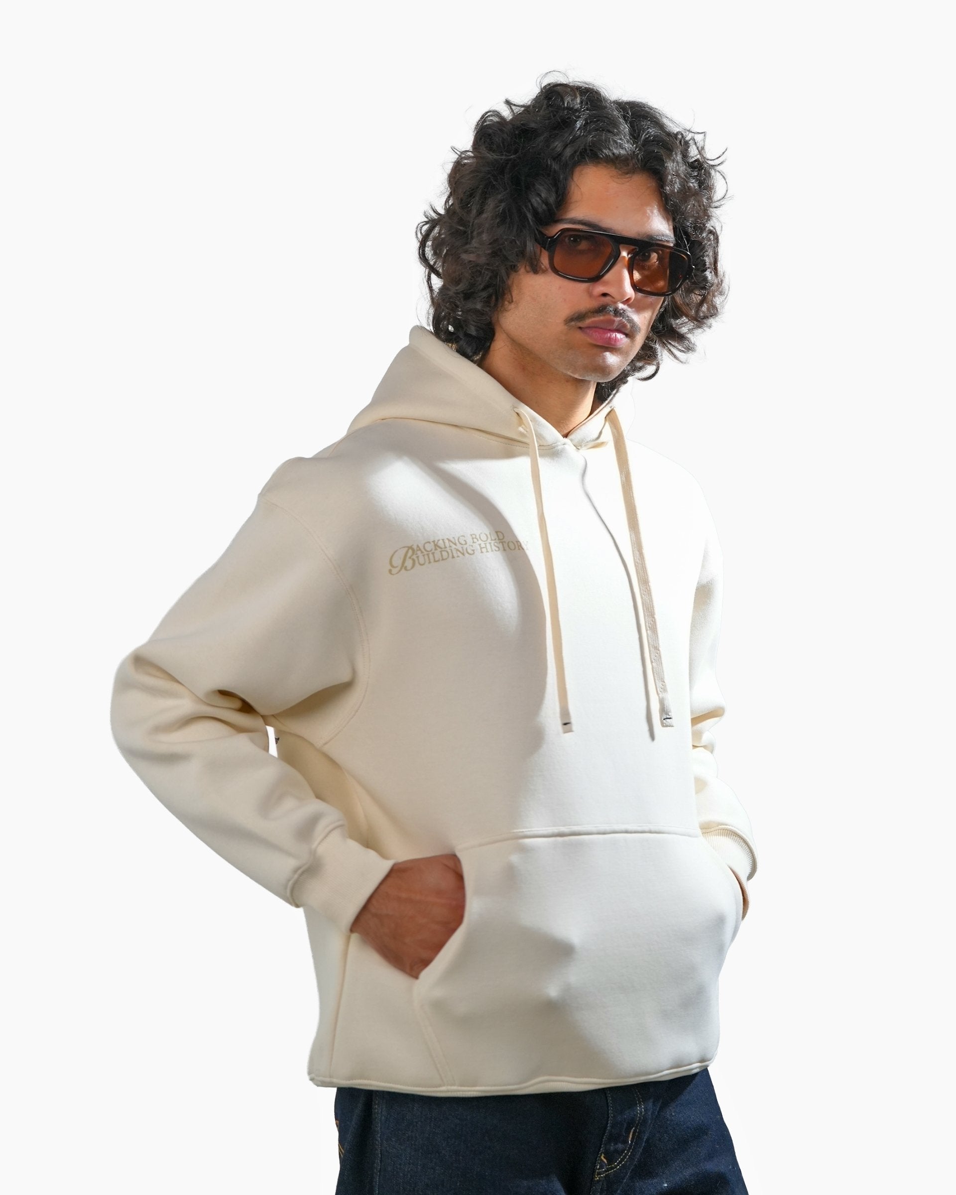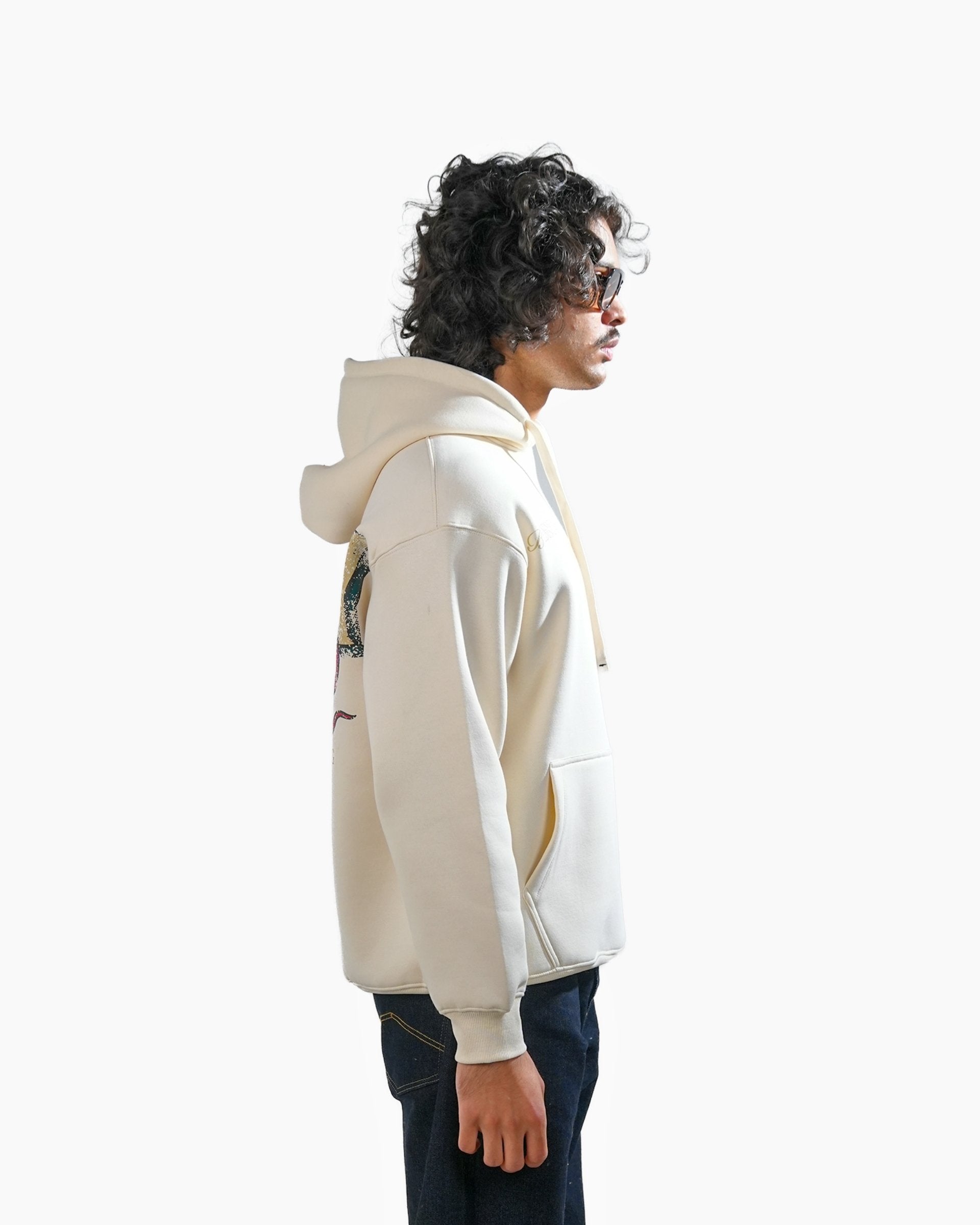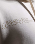 The Legacy hoodie in off white is constructed from heavyweight 400 GSM three-thread cotton fleece. Designed with an oversized fit, it features detailed artwork printed on the back, creating a clean contrast against the light base. Finished with 2x2 ribbed hems on the sleeves and bottom for structure and durability.