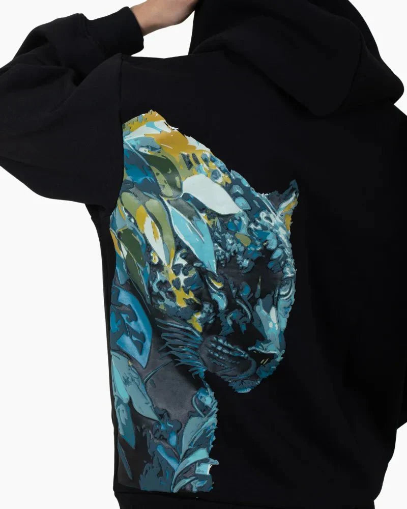 Unleash your bold side with the Leopard Blaze Hoodie, featuring a striking back print that adds a unique touch to your wardrobe.