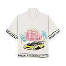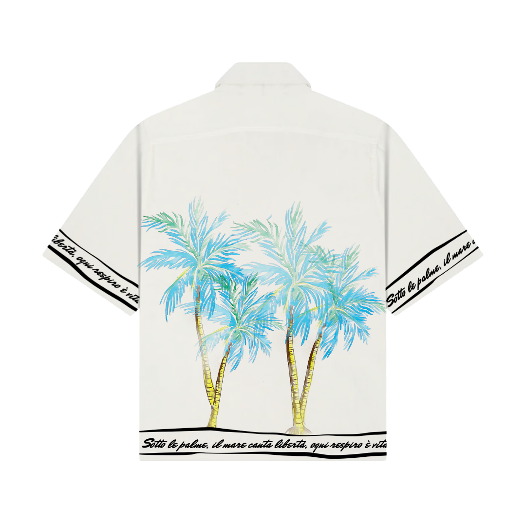 The Libertà Racer Shirt is a premium 100% polyester Cuban collar masterpiece with an oversized fit and silky hand feel, designed to transport you into vacation mode; the front boasts a dynamic racing car speeding past a luxurious hotel, symbolizing high-speed escapes, while the back features a serene palm tree backdrop paired with the evocative Italian text “Sotto le palme, il mare canta libertà, ogni respiro è vita,” capturing the essence of ocean whispers and boundless living—perfect for those ready to fly as fuck from routine to pure, breathable freedom.